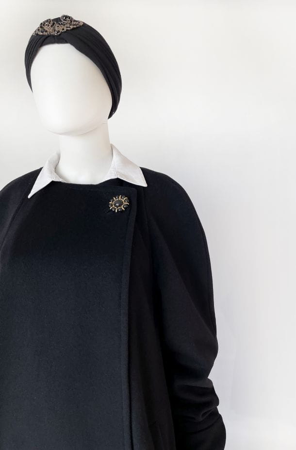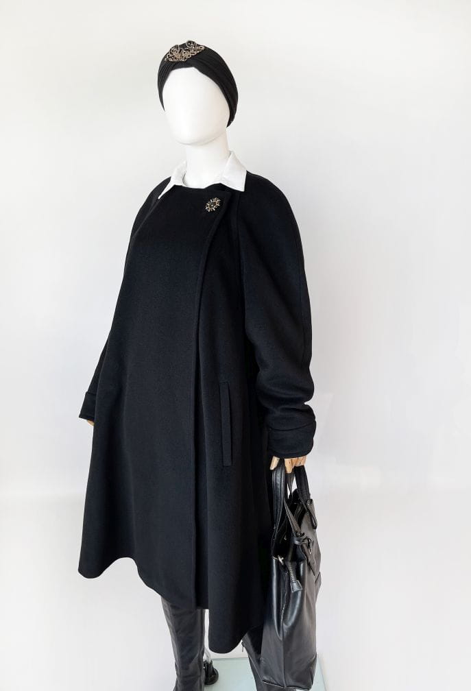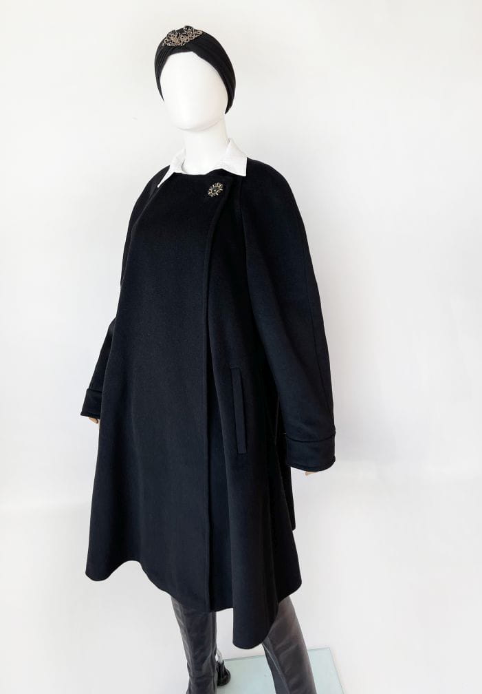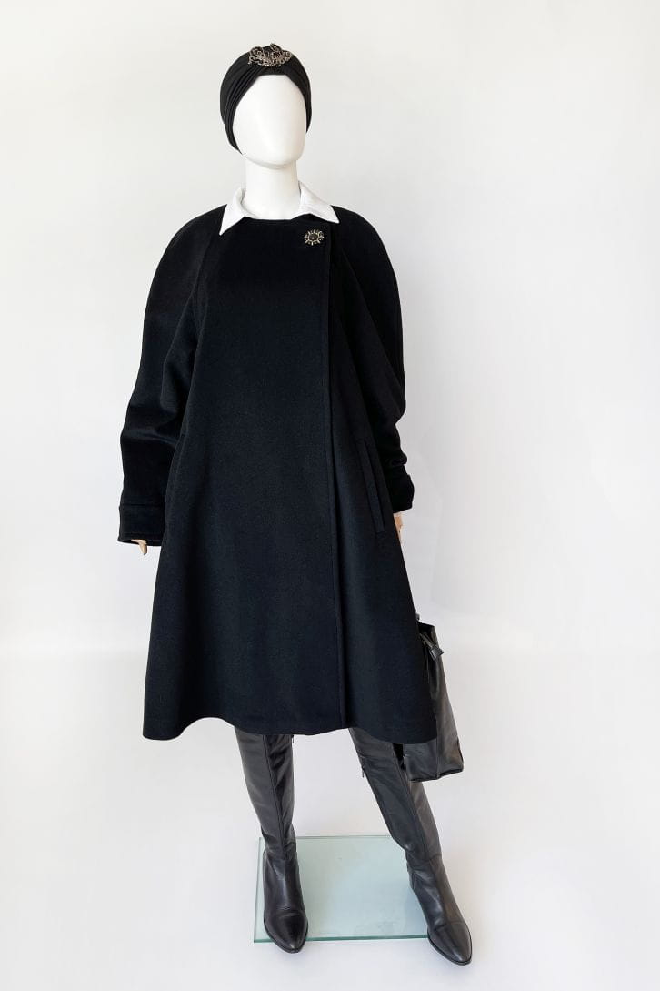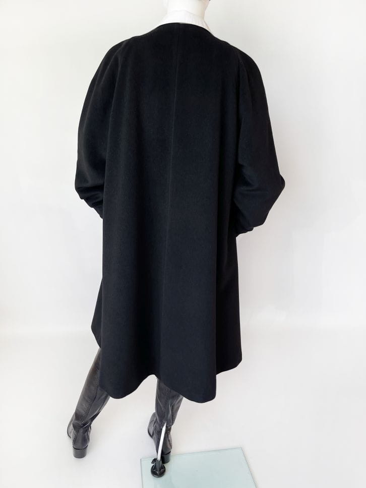 Przepiękny płaszcz vintage projektu renomowanej marki Hans Erras. Model o eleganckiej, minimalistycznej formie. Wykonany z doskonałej jakościowo miękkiej mieszanki wełny jagnięcej i angory w głębokiej czerni. Zapinany kopertowo na duży biżuteryjny guzik przy dekolcie. Rozkloszowany fason w typie peleryny, poszerza się swobodnie od pach do dołu. Długie raglanowe rękawy, u góry okrągły dekolt. Na wysokości bioder wsuwane kieszenie. Wewnątrz na podszewce.