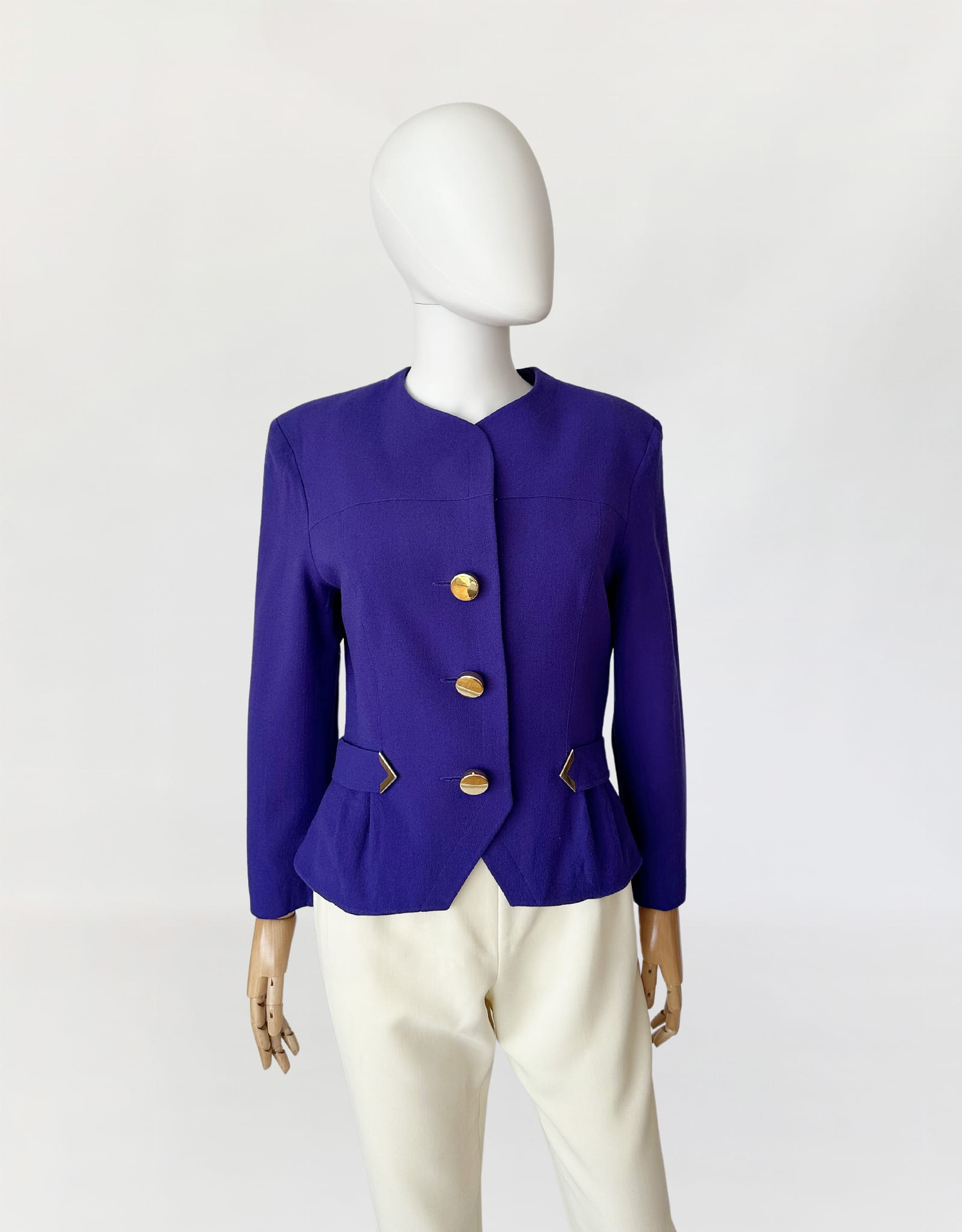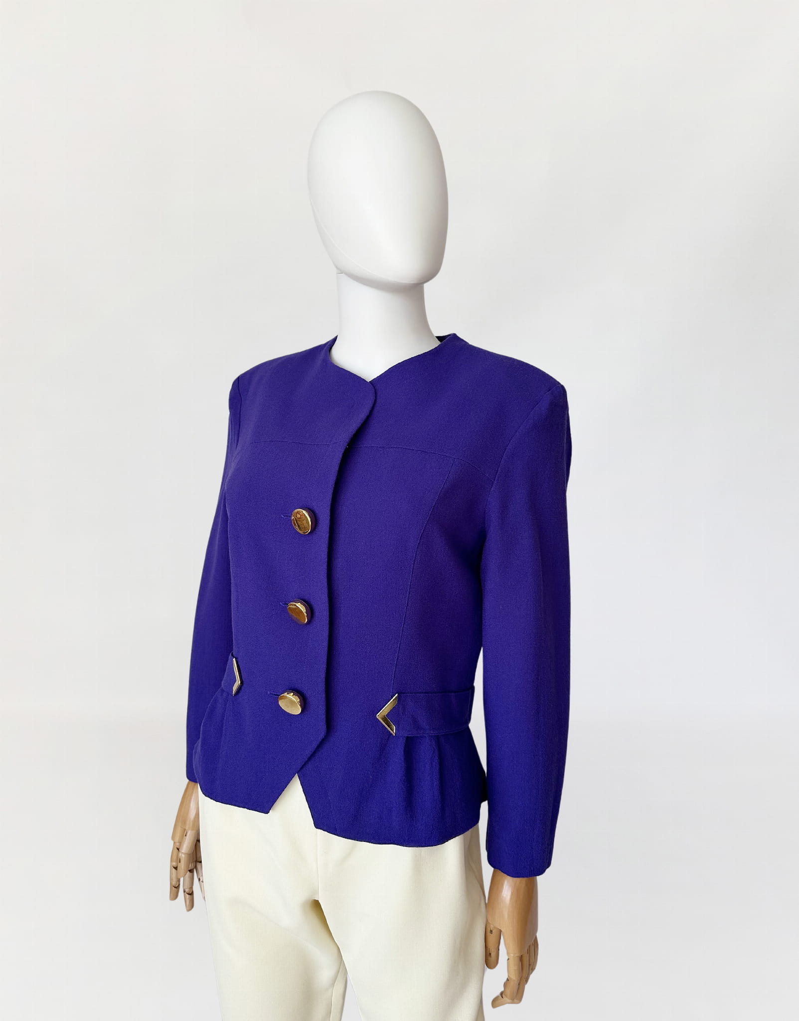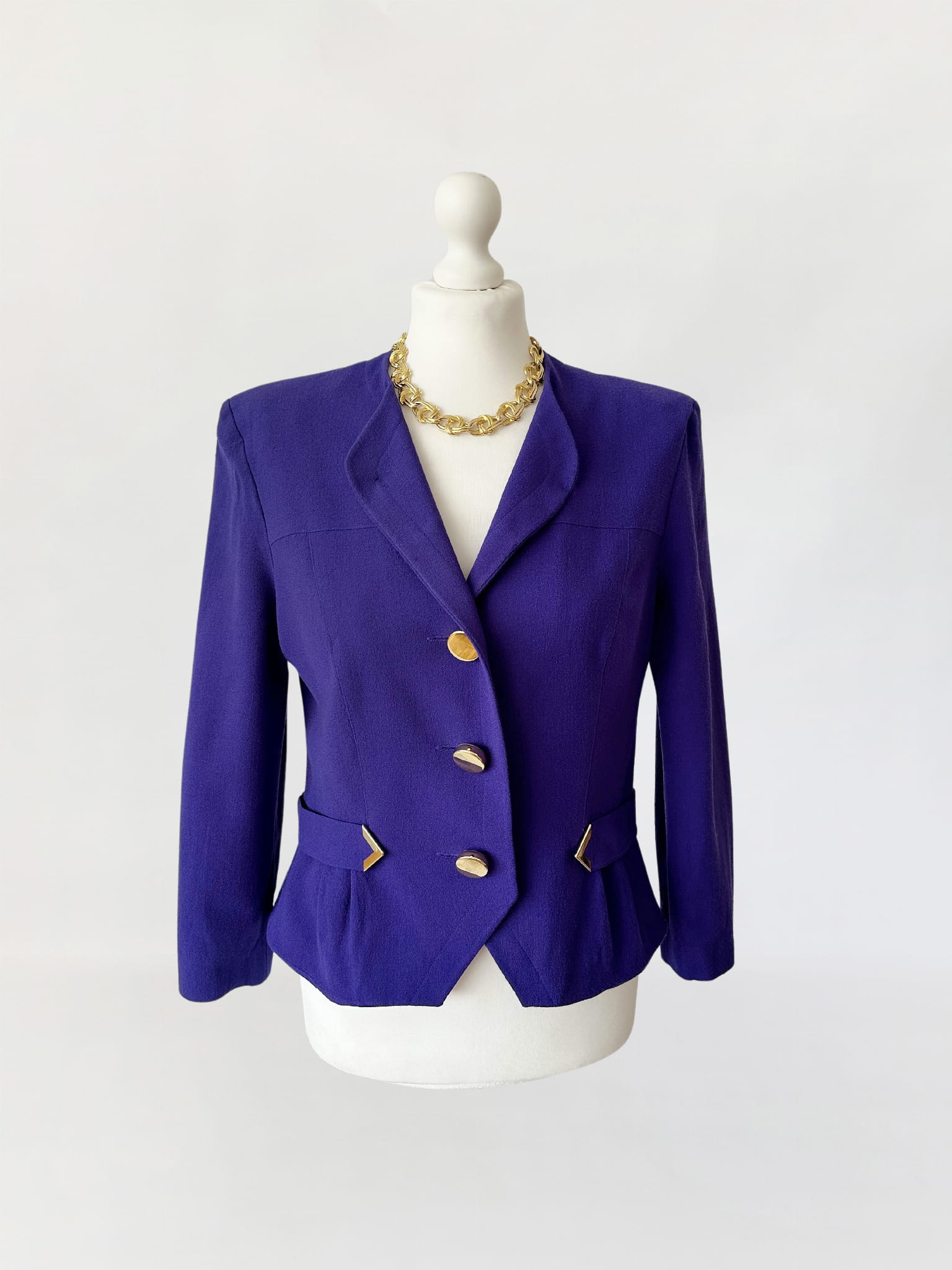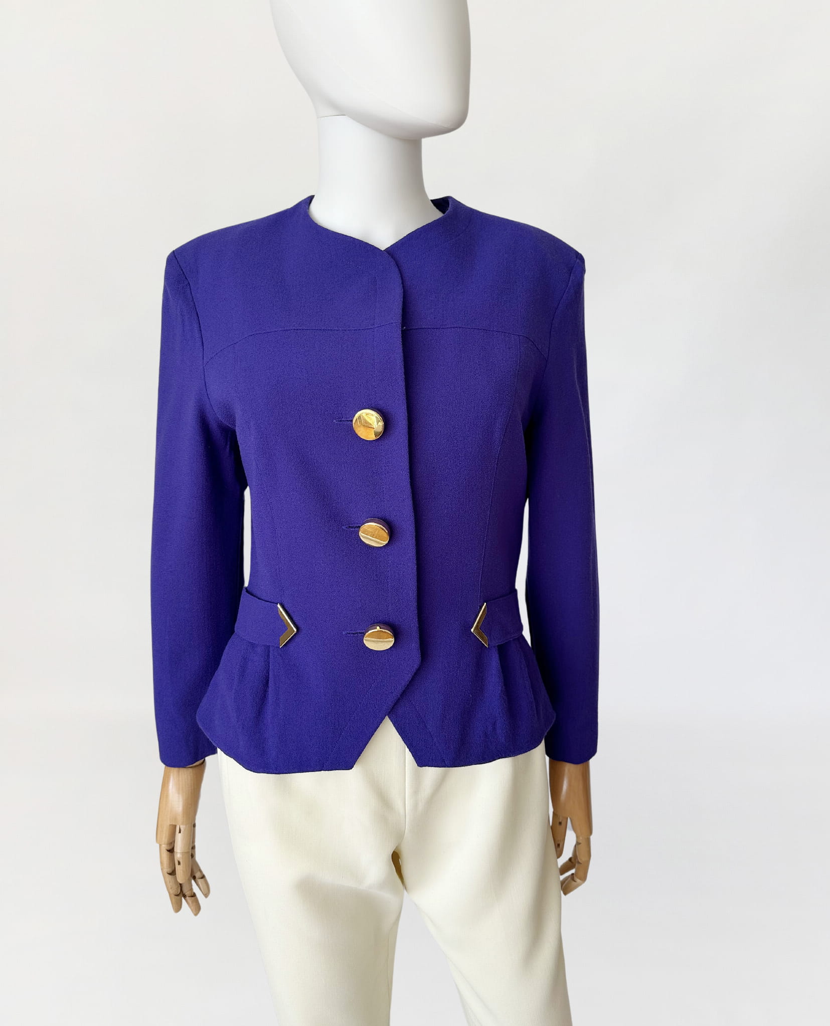 Żakiet vintage z lat 80-tych projektu marki Hero Paris. Wykonany w całości z wełnianej krepy w kolorze fioletowym, przepinany na duże złote guziki. Krótki dopasowany fason, w talii po krótkie paski. W ramionach zewnętrzne poduszki.