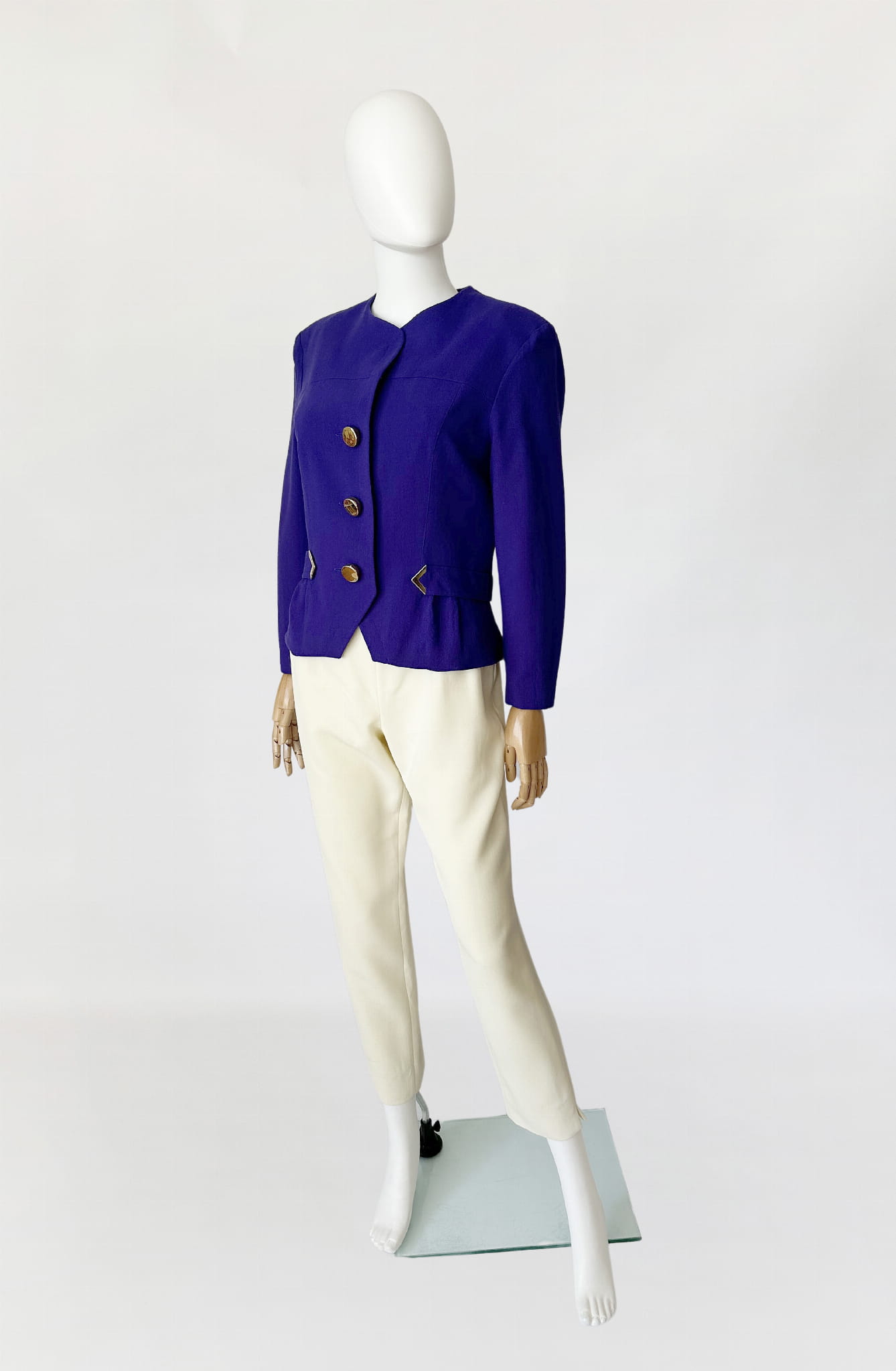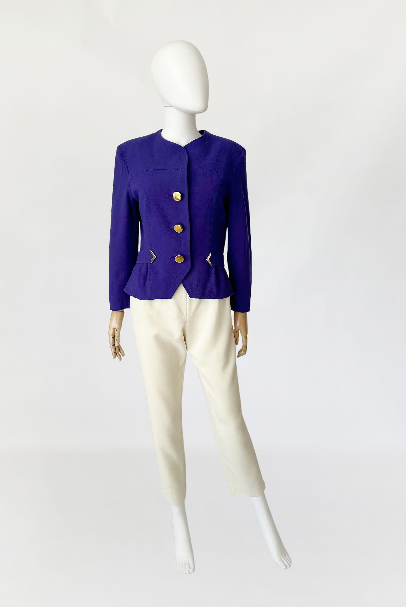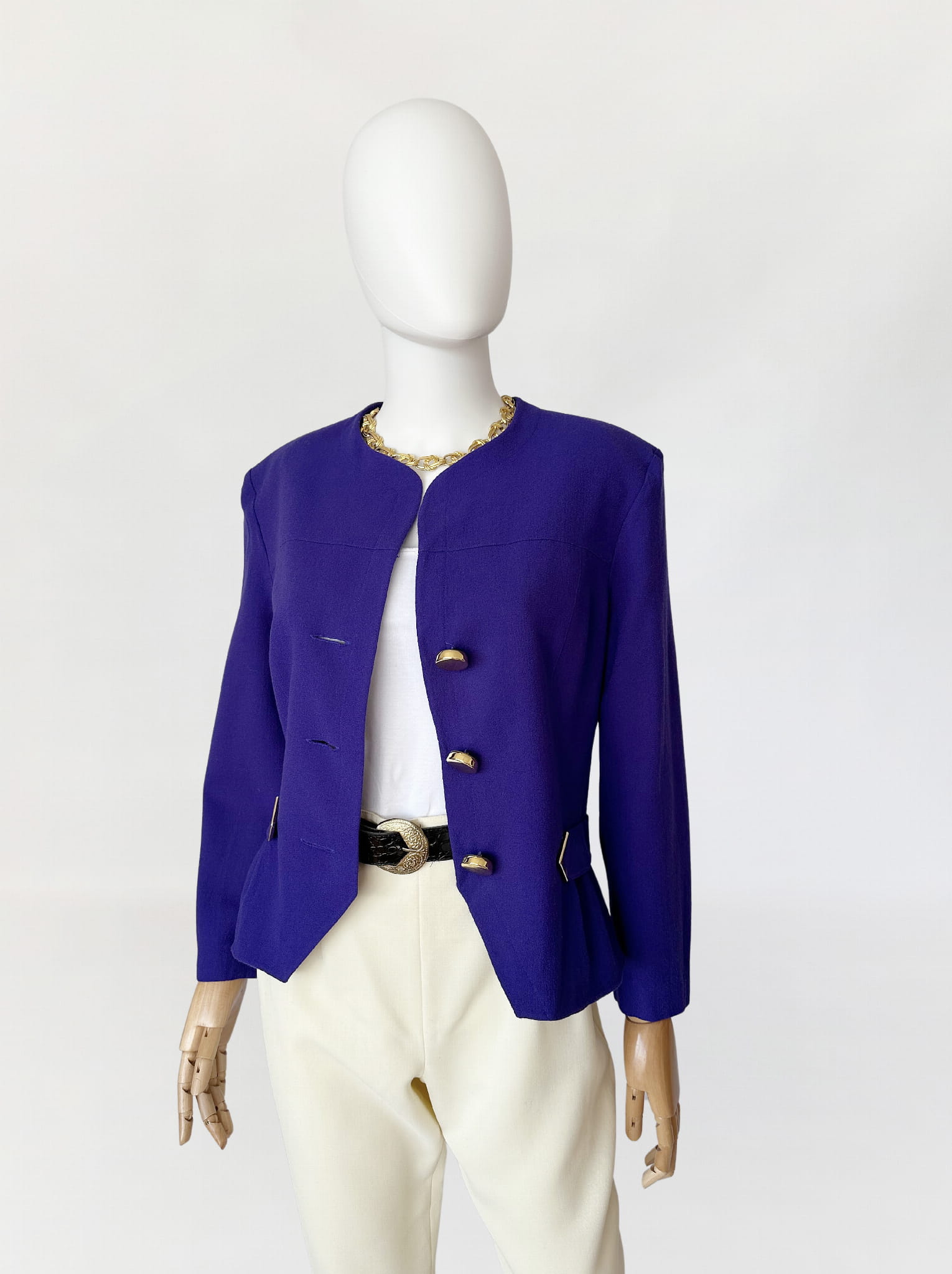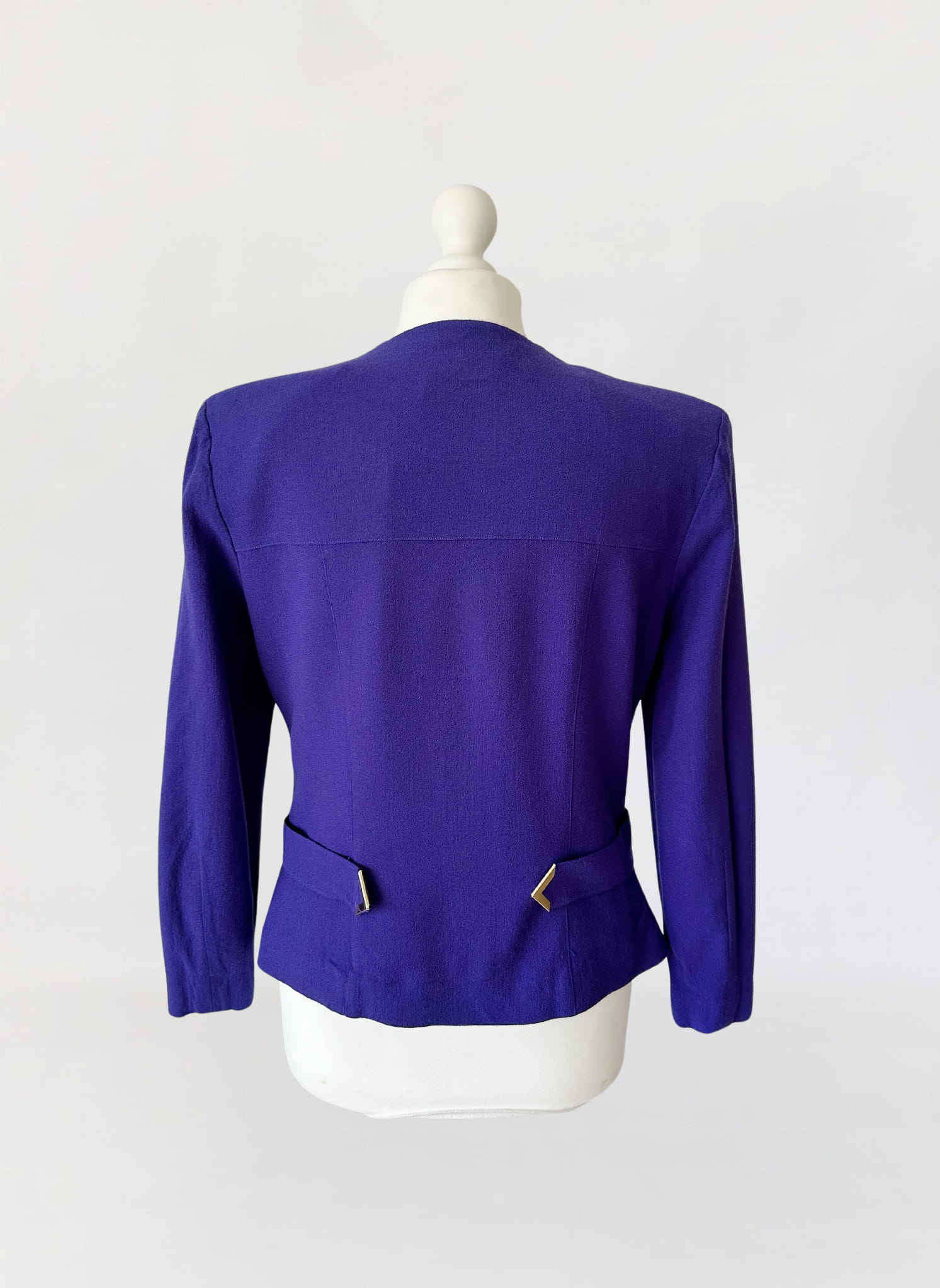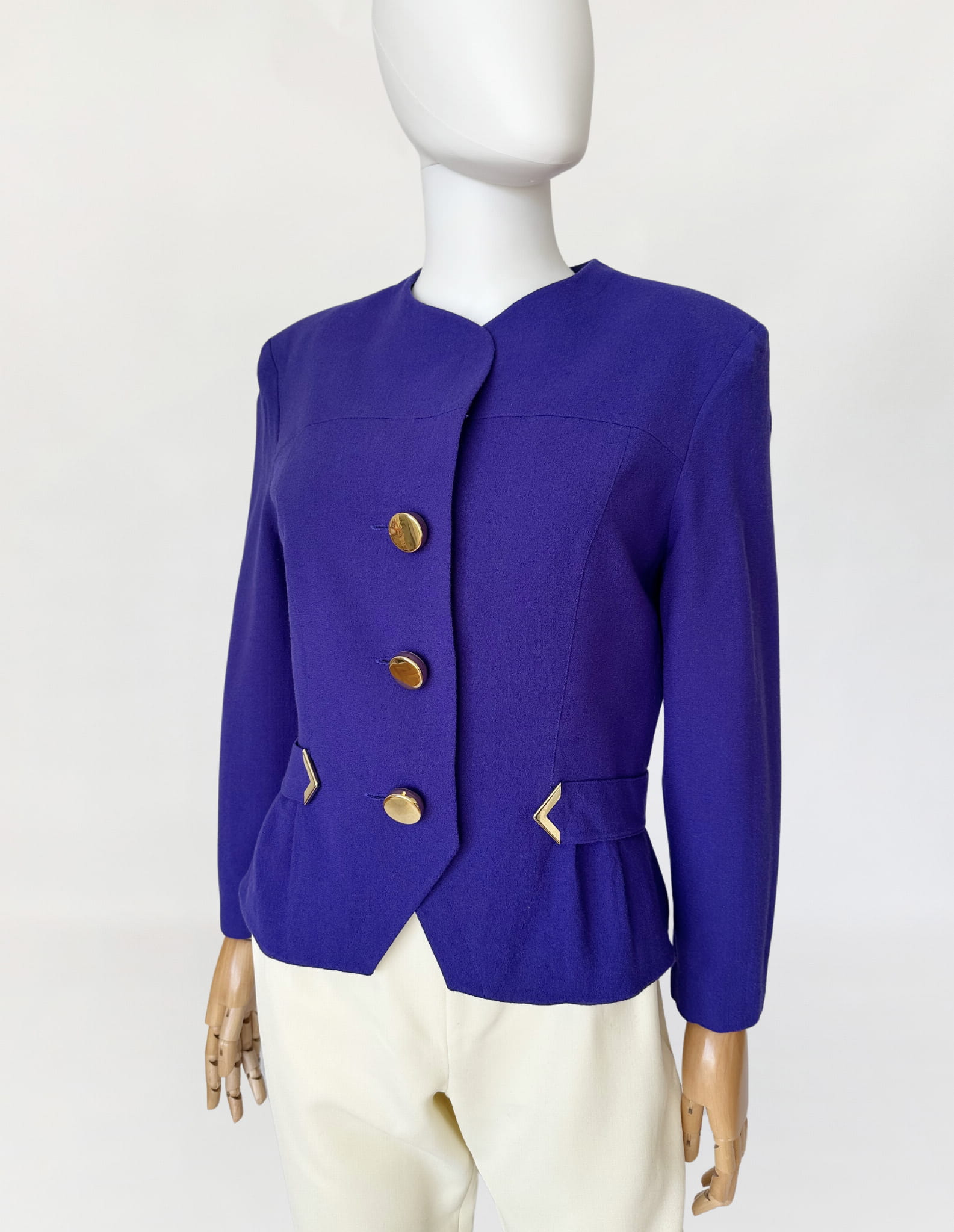 Żakiet vintage z lat 80-tych projektu marki Hero Paris. Wykonany w całości z wełnianej krepy w kolorze fioletowym, przepinany na duże złote guziki. Krótki dopasowany fason, w talii po krótkie paski. W ramionach zewnętrzne poduszki.