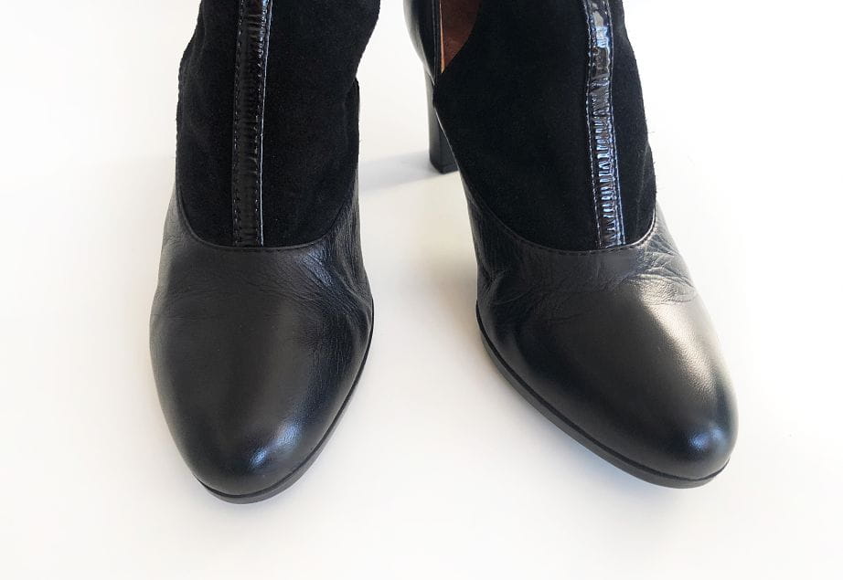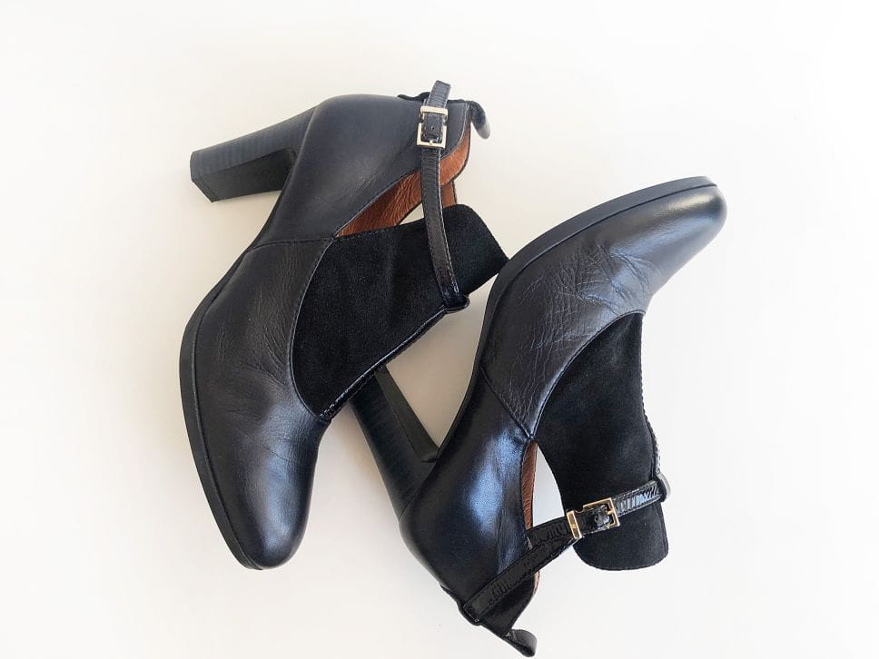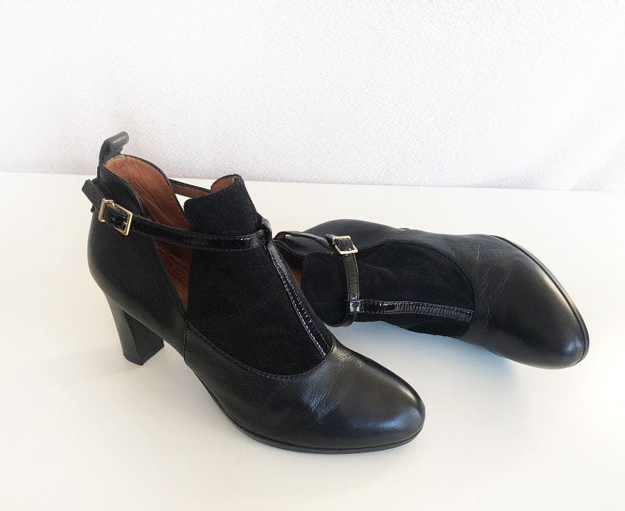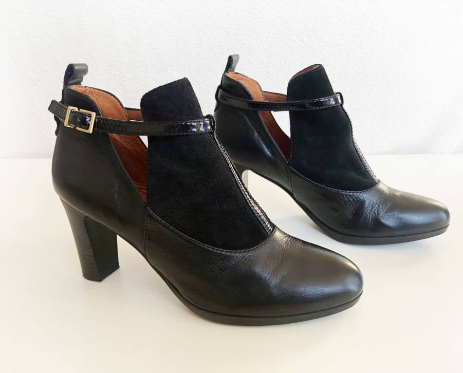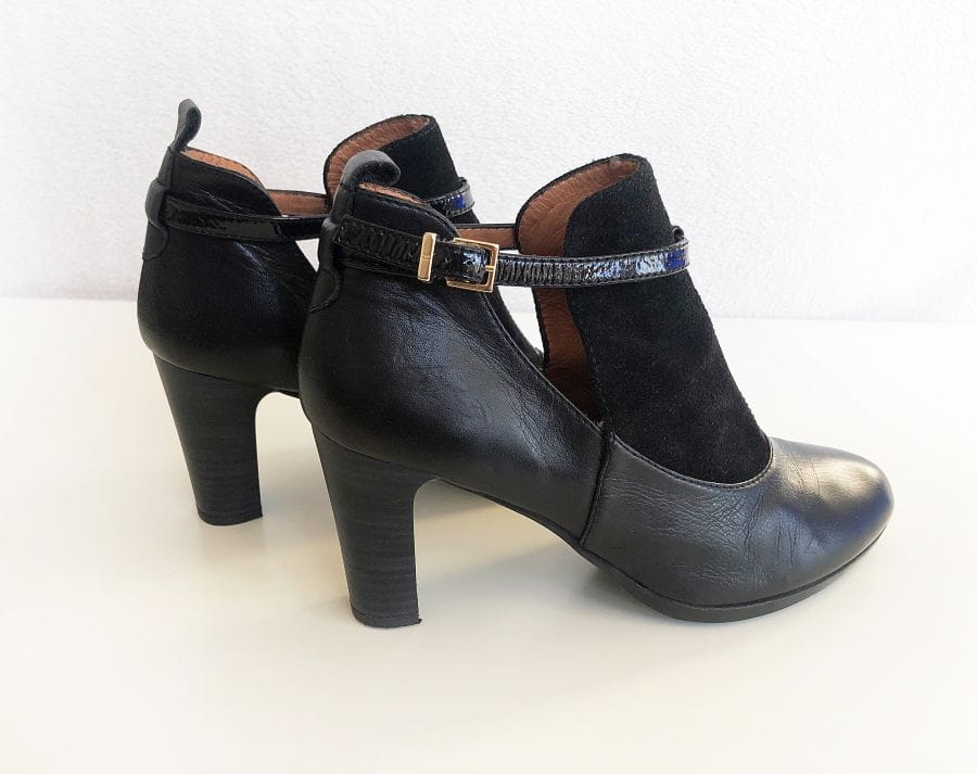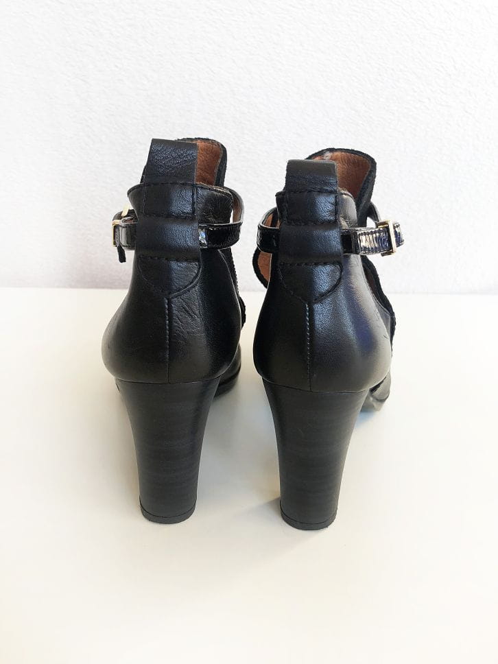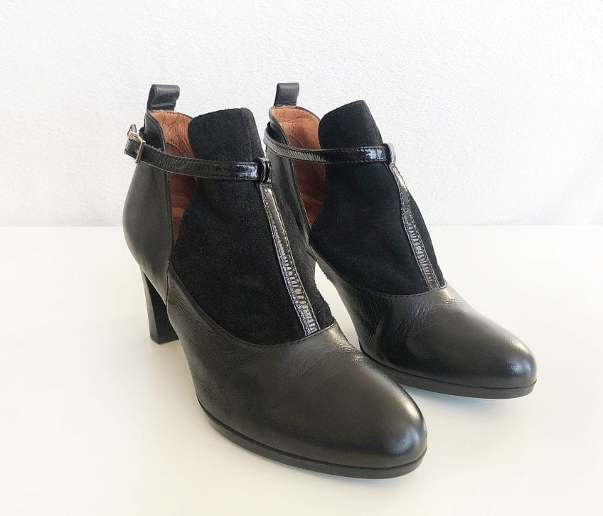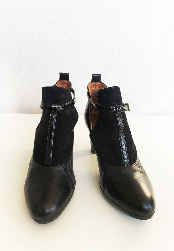 Stylowe skórzane botki renomowanej marki Hispanitas, oferującej ręcznie wykonywane obuwie wysokiej jakości. Genialnie zrobione, z dbałością o każdy szczegół. Świetny design, wykonane z czarnej skóry połączonej z zamszem. Po bokach wycięcia. Zapinane na pasek z logowaną klamerką. Stabilny szeroki obcas, dobrze wyprofilowane. Noski migdałowe.