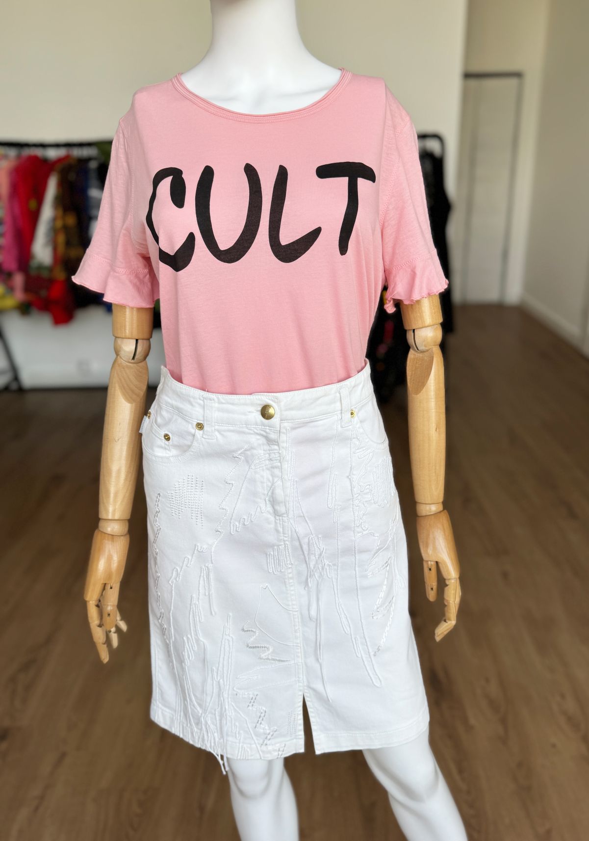 Spódnica vintage Y2K marki Iceberg, wykonana z lekkiego białego denimu. Po bokach płócienne lampasy wszyte w szwy boczne. Front i tylne panele częściowo zdobione aplikacjami z jasnych materiałowych sznurków. Standardowy układ pięciokieszeniowy. Z przodu krótki rozporek. Metalowe nity w kolorze złota, sygnowane. Z tyłu naszywka z nazwą linii i marki.