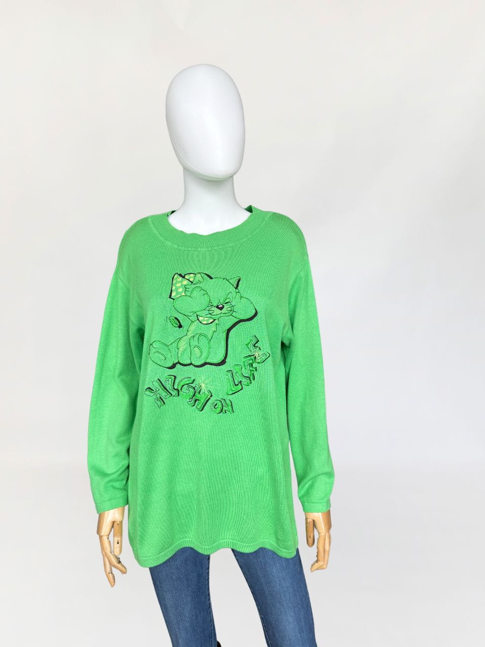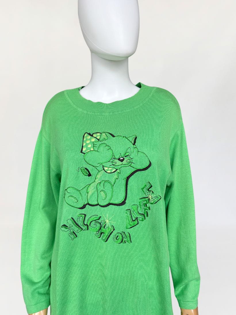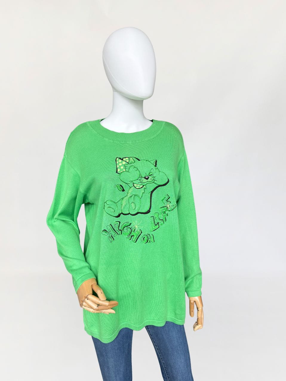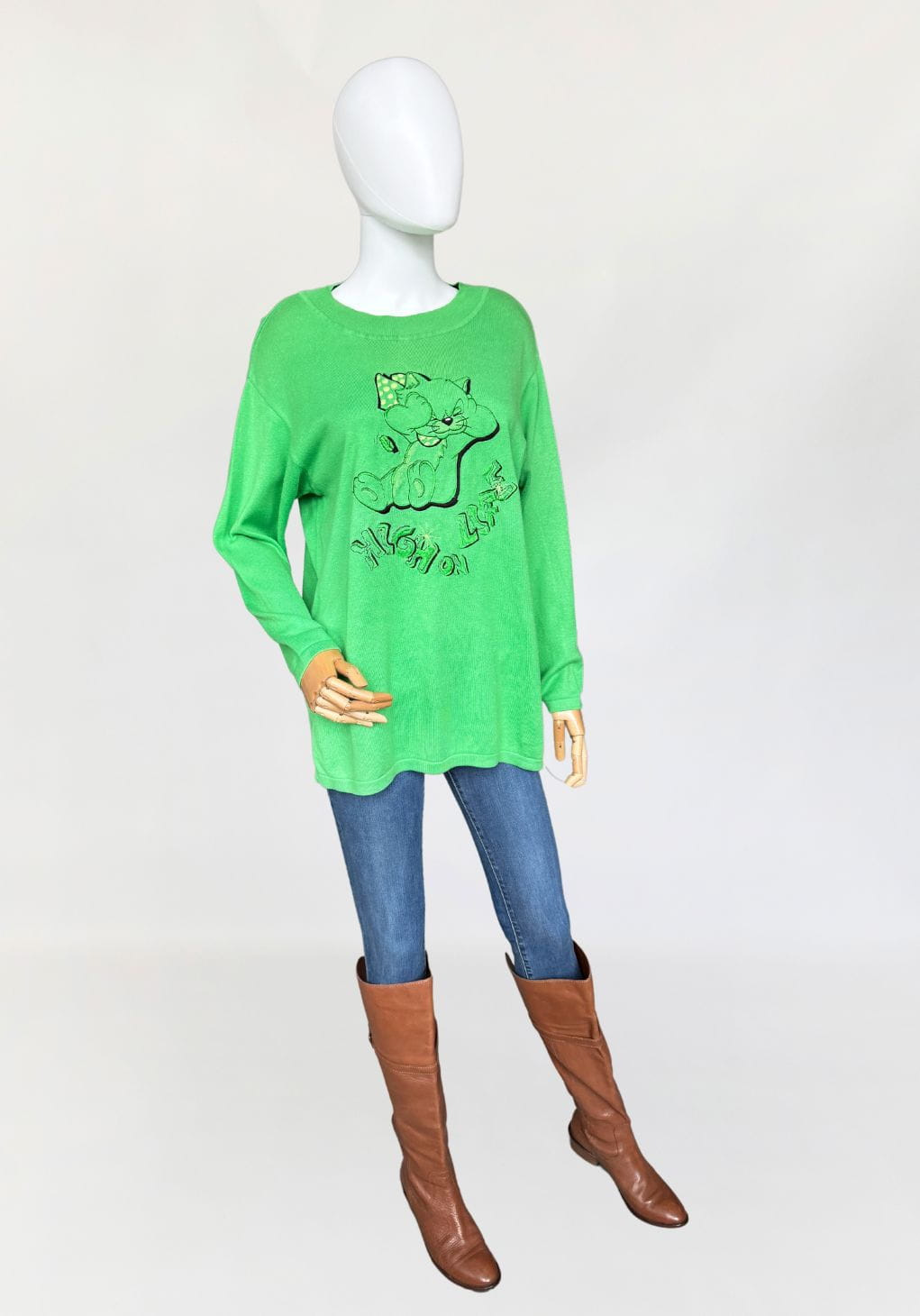 Casual'owy sweter vintage z lat 90-tych kultowej włoskiej marki Iceberg. Wykonany z lekkiej, wiskozowo-bawełnianej, elastycznej dzianiny w kolorze zielonym. Front zdobiony wyszywaną animowaną aplikacją.