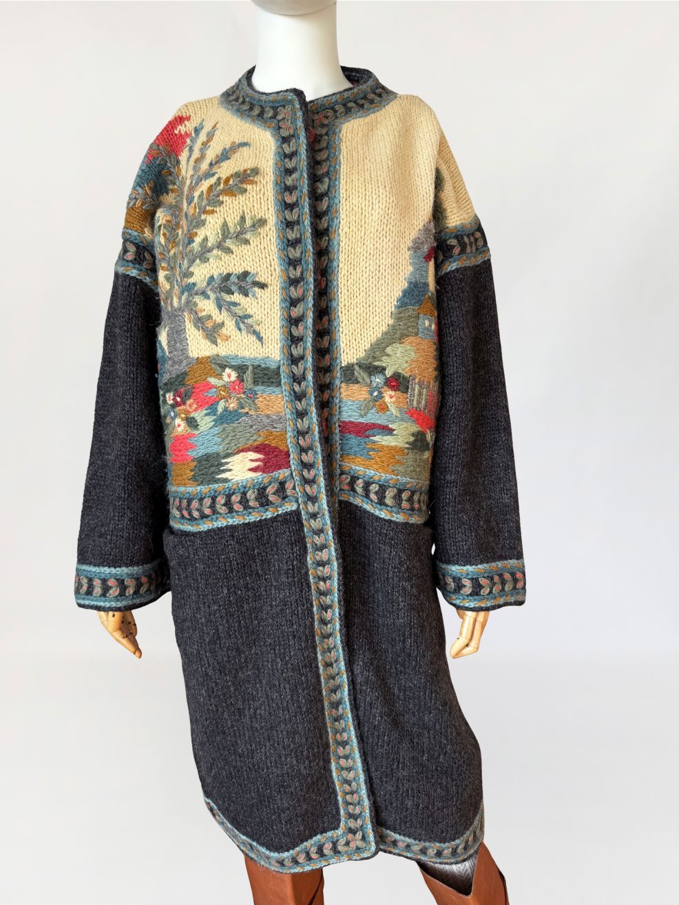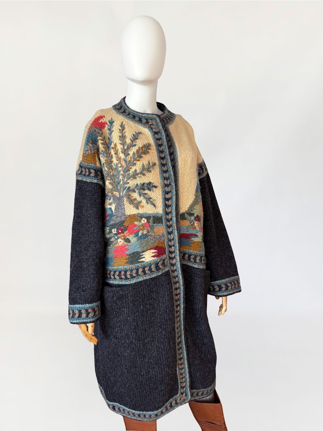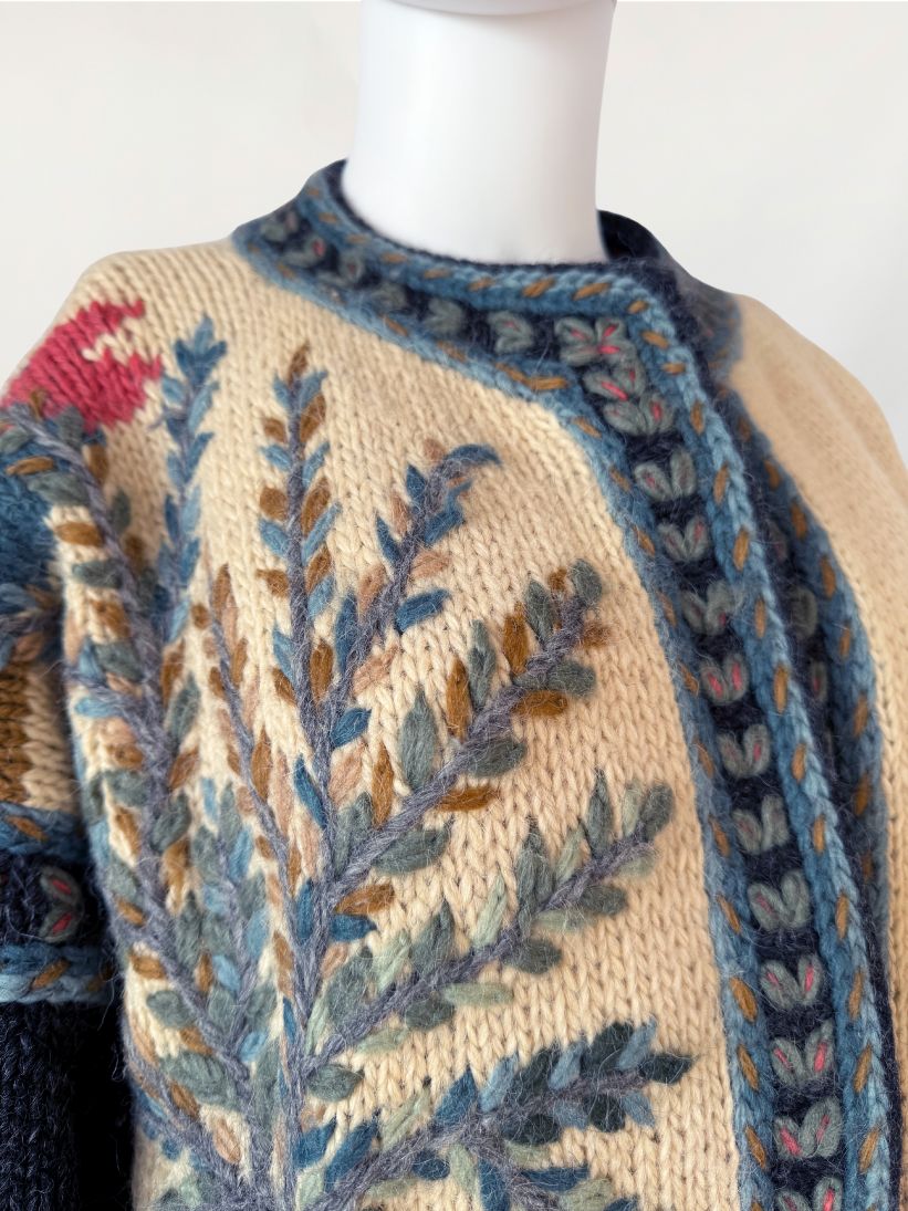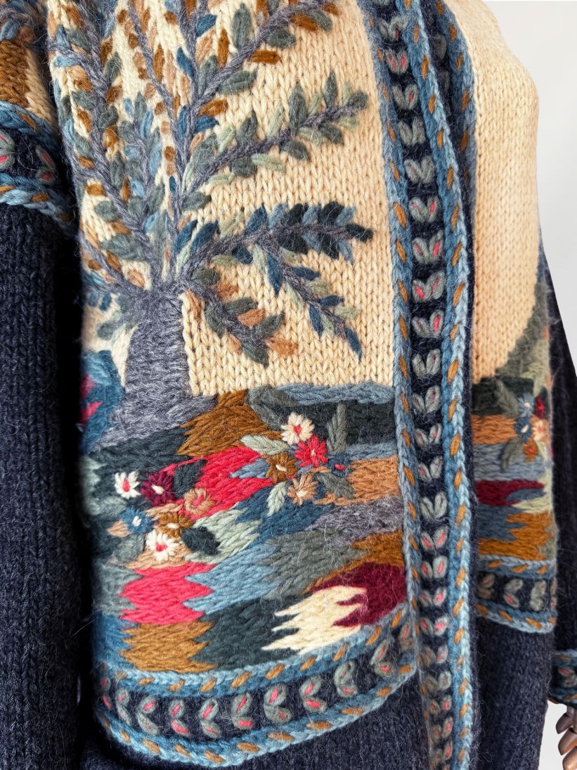 Długi, cięższy sweter w formie płaszcza, wykonany ręcznie w całości z naturalnej wełny. Model z włoskiej monofaktury Icelandia. Konstrukcja oparta na grubym, zwartym splocie, fason prosty, swobodny, o długości za kolano, z obniżoną linią ramion i długimi rękawami. Korpus zdobiony rozbudowanymi motywami pejzażowo-roślinnymi, z widocznym rysunkiem drzew, zabudowy i detali florystycznych. Kolorystyka oparta na odcieniach ciepłego beżu, grafitu, przygaszonego błękitu, oliwkowej zieleni, rdzawej czerwieni i złamanych brązów. Dekolt okrągły, wykończony szeroką, dekoracyjną listwą. Front zapinany na kryte guziki, z dodatkowym zapięciem pod szyją. Rękawy i dół wykończone pasami o powtarzalnym wzorze strukturalnym. Na wysokości bioder naszywane kieszenie. Tył w całości dekorowany, z centralnie umieszczonym motywem drzewa.