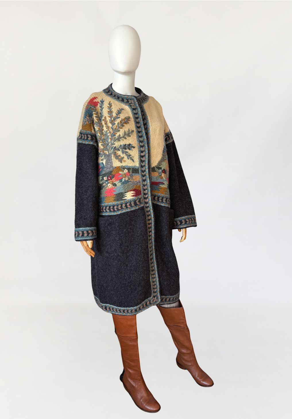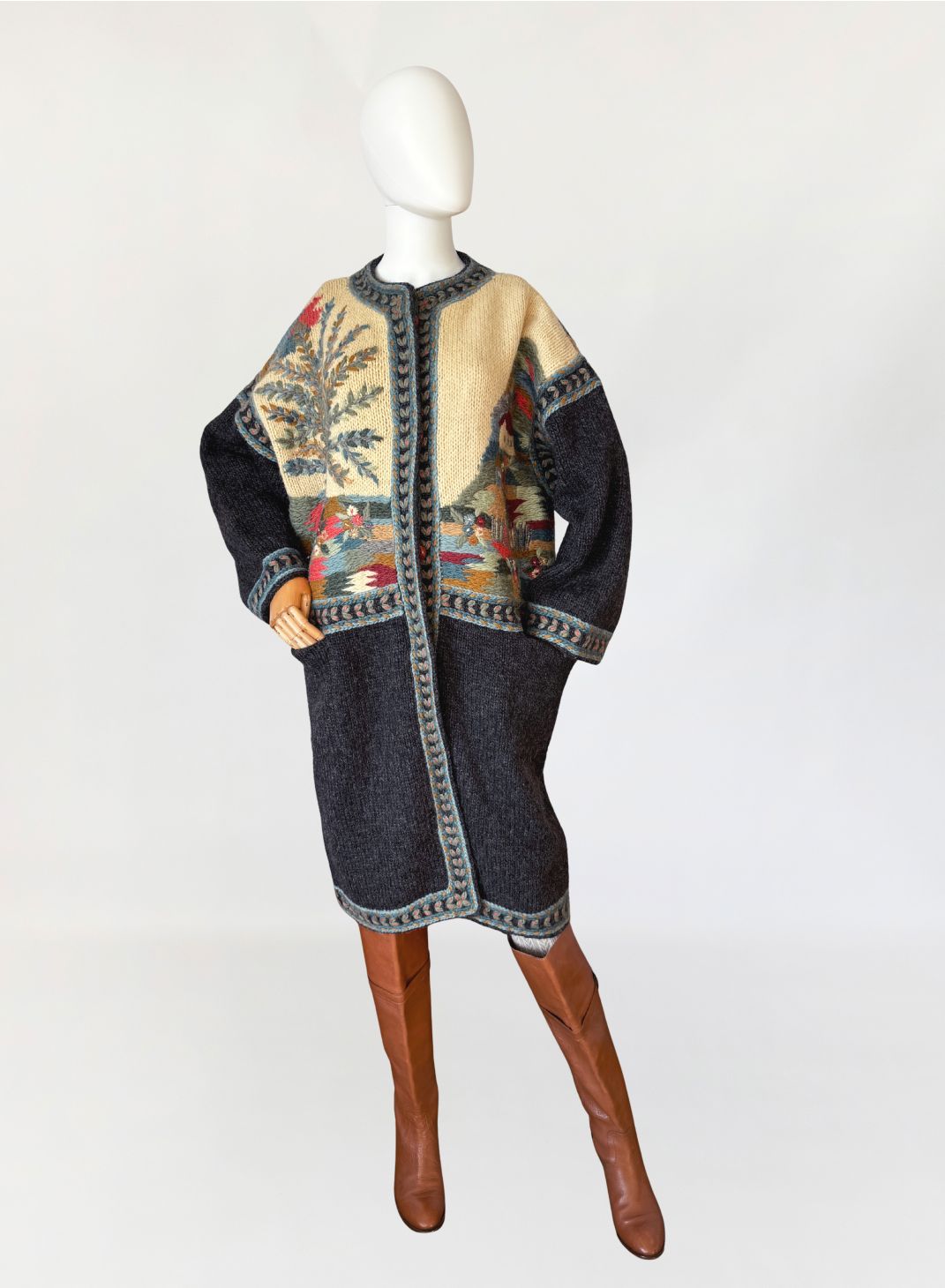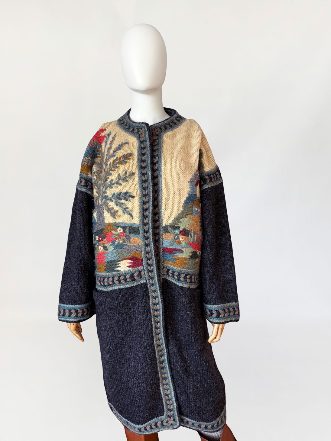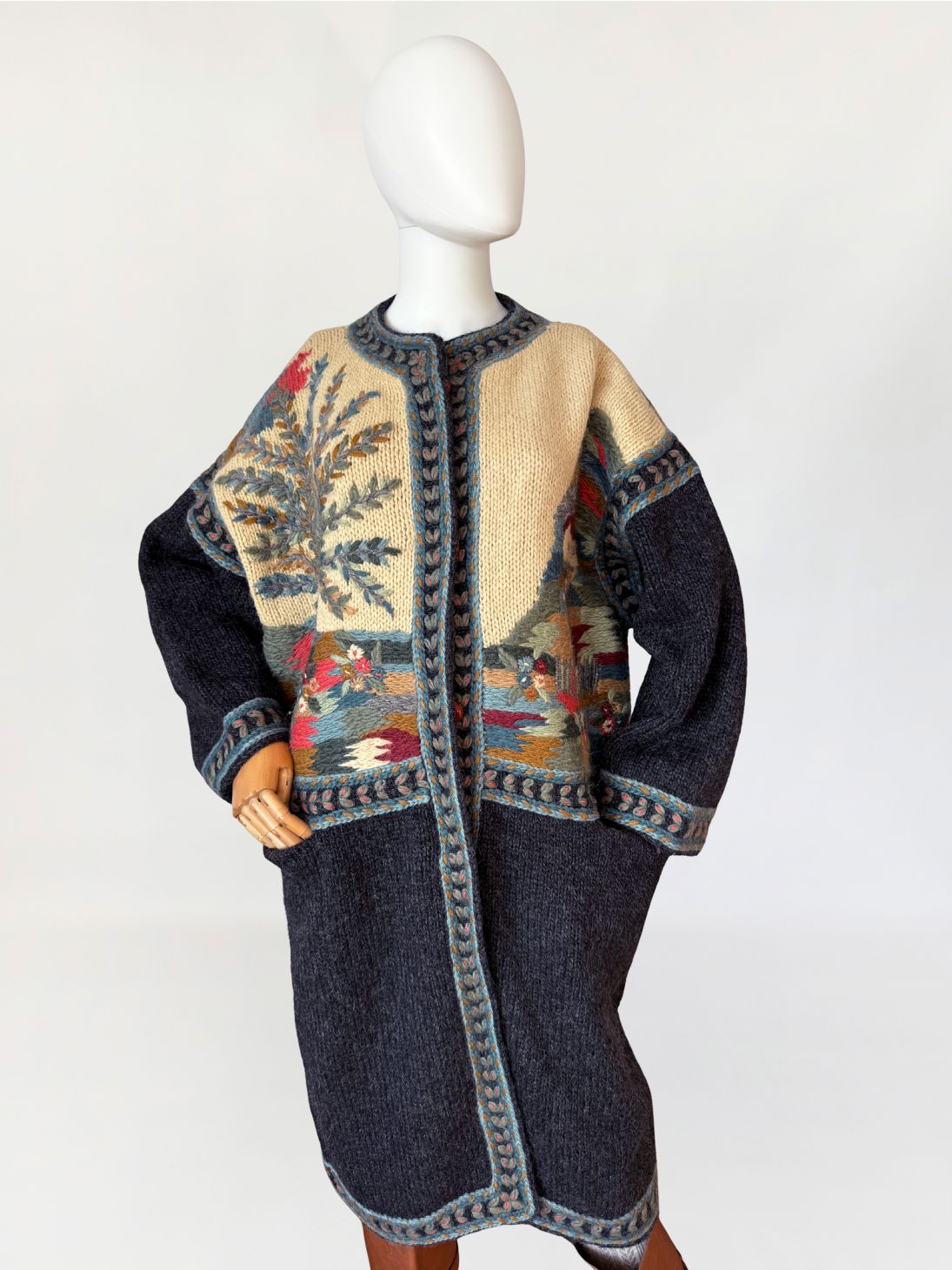 Długi, cięższy sweter w formie płaszcza, wykonany ręcznie w całości z naturalnej wełny. Model z włoskiej monofaktury Icelandia. Konstrukcja oparta na grubym, zwartym splocie, fason prosty, swobodny, o długości za kolano, z obniżoną linią ramion i długimi rękawami. Korpus zdobiony rozbudowanymi motywami pejzażowo-roślinnymi, z widocznym rysunkiem drzew, zabudowy i detali florystycznych. Kolorystyka oparta na odcieniach ciepłego beżu, grafitu, przygaszonego błękitu, oliwkowej zieleni, rdzawej czerwieni i złamanych brązów. Dekolt okrągły, wykończony szeroką, dekoracyjną listwą. Front zapinany na kryte guziki, z dodatkowym zapięciem pod szyją. Rękawy i dół wykończone pasami o powtarzalnym wzorze strukturalnym. Na wysokości bioder naszywane kieszenie. Tył w całości dekorowany, z centralnie umieszczonym motywem drzewa.