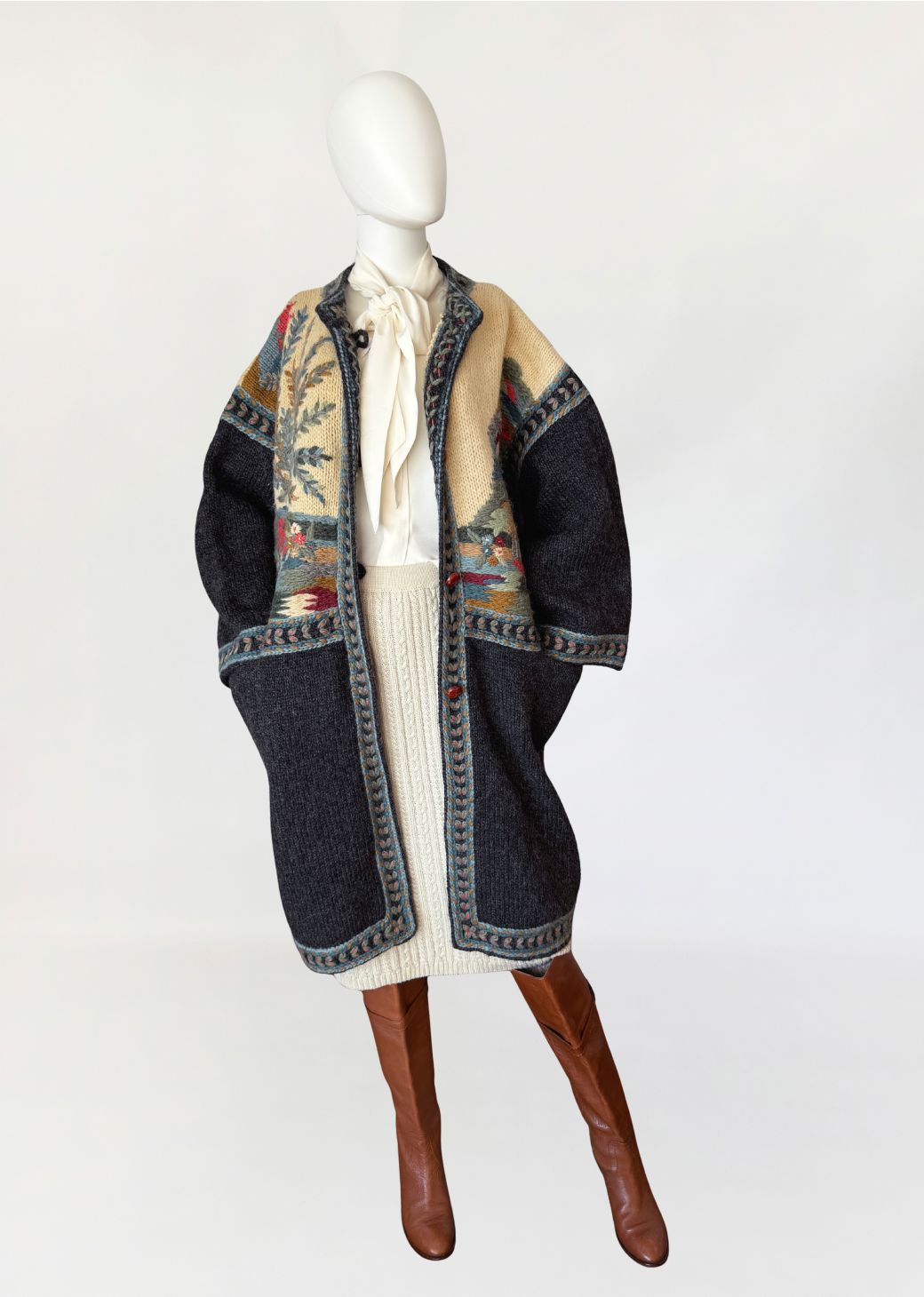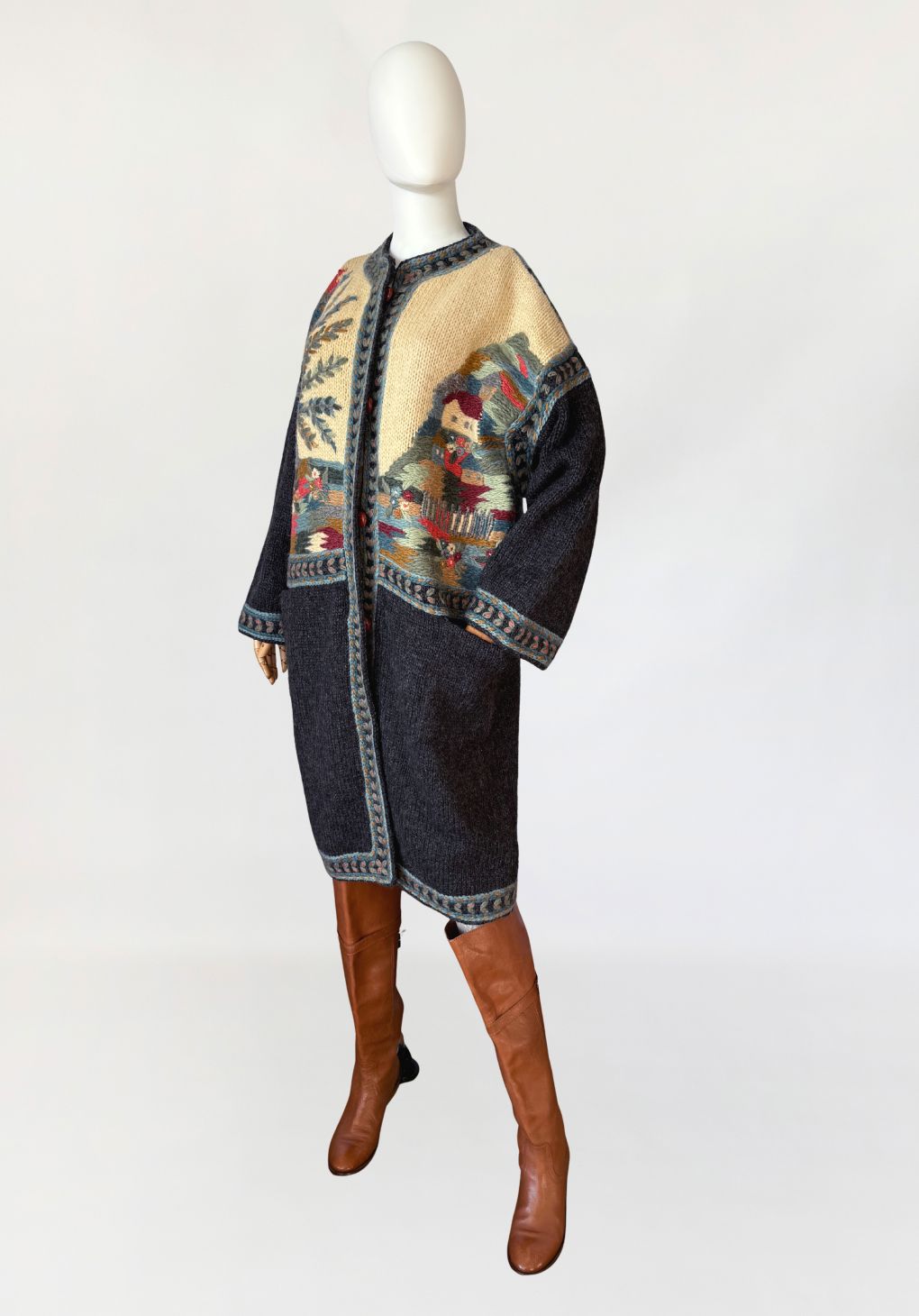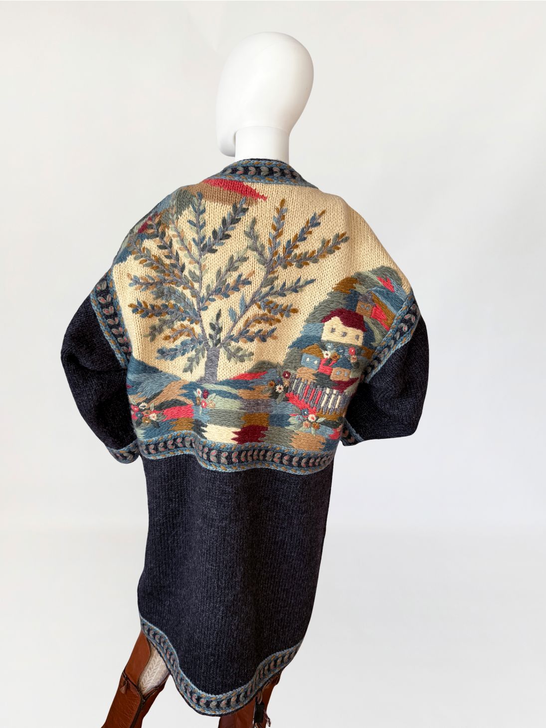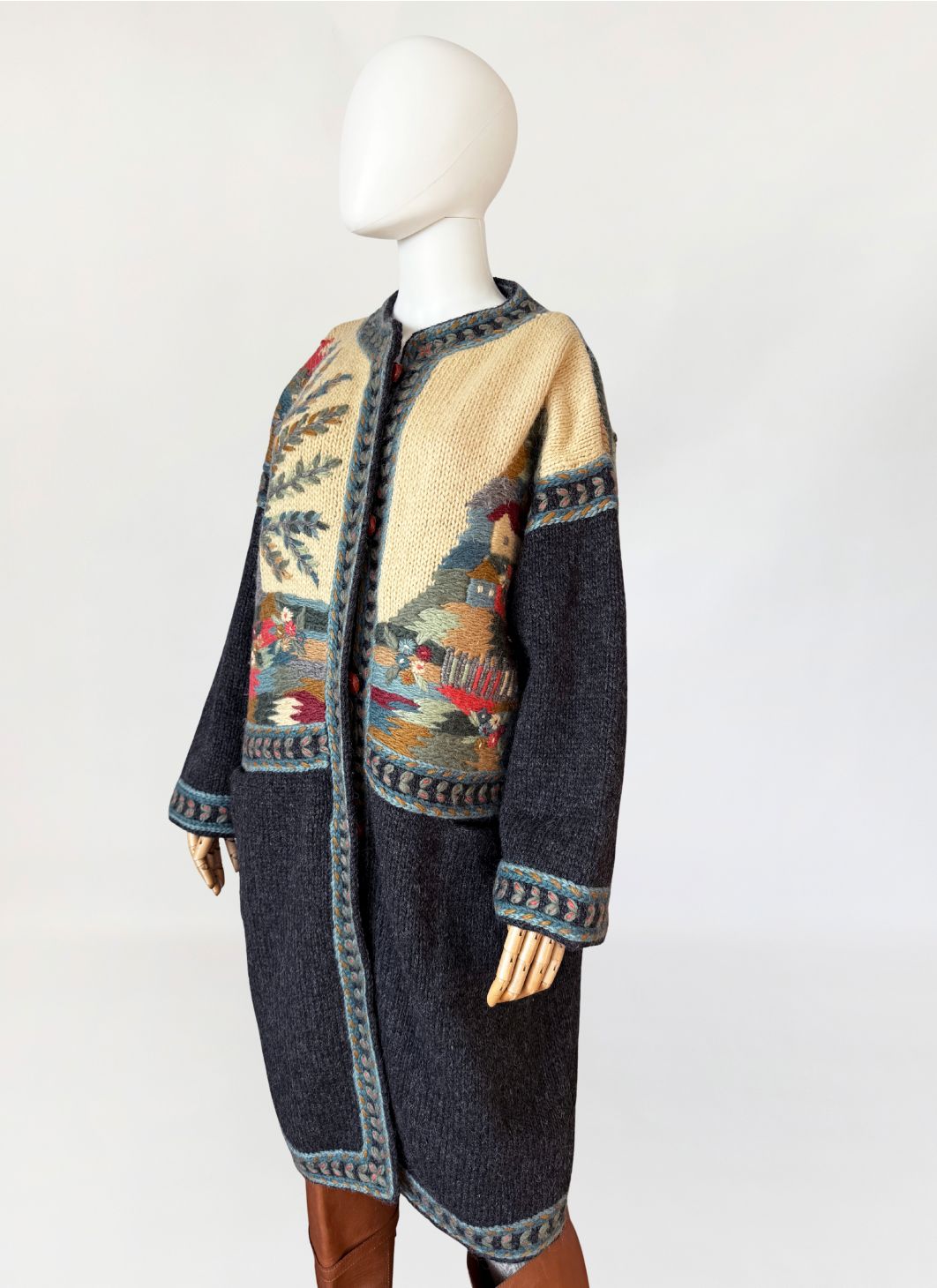 Długi, cięższy sweter w formie płaszcza, wykonany ręcznie w całości z naturalnej wełny. Model z włoskiej monofaktury Icelandia. Konstrukcja oparta na grubym, zwartym splocie, fason prosty, swobodny, o długości za kolano, z obniżoną linią ramion i długimi rękawami. Korpus zdobiony rozbudowanymi motywami pejzażowo-roślinnymi, z widocznym rysunkiem drzew, zabudowy i detali florystycznych. Kolorystyka oparta na odcieniach ciepłego beżu, grafitu, przygaszonego błękitu, oliwkowej zieleni, rdzawej czerwieni i złamanych brązów. Dekolt okrągły, wykończony szeroką, dekoracyjną listwą. Front zapinany na kryte guziki, z dodatkowym zapięciem pod szyją. Rękawy i dół wykończone pasami o powtarzalnym wzorze strukturalnym. Na wysokości bioder naszywane kieszenie. Tył w całości dekorowany, z centralnie umieszczonym motywem drzewa.