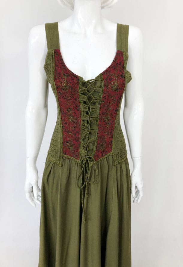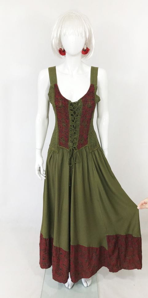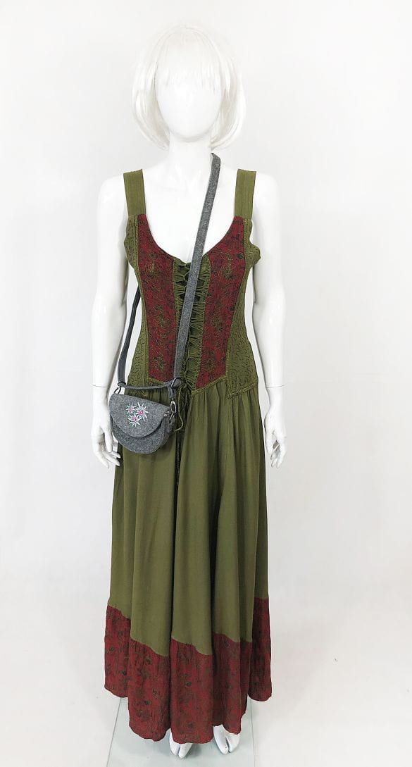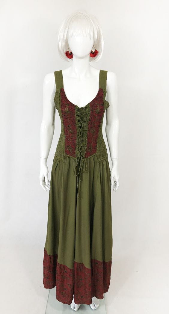 Indyjska haftowana maxi sukienka vintage. Góra na ramiączkach, z dekoracyjnym wiązaniem i haftowanymi aplikacjami. Dół mocno rozłożysty. Model bez podszewki.