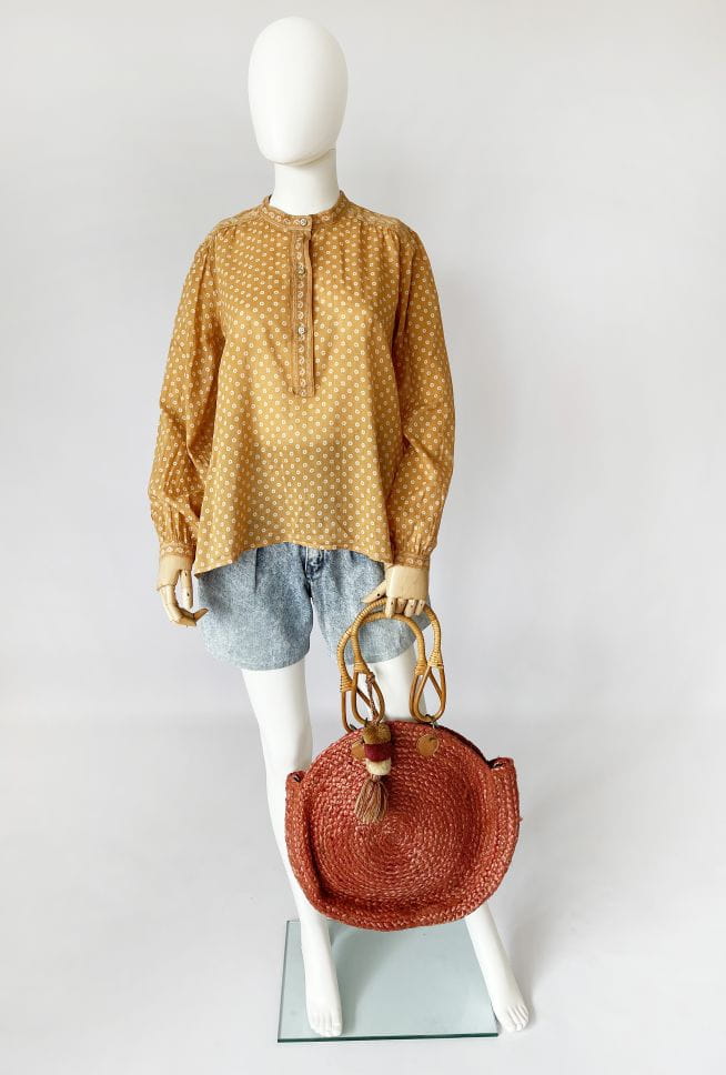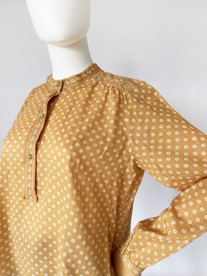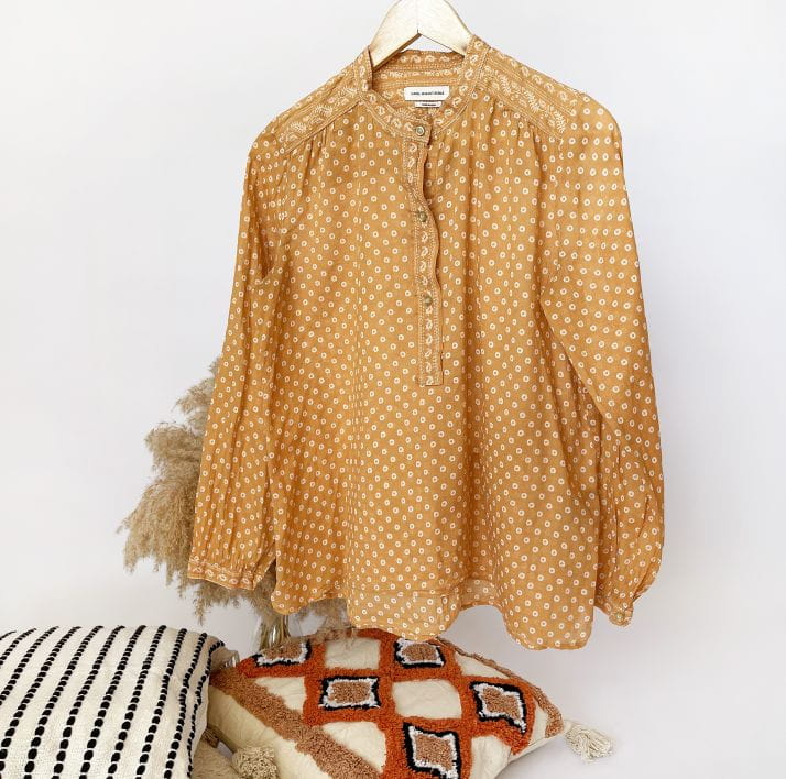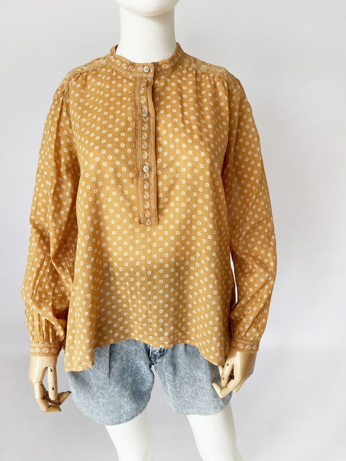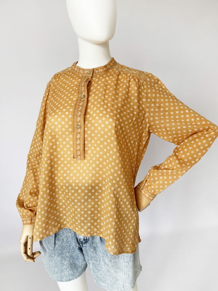 Oryginalna bluzka Isabel Marant Etoile. Model w stylu boho, uszyty z lekkiej bawełnianej tkaniny w musztardowym odcieniu. Na całości drobne wzory. Luźny fason, u góry rozpinana, bez kołnierzyka. Długie luźne rękawy zapinane na nadgarstkach.