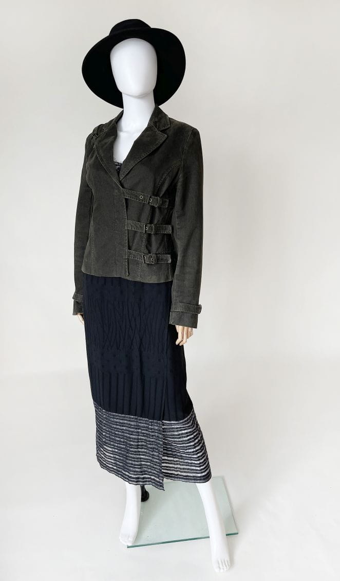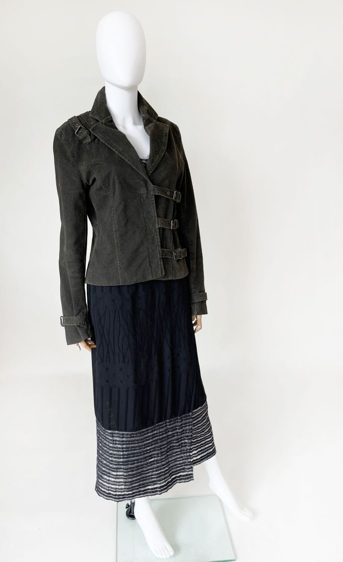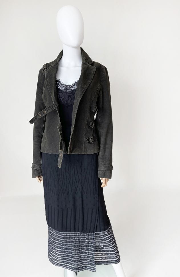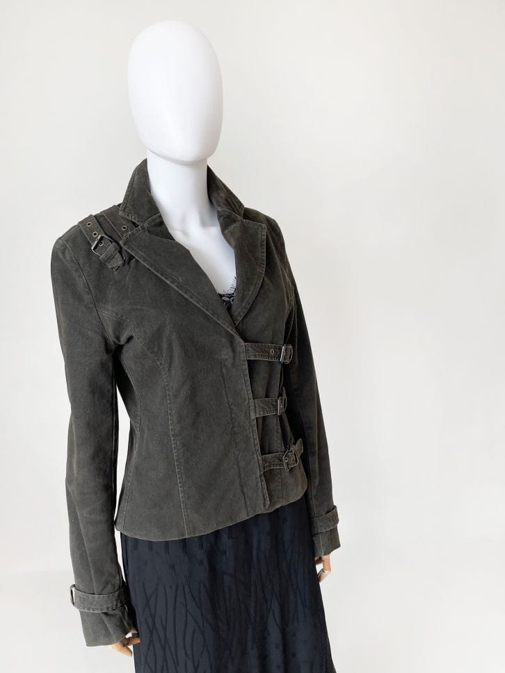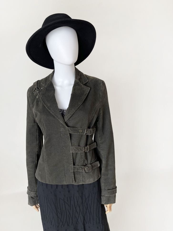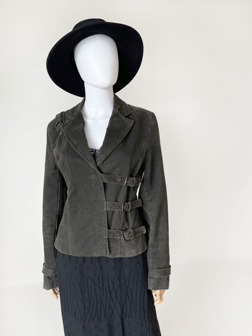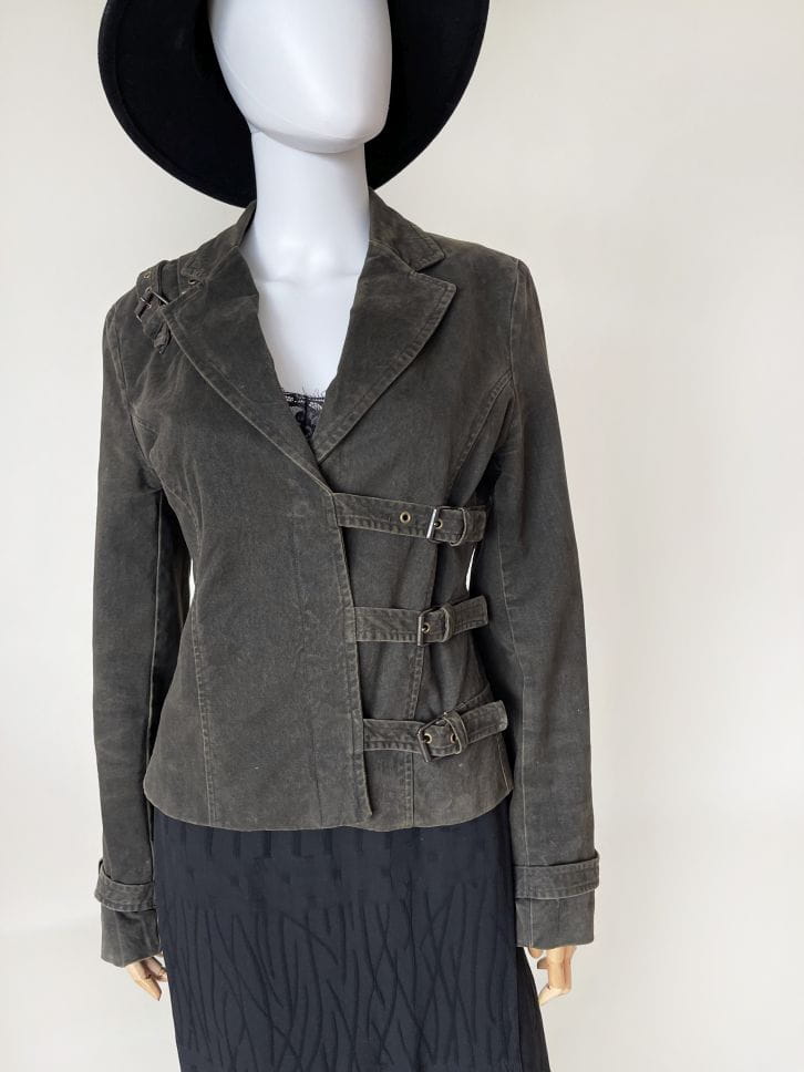 Lekka kurtka katalońskiej projektantki Isabel de Pedro. Wykonana z bawełnianej tkaniny o lekko cieniowanym deseniu. Zapięcie w formie równoległych regulowanych pasków z metalowymi klamrami. Na jednym z ramion paski pełnią także funkcję dekoracyjną. Fajna, niebanalna rzecz i świetna alternatywa dla tradycyjnej kurtki jeansowej.