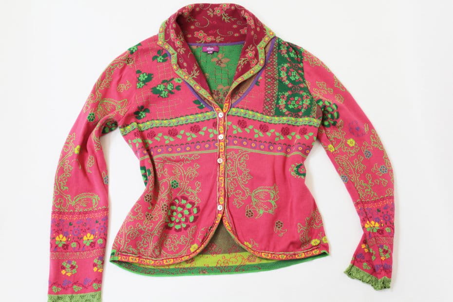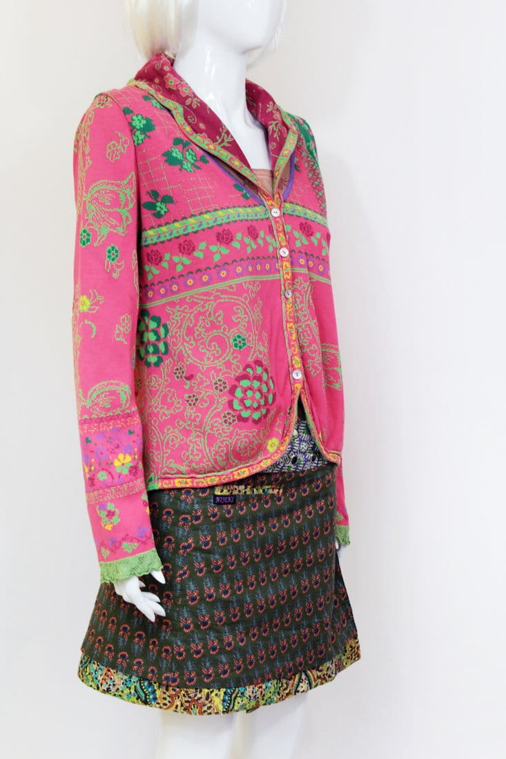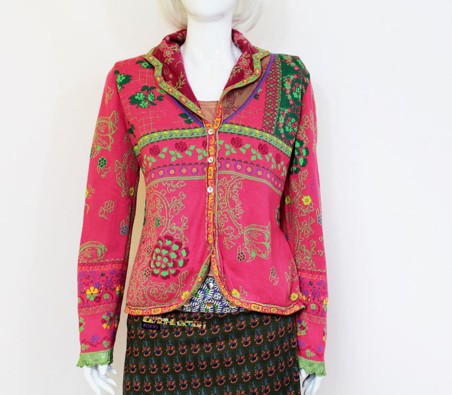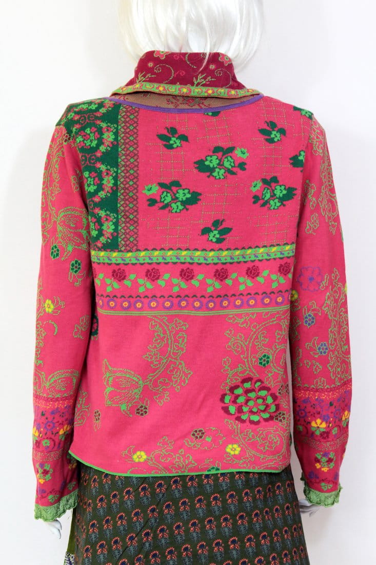 Uroczy sweter typu kardigan marki Ivko. Dominujące barwy to intensywny róż i trawiasta zieleń, ale znajdziemy sporo akcentów w innych kolorach. Sweter zapinany na małe guziki z masy perłowej, u góry wysoki kołnierz w kwiatową łączkę. Rękawy długie, wykończone ażurową tasiemką. 100 % bawełna, miękka, lekka. Idealny na cieplejsze pory roku, jako okrycie wierzchnie, lub bluza na chłodniejszy wieczór.