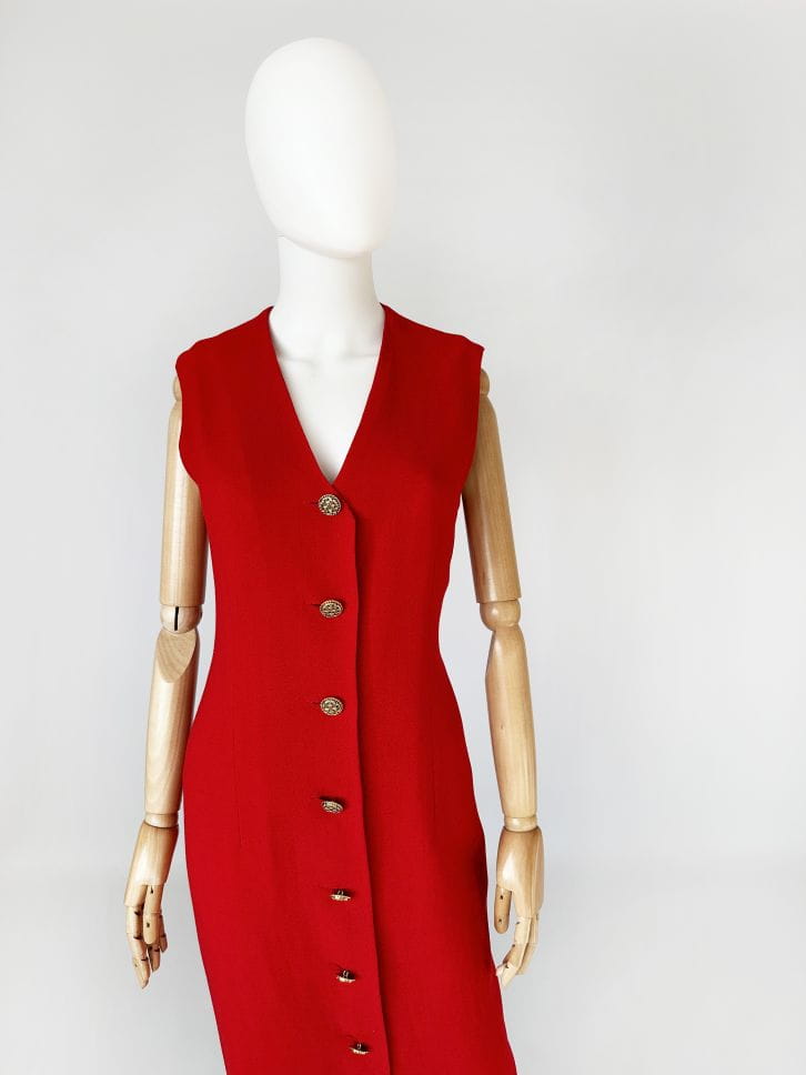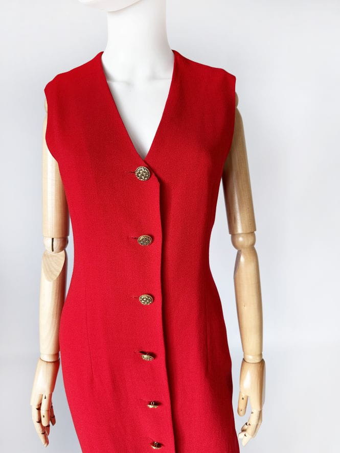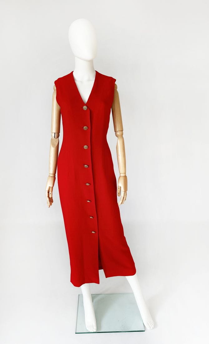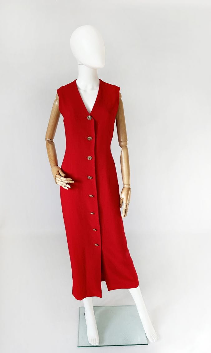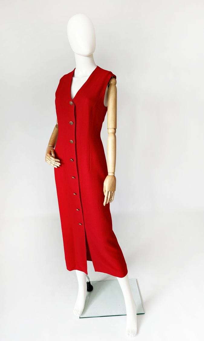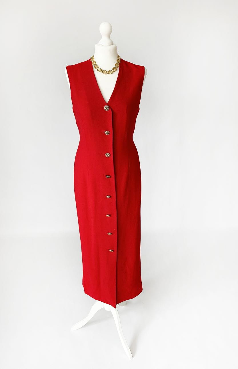 Sukienka vintage z przełomu lat 80-tych/90-tych topowej brytyjskiej marki Jaeger. Wykonana w całości z lekkiej wełnianej krepy w mocnym czerwonym kolorze. Całość zapinana na biżuteryjne złote guziki. Prosty fason o długości maxi, góra bez rękawów. Od wewnątrz na podszewce.