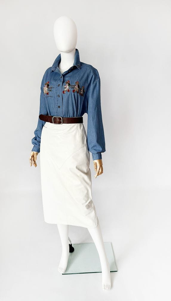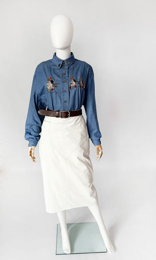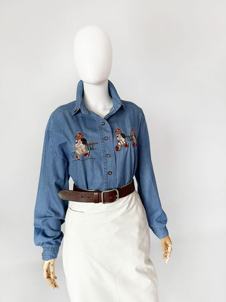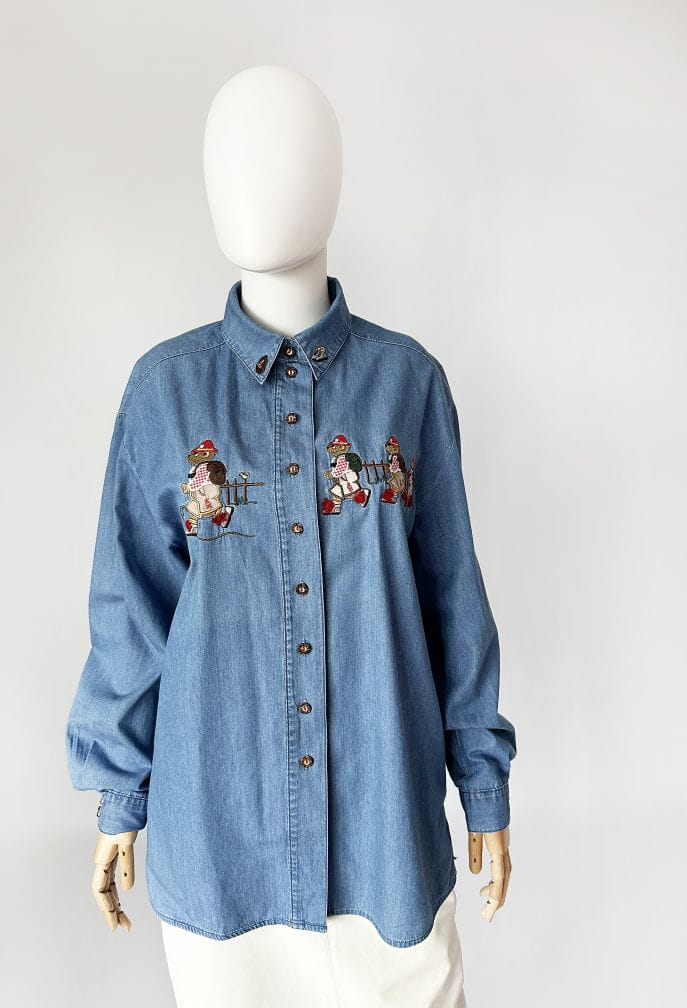 Koszula vintage wykonana z lekkiej jeansowej tkaniny. Klasyczny fason z kołnierzykiem. Od frontu, na wysokości biustu haftowane aplikacje - zwierzęta w bawarskich wdziankach :)