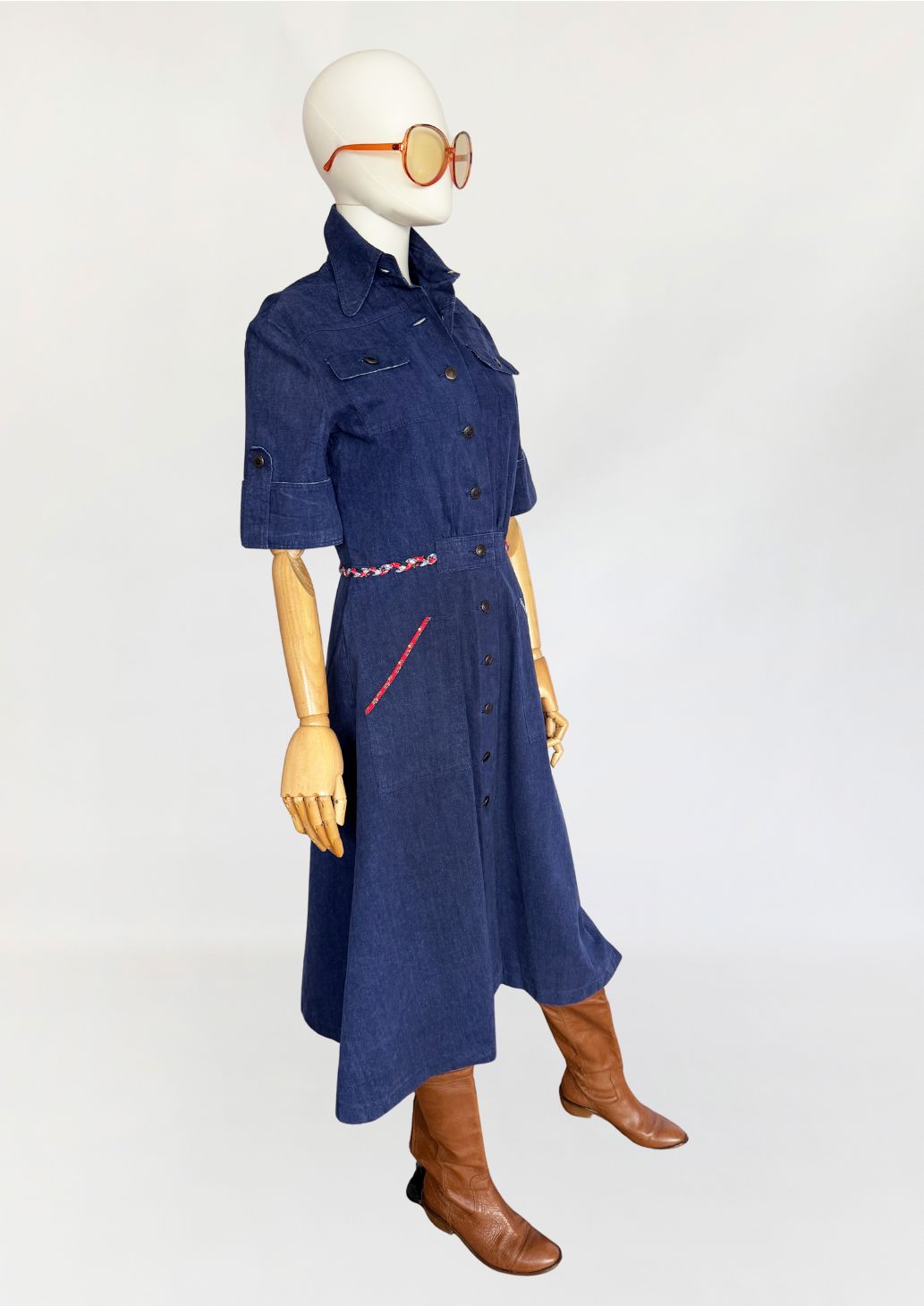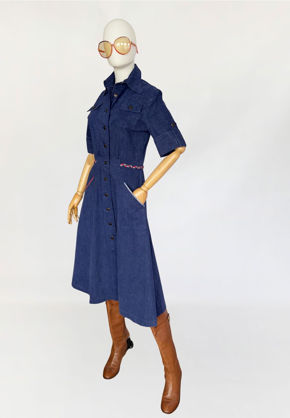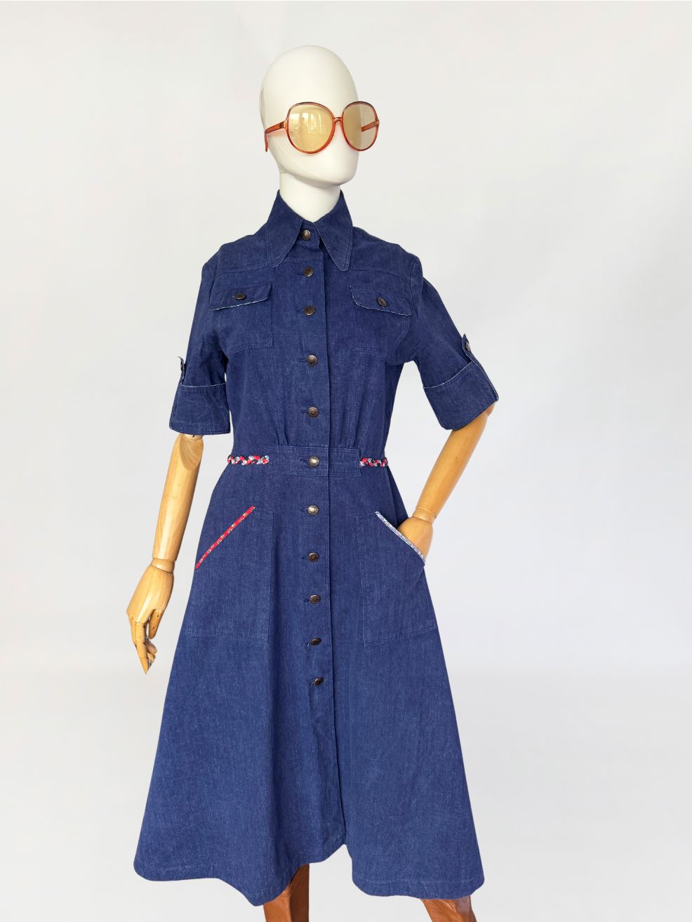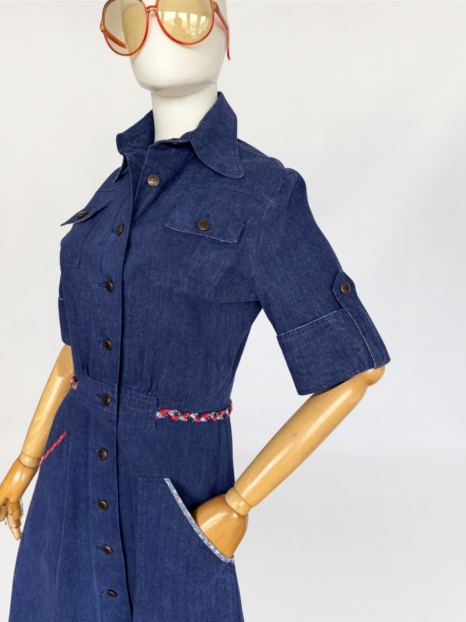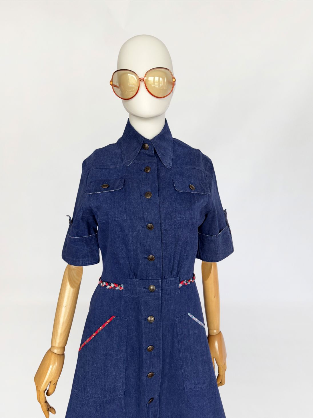 Sukienka vintage z lat 70-tych/80-tych wykonana z granatowego denimu. Trapezowy fason o długości midi, z rozpinanym przodem na metalowe guziki w kolorze starego mosiądzu. Góra z lekko przedłużanym kołnierzem i krótkimi rękawami z mankietami zapinanymi na patki. Od frontu dwie kieszenie z klapami. W talii wstawka z plecionego, wielobarwnego sznurka w odcieniach czerwieni i błękitu, nawiązująca do folkowych akcentów. Kieszenie z przodu wykończone kontrastowymi lamówkami w tych samych kolorach. Tył z karczkiem i pionowymi zaszewkami modelującymi linię pleców.