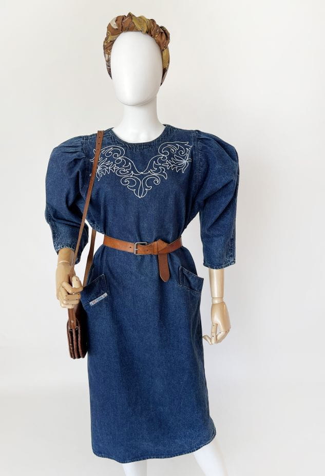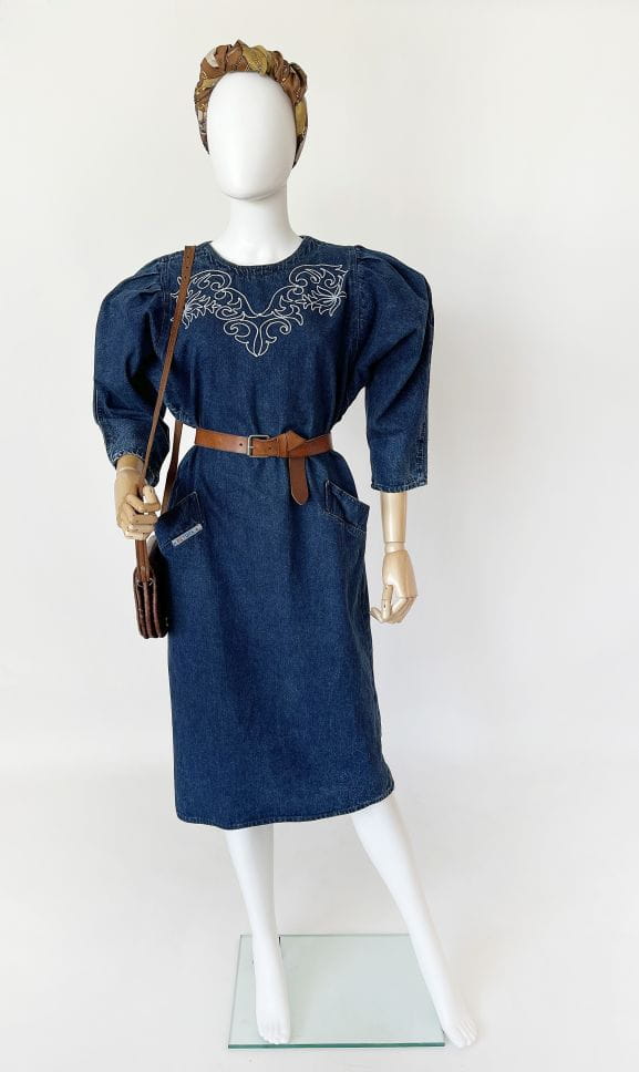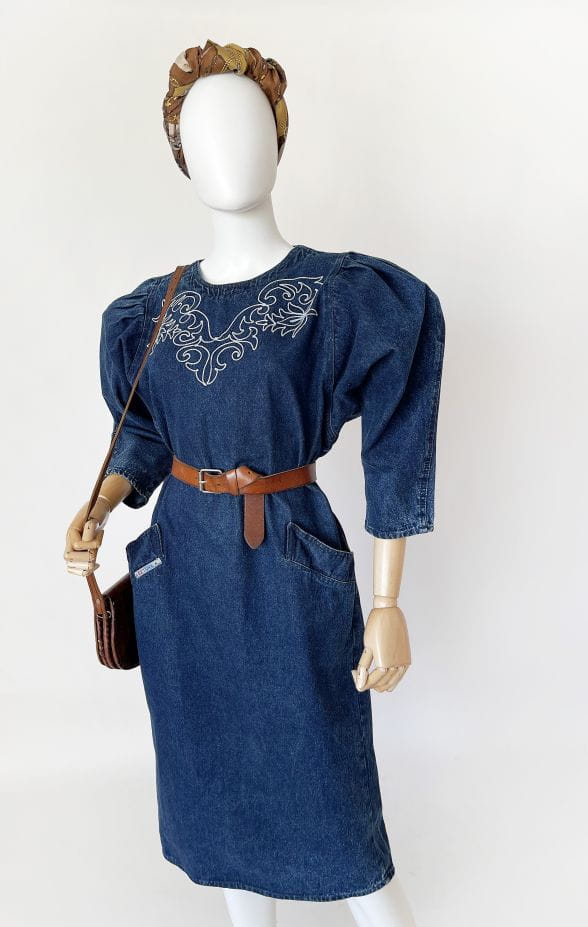Jeansowa sukienka vintage z lat 80-tych. Charakterystyczny dla dekady, miejscowo lekko sprany jeans i okazałe, bufiaste ramiona, klasa. Góra nieco luźniejsza, z obniżoną linią pach. Wokół dekoltu ręcznie haftowana aplikacja. Na wysokości bioder kieszenie. Z tyłu u dołu rozporek Model bez podszewki.