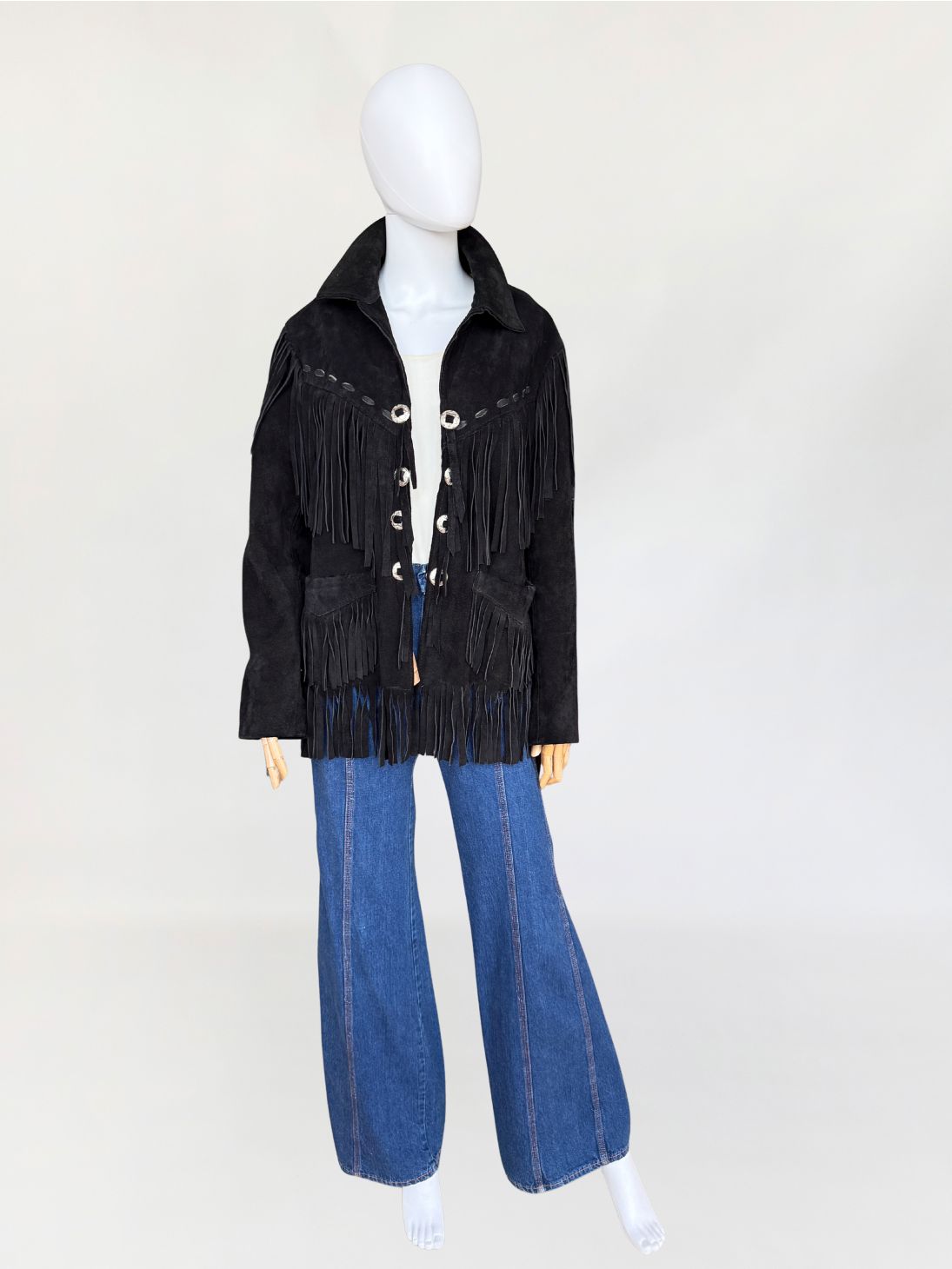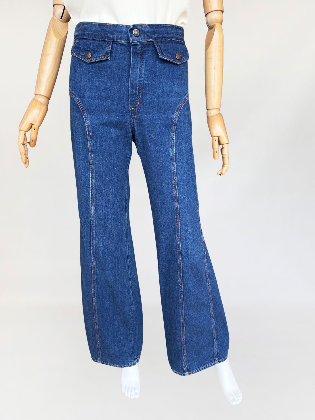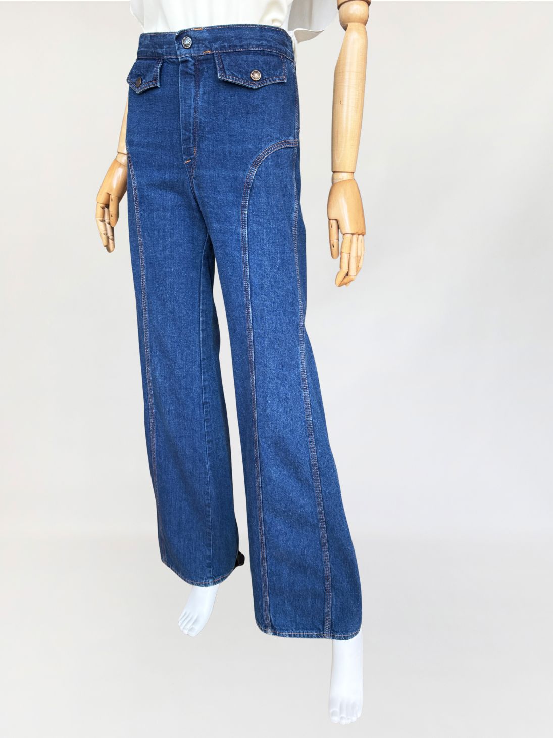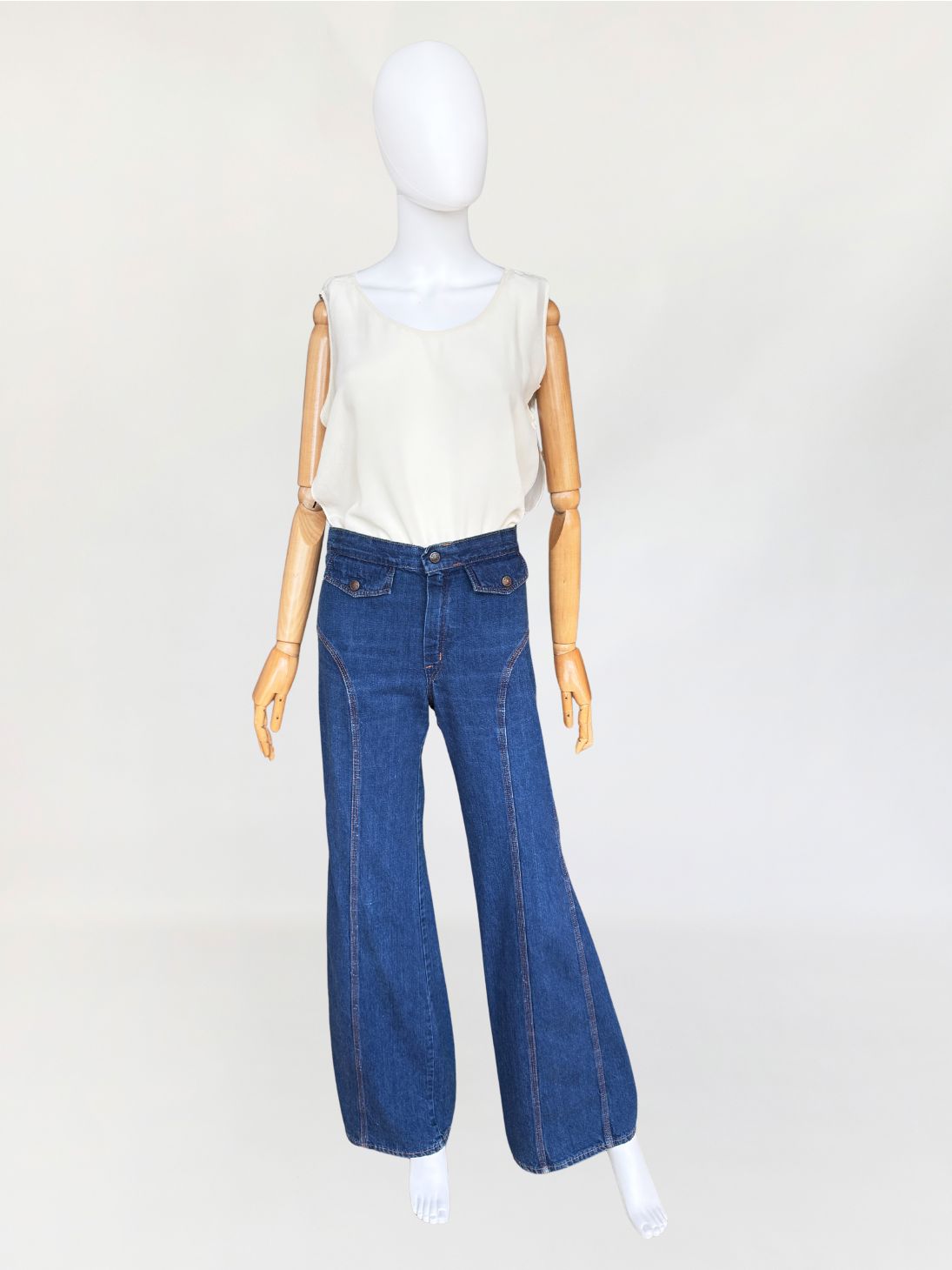 Oryginalne flare jeans z lat 70-tych. Kultowy model wyprodukowany przez amerykańską markę GAP w pierwszych latach dzialalności. Długie nogawki dzwony, z pionowymi przeszyciami. W górnej części klapy imitujące kieszenie. Ponadczasowy model dla miłośniczek dekady dzieci kwiatów, stylu hippie, oraz jednego z najpopularniejszych amerykańskich brandów.