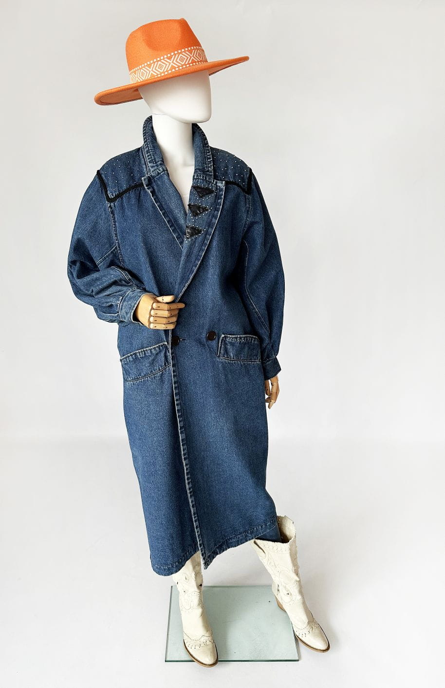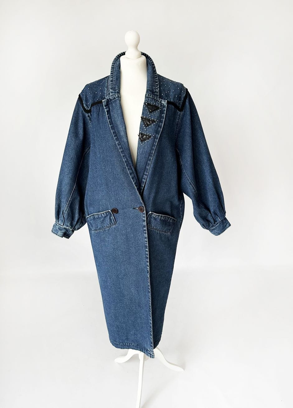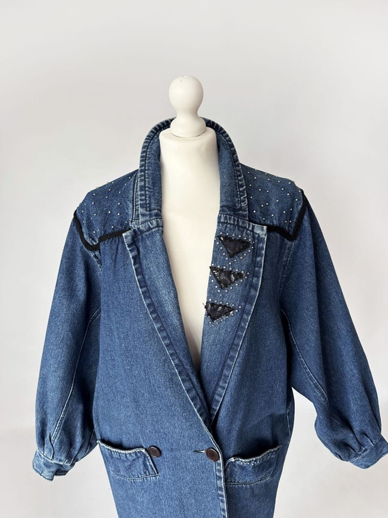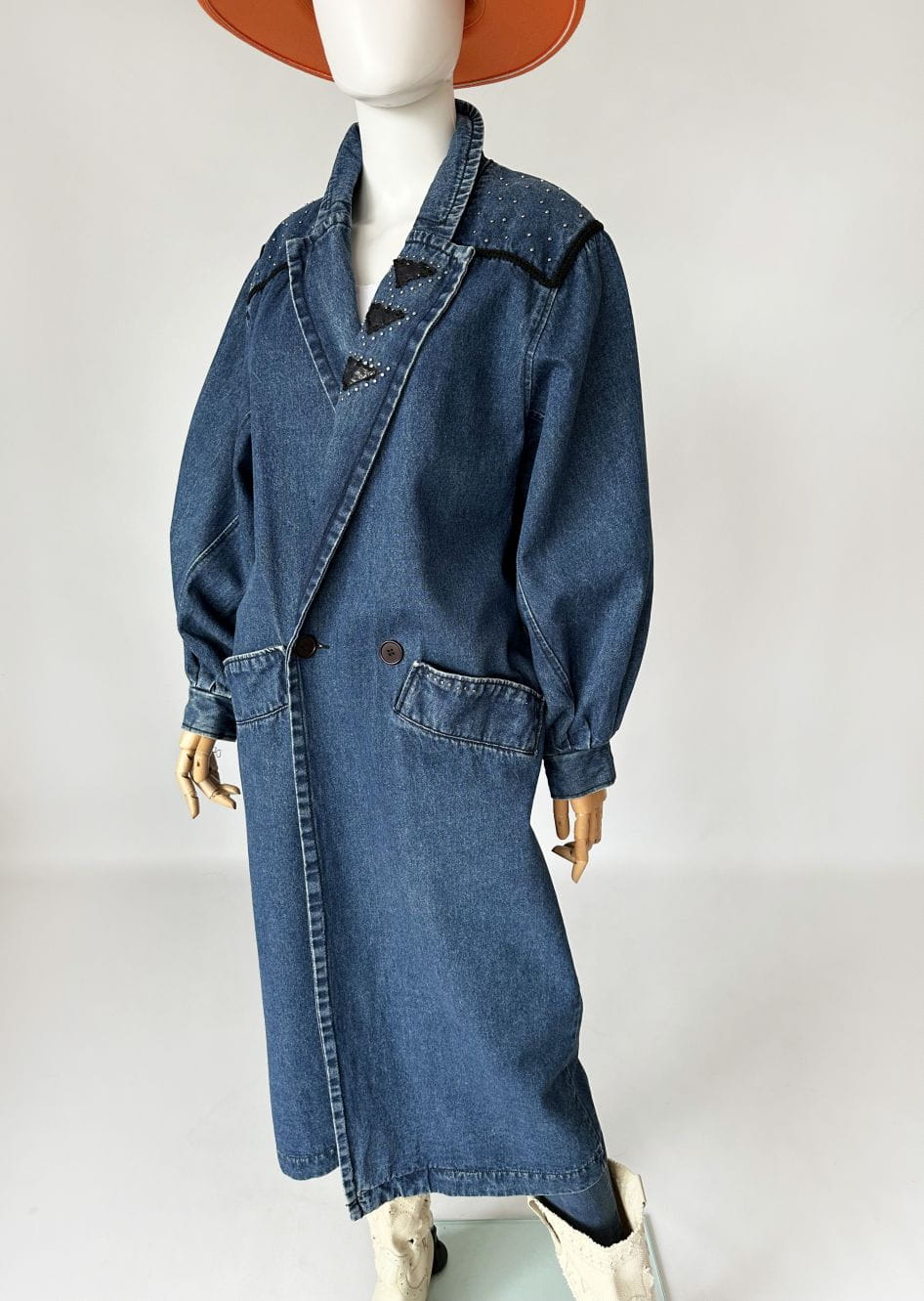 Jeansowy płaszcz vintage z lat 80-tych/90-tych. Model o długości maxi z luźniejszą górą i fasonem zwężanym do dołu. Przepinany w pasie na dwa guziki. U góry duży kołnierz z dekoracyjnymi aplikacjami. Karczek wysadzany nitami, obszyty czarną lamówką. Długie rękawy, szerokie w ramionach, zakończone wąskimi mankietami. Na wysokości bioder duże kieszenie. Model bez podszewki.