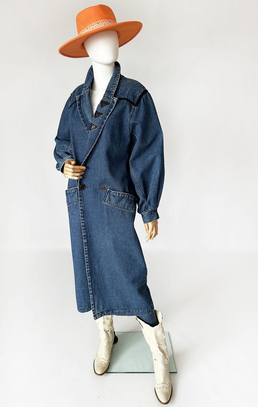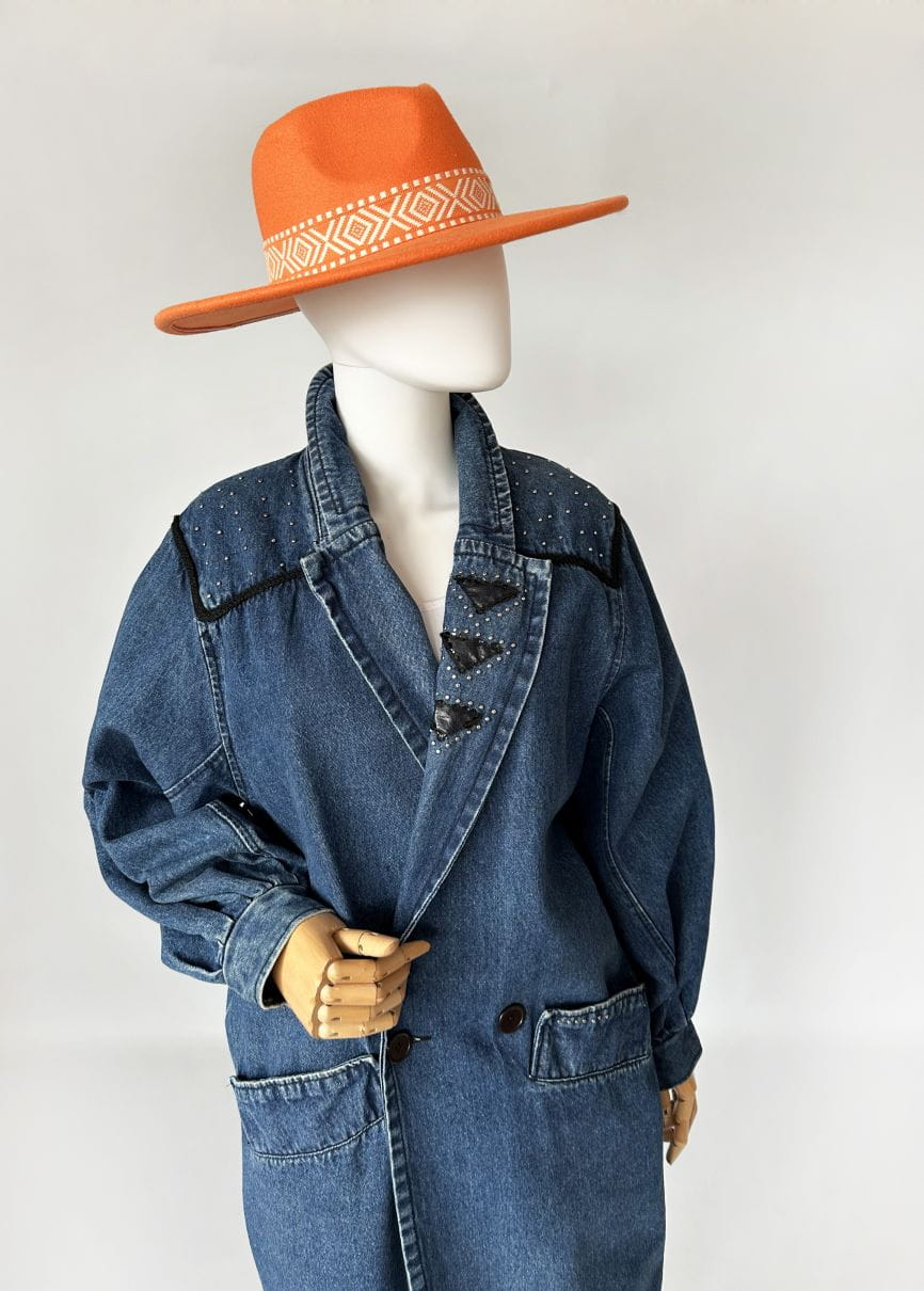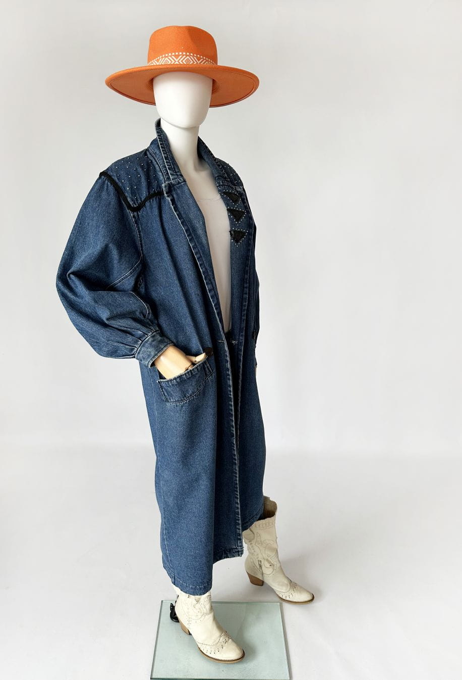 Jeansowy płaszcz vintage z lat 80-tych/90-tych. Model o długości maxi z luźniejszą górą i fasonem zwężanym do dołu. Przepinany w pasie na dwa guziki. U góry duży kołnierz z dekoracyjnymi aplikacjami. Karczek wysadzany nitami, obszyty czarną lamówką. Długie rękawy, szerokie w ramionach, zakończone wąskimi mankietami. Na wysokości bioder duże kieszenie. Model bez podszewki.