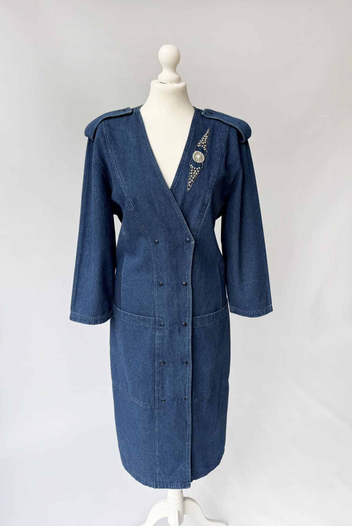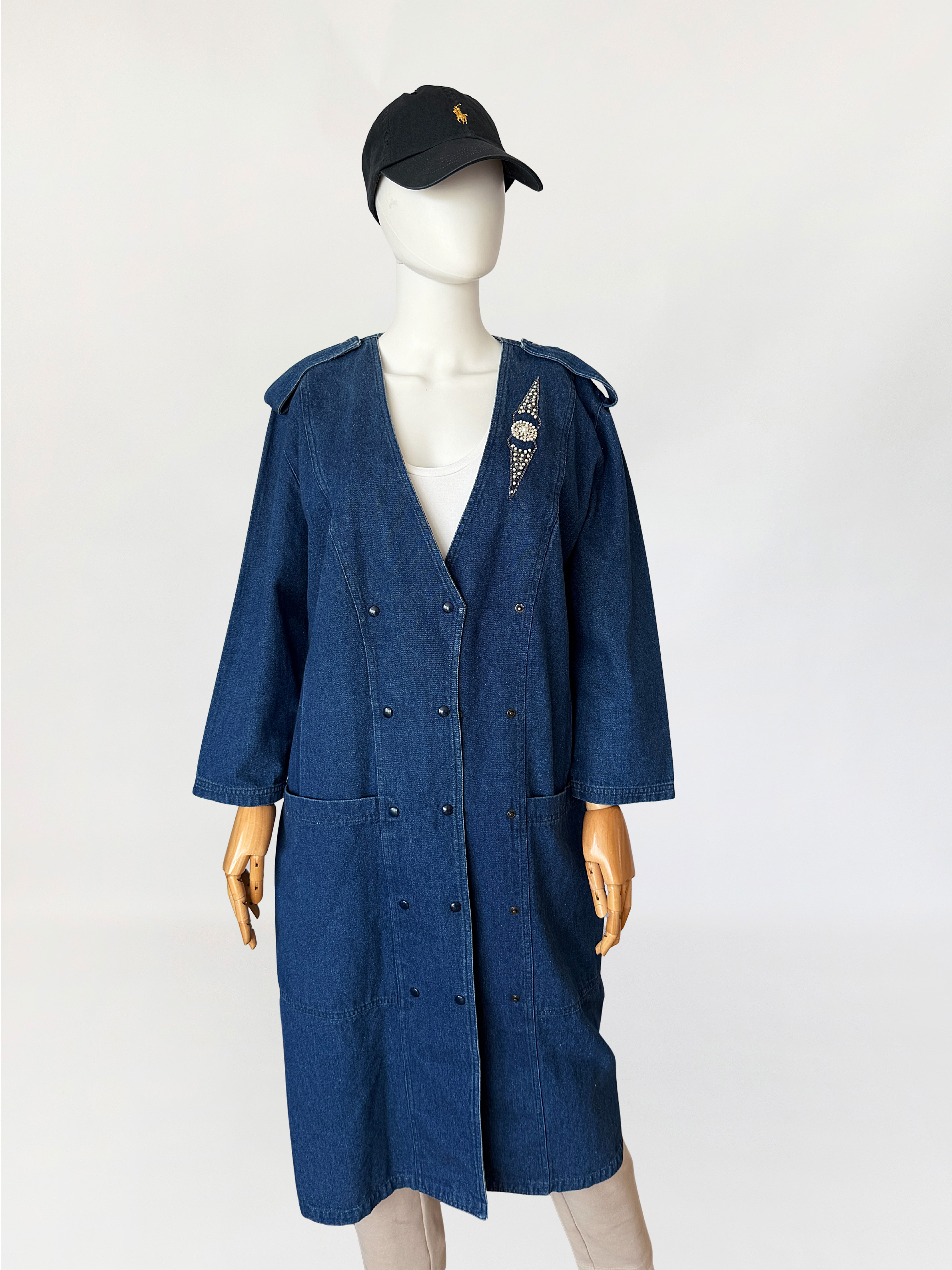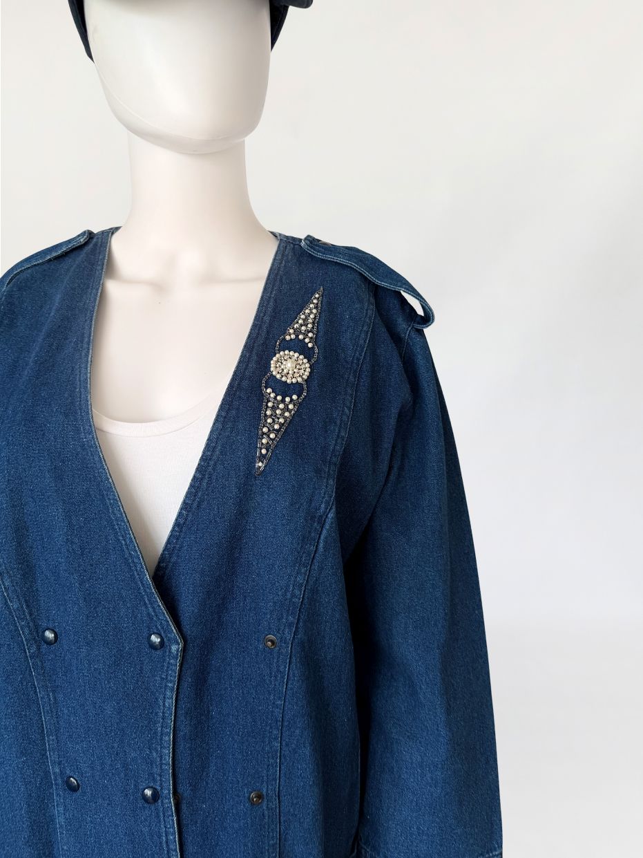 Włoski jeansowy płaszcz vintage z lat 80-tych/90-tych. Dwurzędowy model o długości midi. Góra z kopertowym dekoltem v-neck i dekoracyjną aplikacją biżuteryjną. Na ramionach przepinane patki. W dolnej części duże kieszenie.