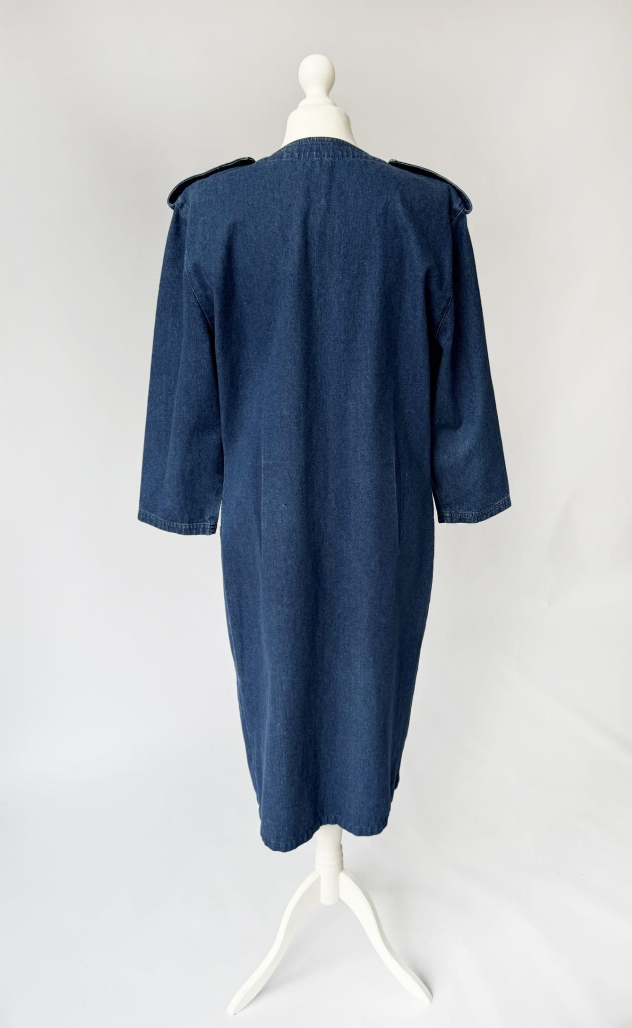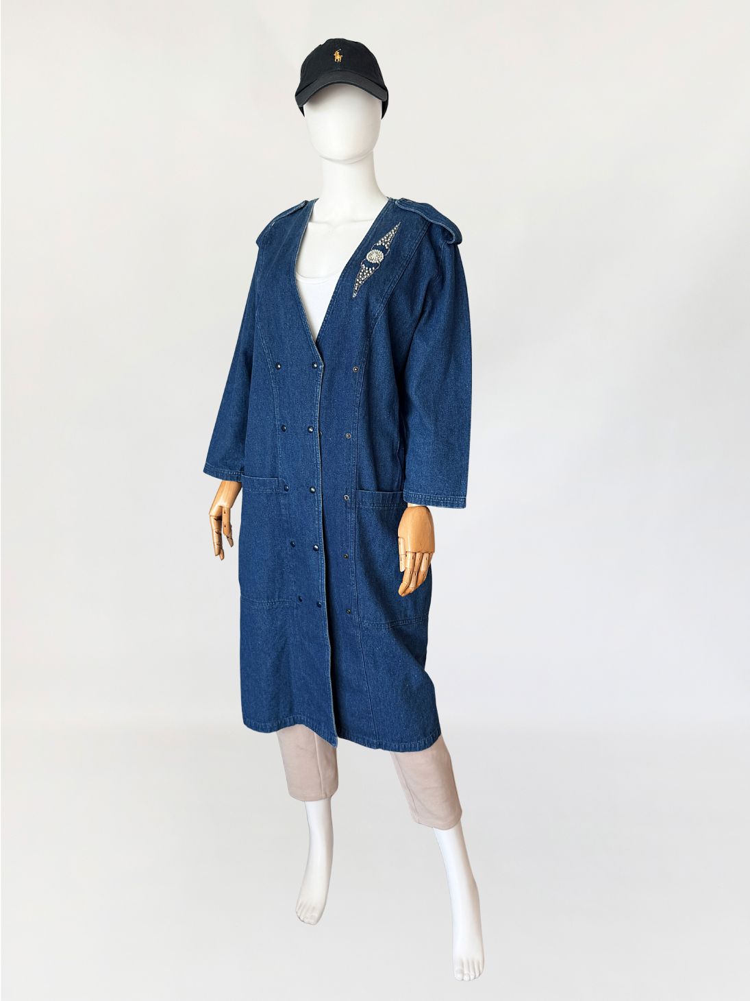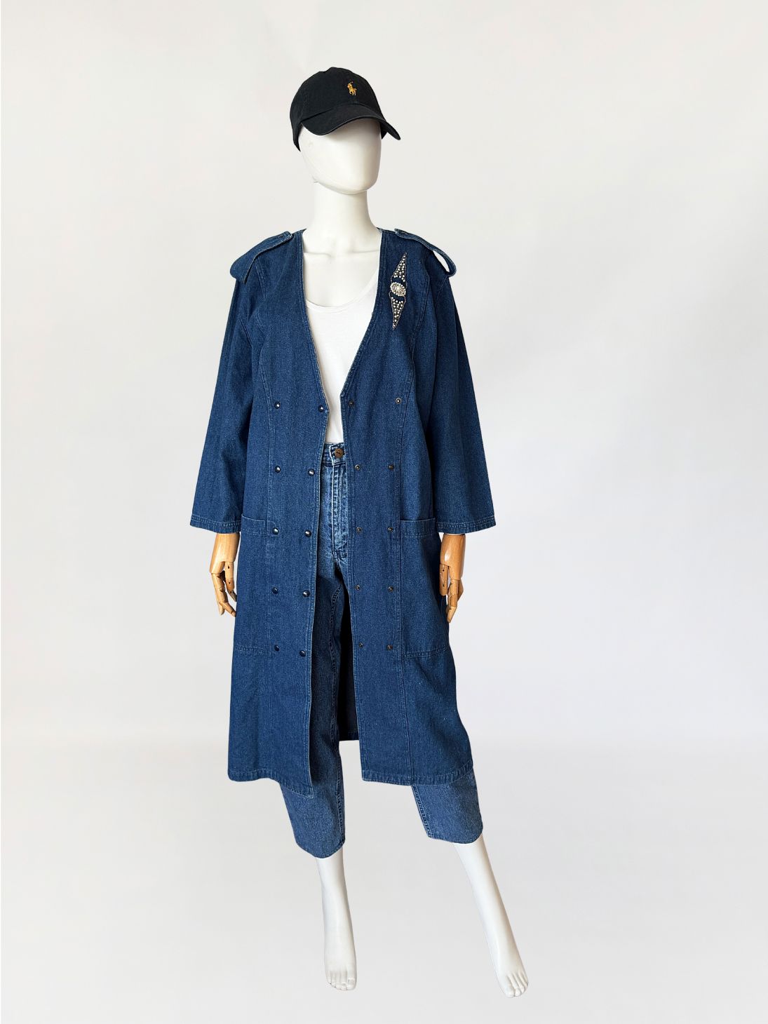 Włoski jeansowy płaszcz vintage z lat 80-tych/90-tych. Dwurzędowy model o długości midi. Góra z kopertowym dekoltem v-neck i dekoracyjną aplikacją biżuteryjną. Na ramionach przepinane patki. W dolnej części duże kieszenie.