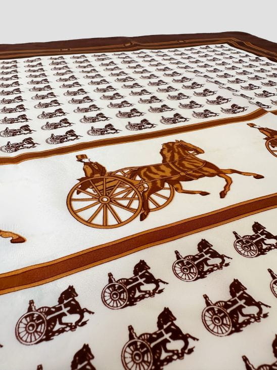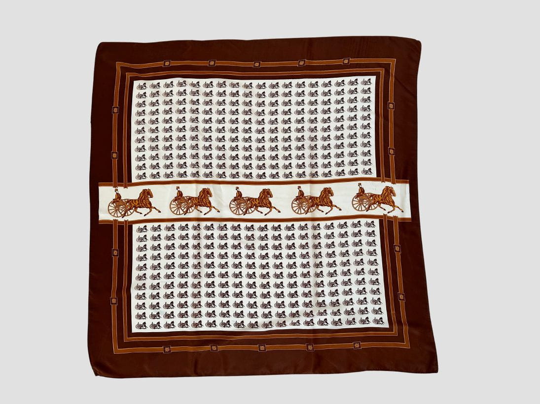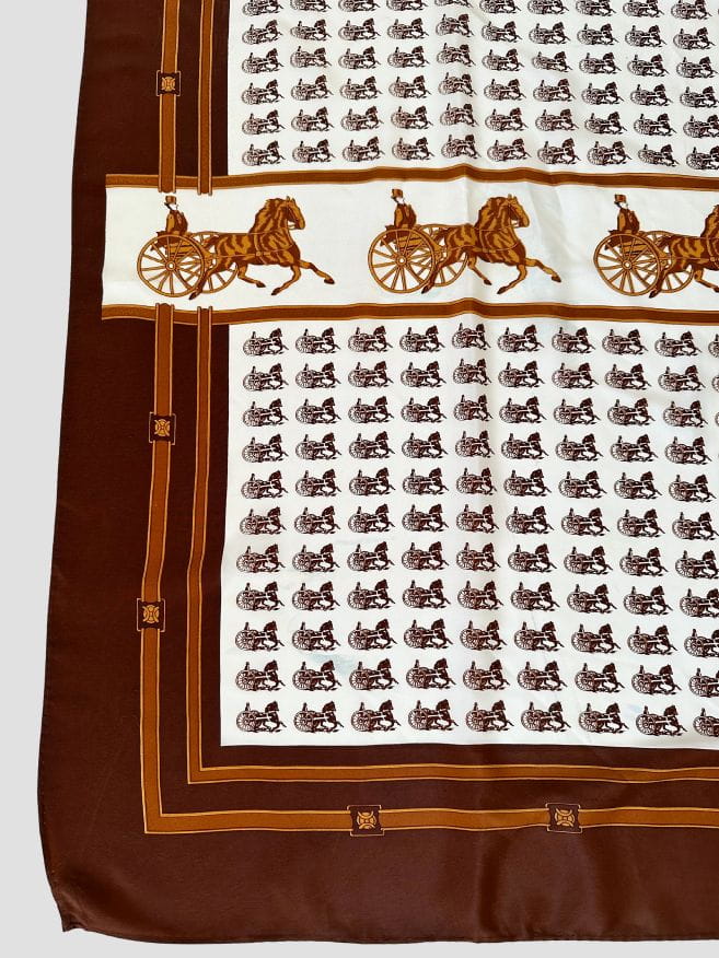 Duża apaszka/chustka vintage. Wykonana z jedwabnej tkaniny w regularne wzory - powozy. Ręcznie rolowana.