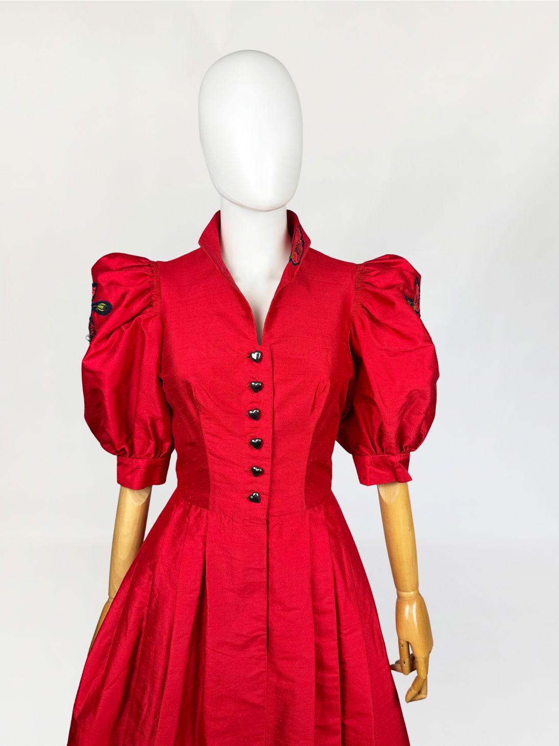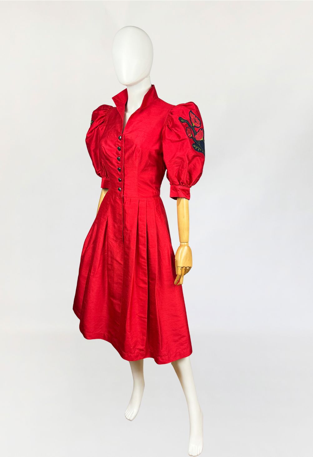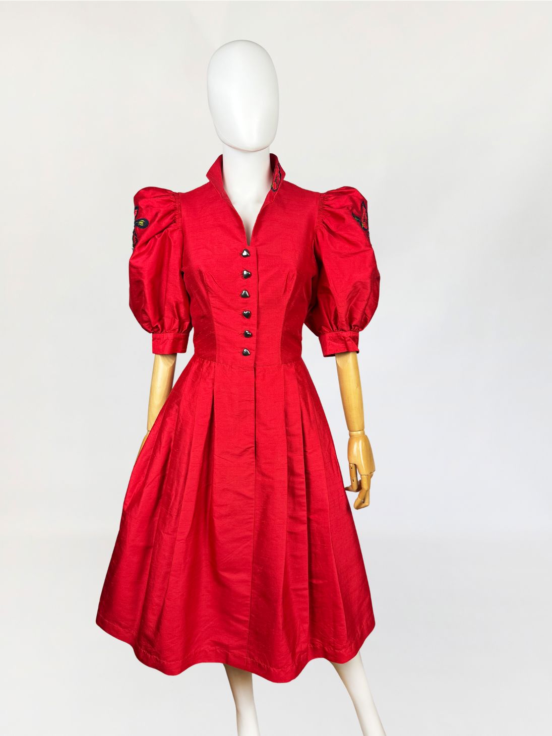 Austriacka sukienka vintage wykonana z naturalnego jedwabiu w intensywnym czerwonym kolorze. Model o długości midi, góra o dopasowanej, gorsetowej konstrukcji, modelowana pionowymi cięciami. Front zapinany na rząd drobnych guzików. Dekolt z krótką stójką, częściowo otwarty. Rękawy krótkie, bufiaste, zebrane w mankiety, zdobione haftowanymi naszywkami o motywie florystycznym. Spódnica o rozkloszowanym fasonie.