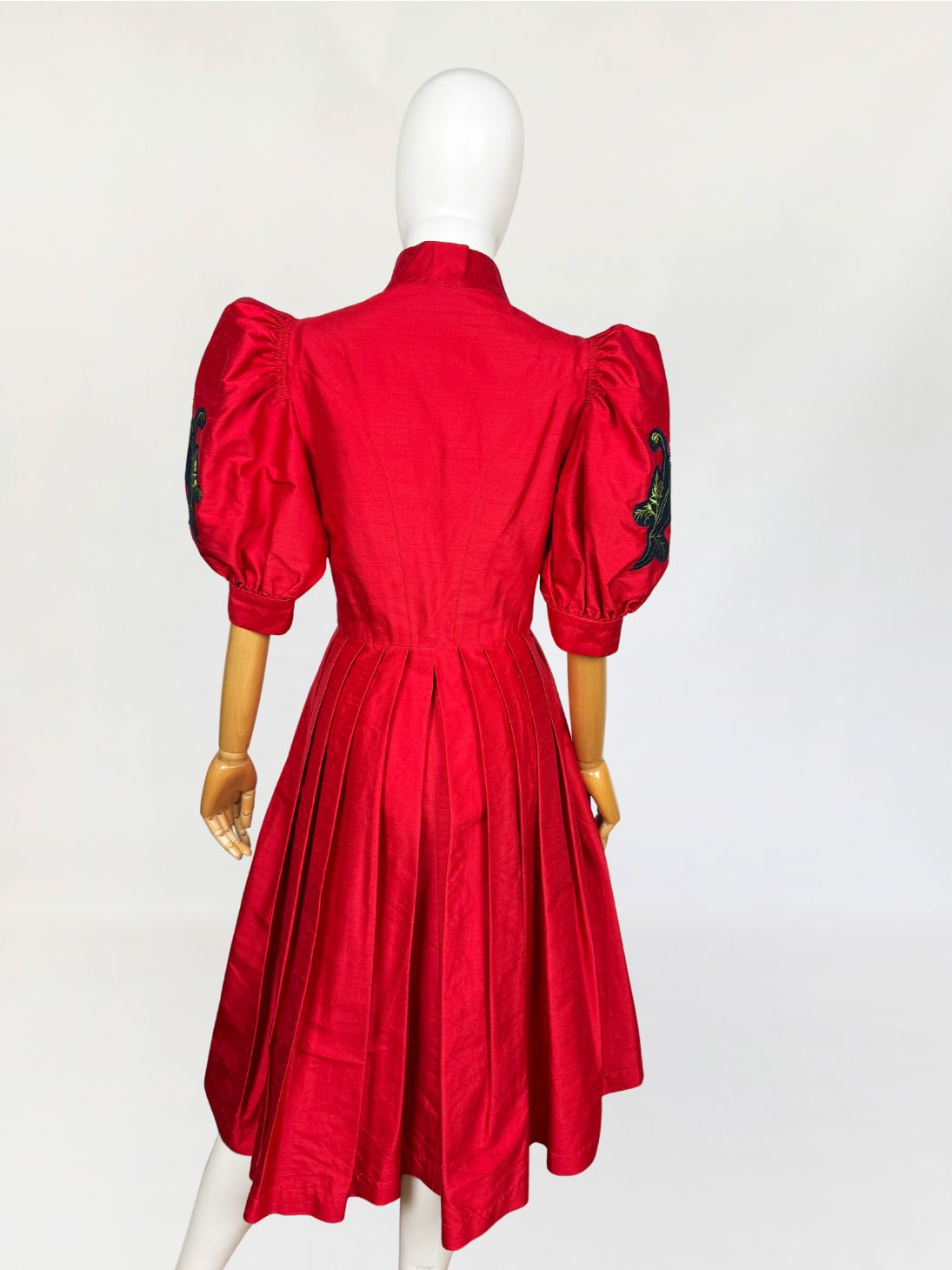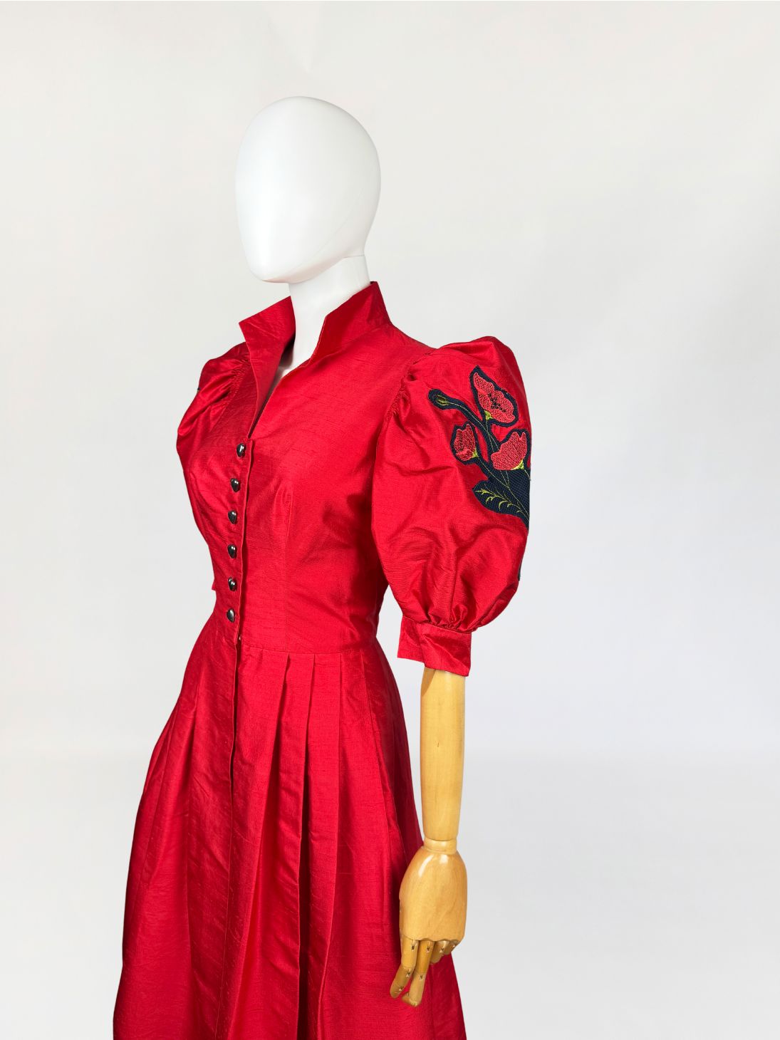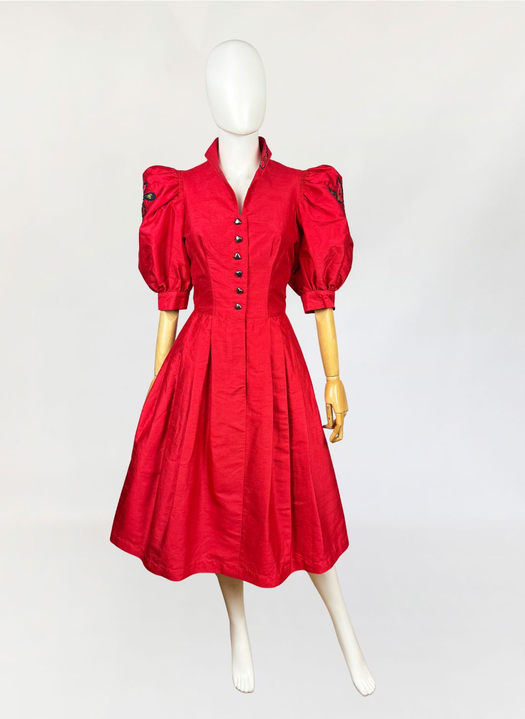 Austriacka sukienka vintage wykonana z naturalnego jedwabiu w intensywnym czerwonym kolorze. Model o długości midi, góra o dopasowanej, gorsetowej konstrukcji, modelowana pionowymi cięciami. Front zapinany na rząd drobnych guzików. Dekolt z krótką stójką, częściowo otwarty. Rękawy krótkie, bufiaste, zebrane w mankiety, zdobione haftowanymi naszywkami o motywie florystycznym. Spódnica o rozkloszowanym fasonie.