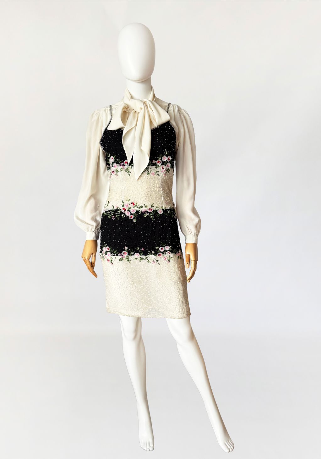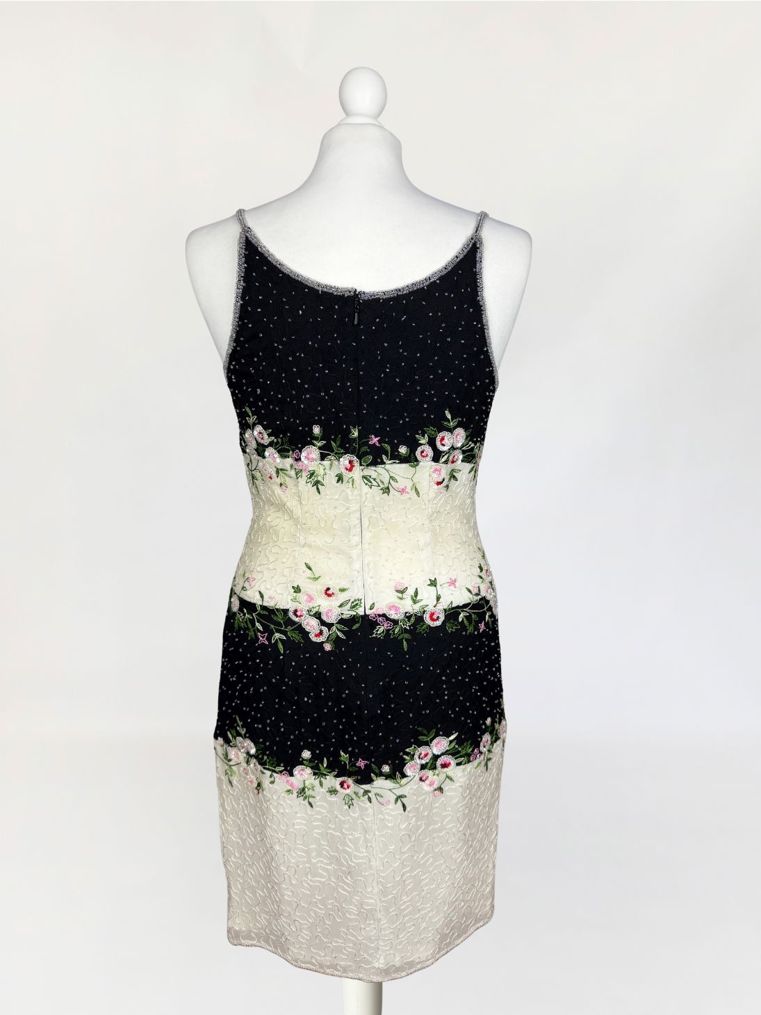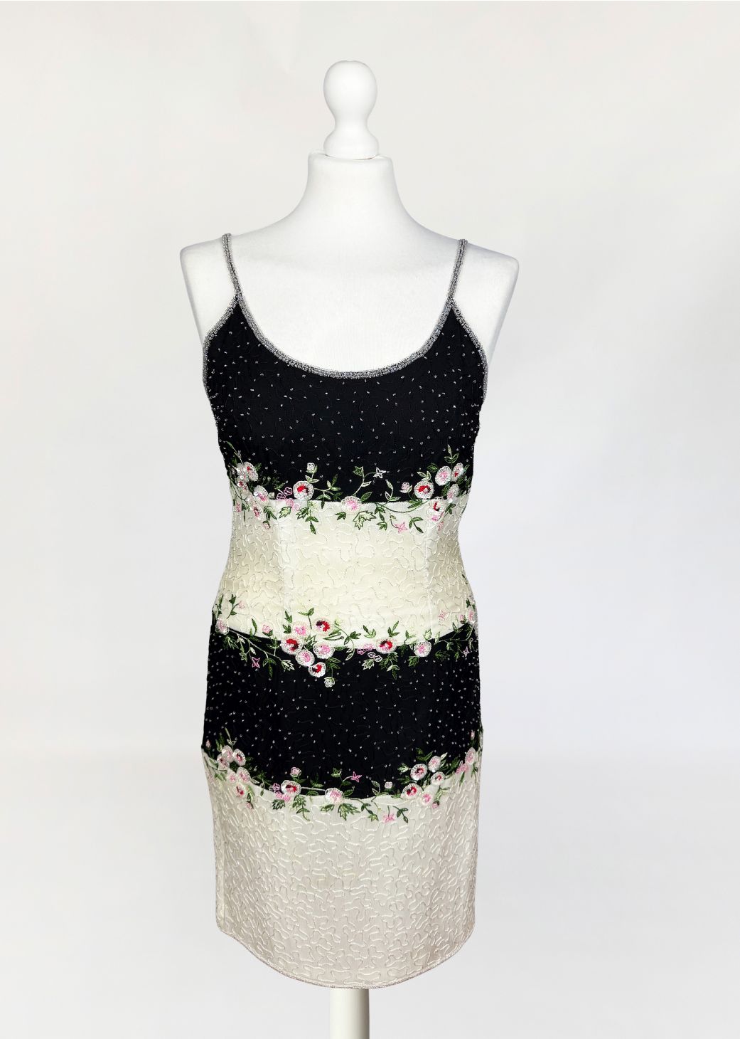 Sukienka vintage z dekady 00's wykonana z naturalnego jedwabiu. Model o taliowanym fasonie i długości przed kolano. Konstrukcja oparta na minimalistycznej, smukłej linii z cienkimi ramiączkami, których krawędź została obszyta drobnymi, biżuteryjnymi koralikami. Całość tkaniny zdobiona misternym haftem oraz aplikacjami tworzącymi geometryczną strukturę. Haftowane motywy kwiatowe biegną symetrycznie wzdłuż linii pod biustem oraz w środkowym i dolnym panelu, integrując całość kompozycyjnie. Wykończenia prowadzone są precyzyjnie, krawędzie stabilizowane, a aplikacje rozmieszczone z dużą dbałością o proporcje. Model efektowny pod względem konstrukcji i technik zdobniczych, odpowiedni do stylizacji wieczorowych.