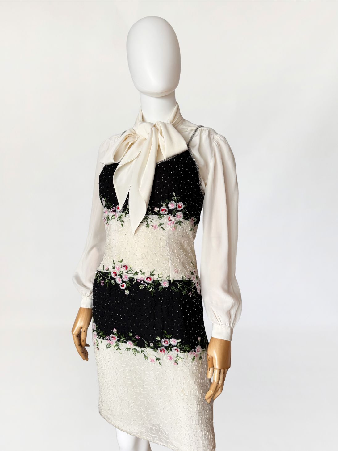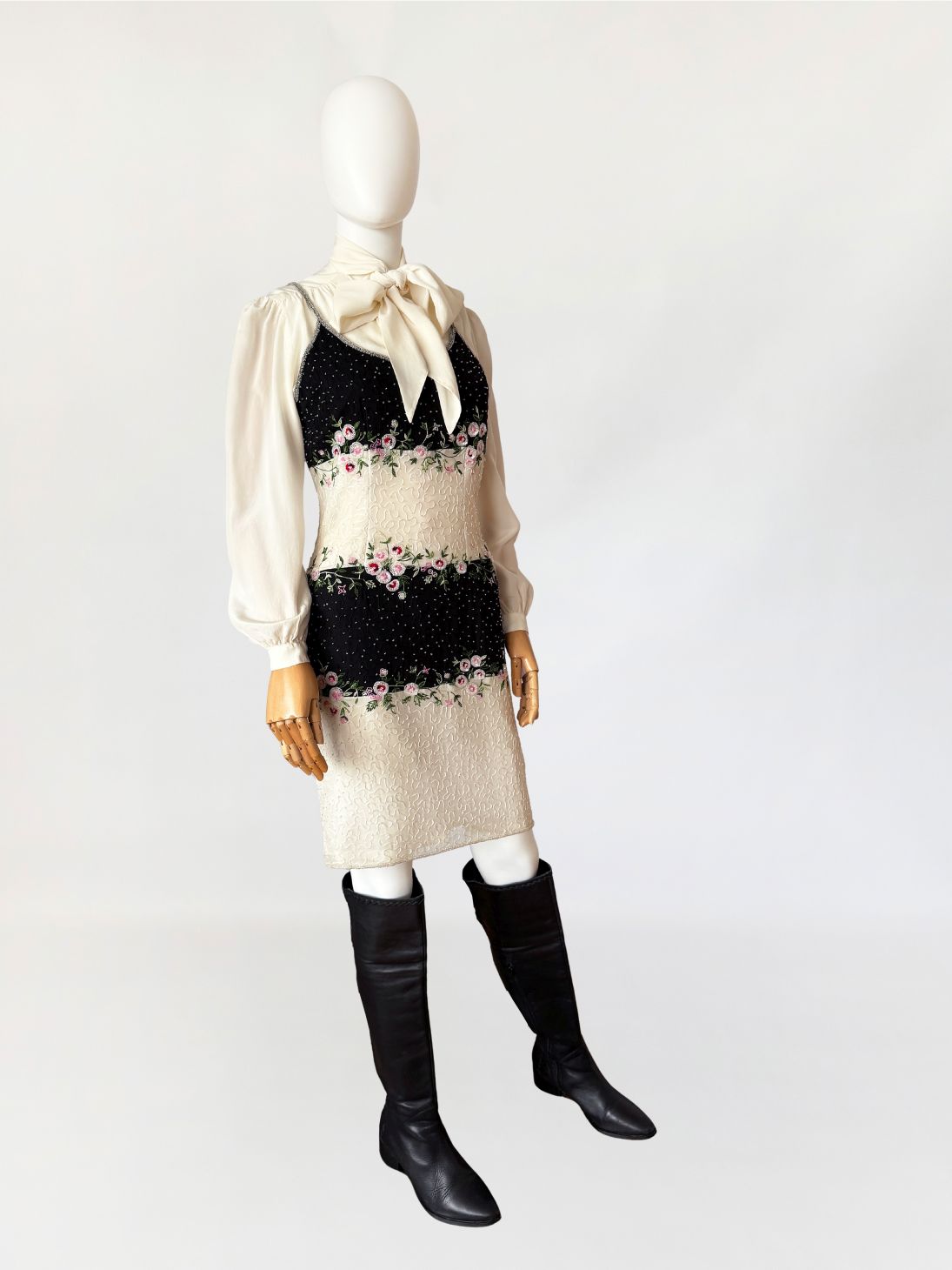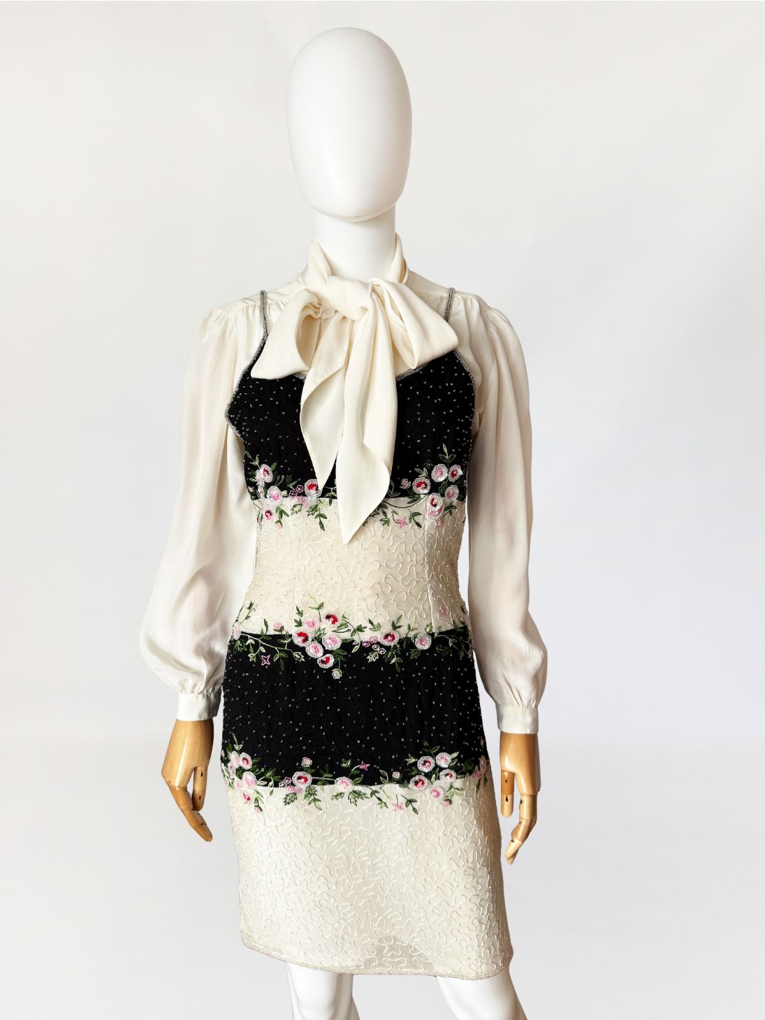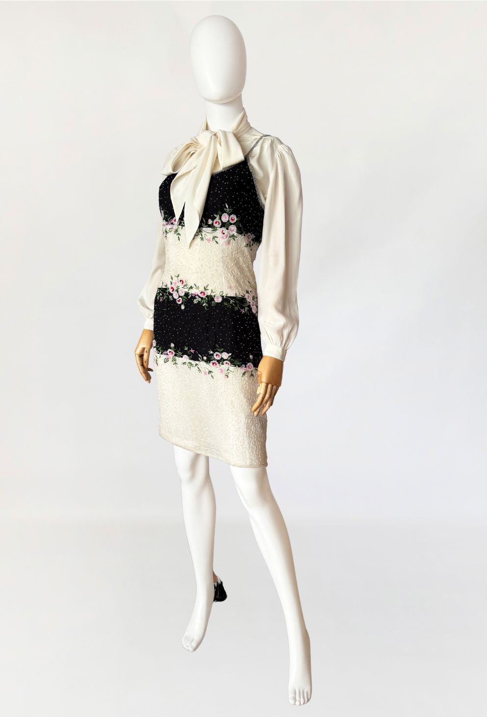 Sukienka vintage z dekady 00's wykonana z naturalnego jedwabiu. Model o taliowanym fasonie i długości przed kolano. Konstrukcja oparta na minimalistycznej, smukłej linii z cienkimi ramiączkami, których krawędź została obszyta drobnymi, biżuteryjnymi koralikami. Całość tkaniny zdobiona misternym haftem oraz aplikacjami tworzącymi geometryczną strukturę. Haftowane motywy kwiatowe biegną symetrycznie wzdłuż linii pod biustem oraz w środkowym i dolnym panelu, integrując całość kompozycyjnie. Wykończenia prowadzone są precyzyjnie, krawędzie stabilizowane, a aplikacje rozmieszczone z dużą dbałością o proporcje. Model efektowny pod względem konstrukcji i technik zdobniczych, odpowiedni do stylizacji wieczorowych.