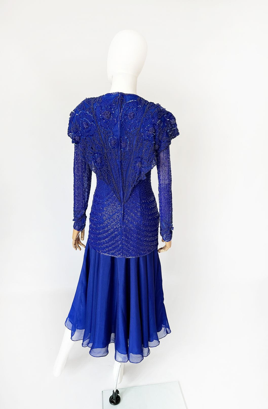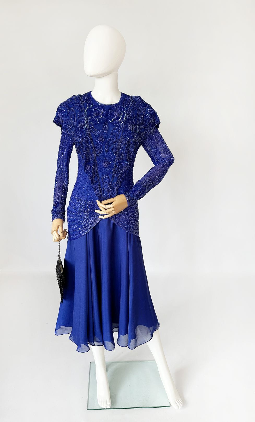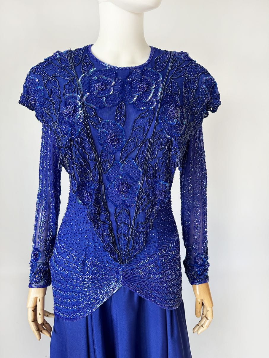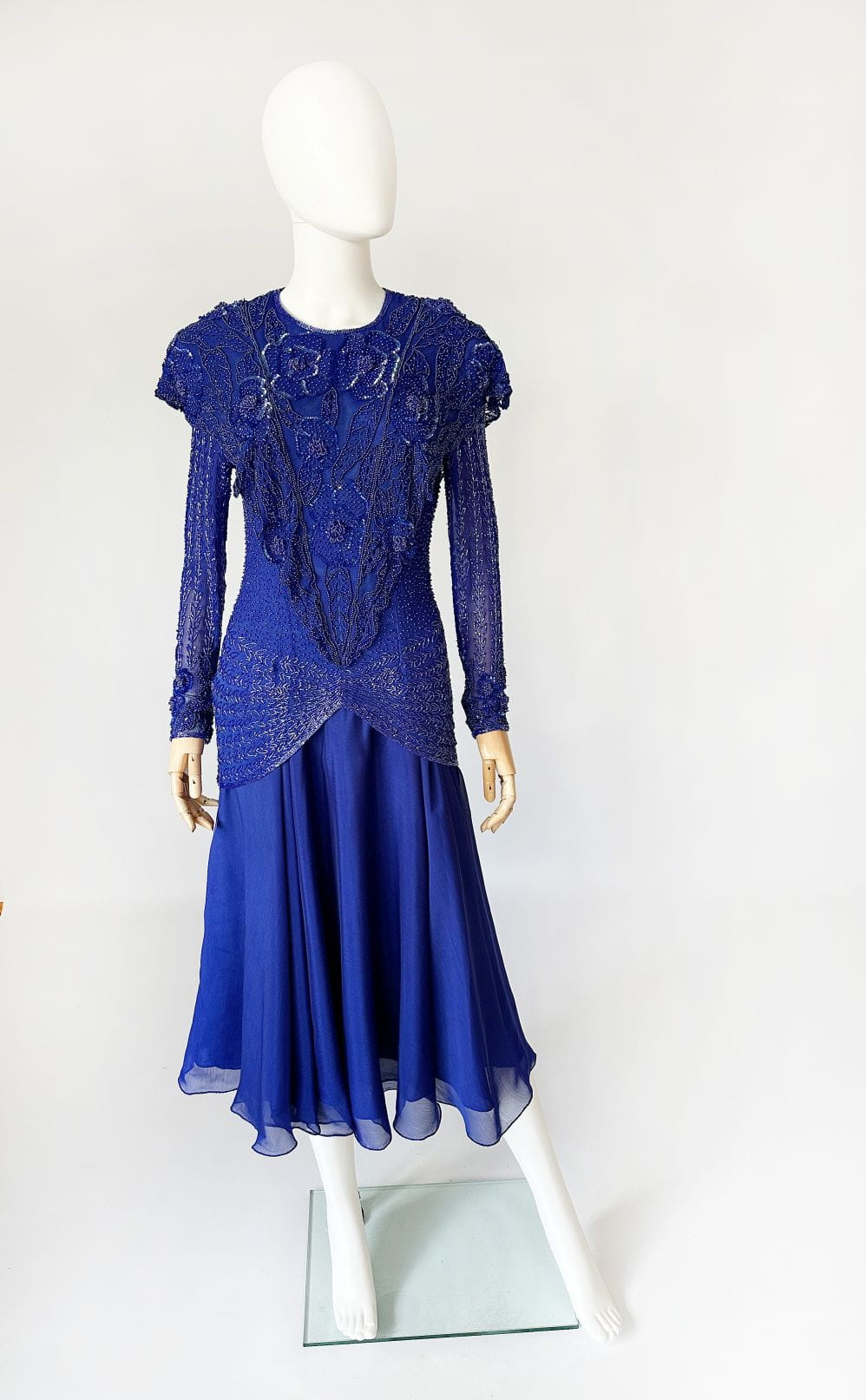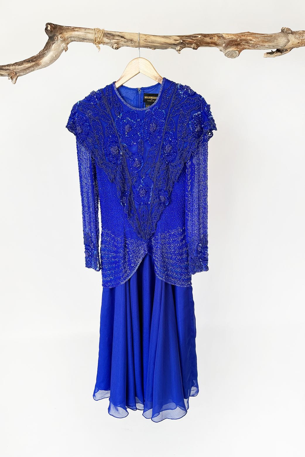 Dzieło sztuki z dekady lat 80-tych. Sukienka vintage projektu marki Simon Ellis. Wykonana w całości z jedwabiu w pięknym kolorze indygo. Pokryta ręcznie wyszywanymi biżuteryjnymi aplikacjami. Góra sukienki o prostym kroju, z długimi rękawami i niedużym okrągłym dekoltem, ramiona podkreślone poduszkami. Misterne zdobienia z tysięcy drobnych koralików i cekinów tworzących przemyślane wzory na całości. Gdzieniegdzie drobne ażurowe wstawki. Obszar ze zdobieniami to cały korpus, który opada także na część ze spódnicą, aż do bioder. Na wysokości ramion i obojczyków sukienka ma dodatkową warstwę jedwabiu, która swobodnie opada na resztę tkaniny. Spódnica ma rozkloszowany fason, została wykonana z jedwabnego szyfonu. Całość robi niesamowite wrażenie.