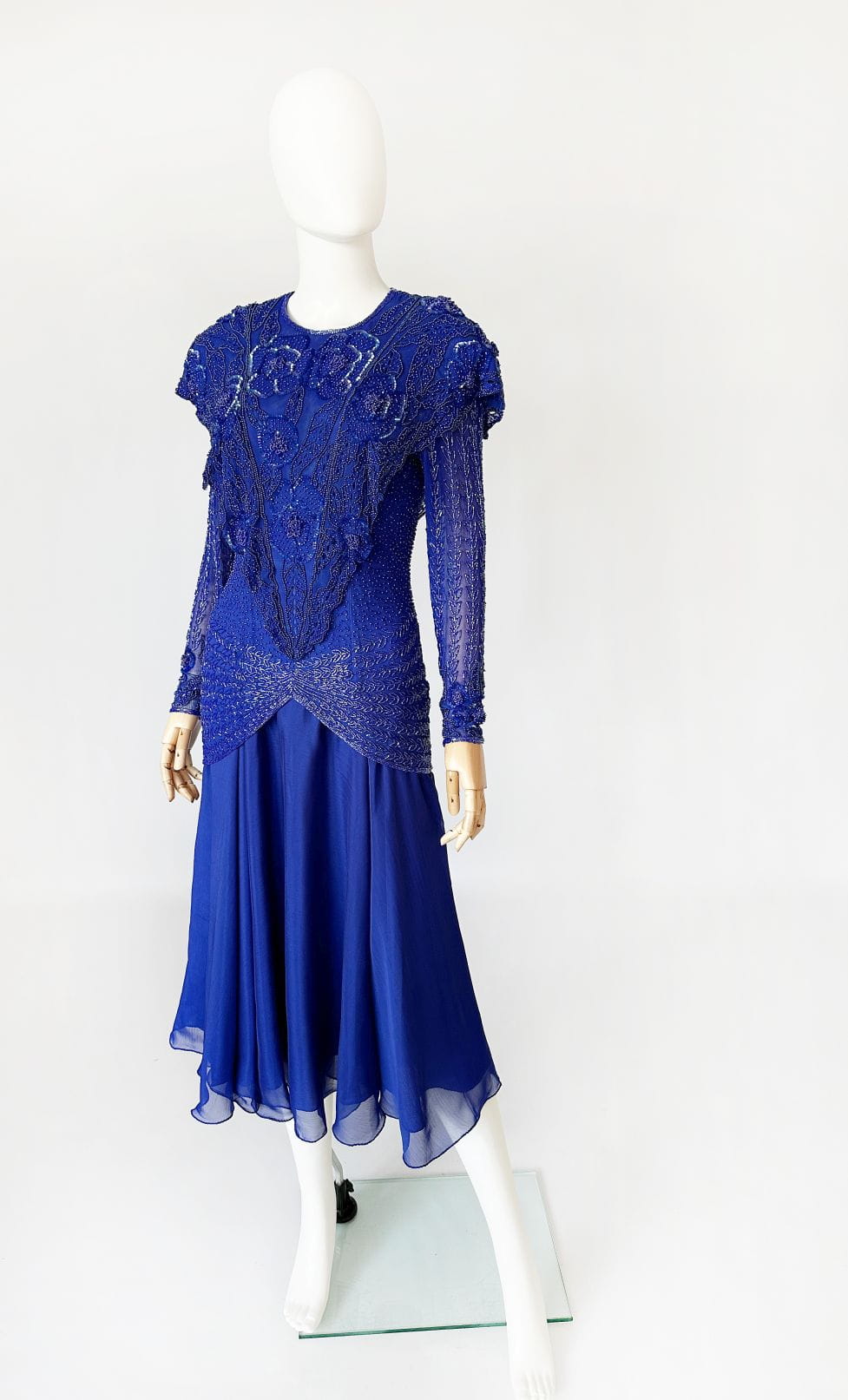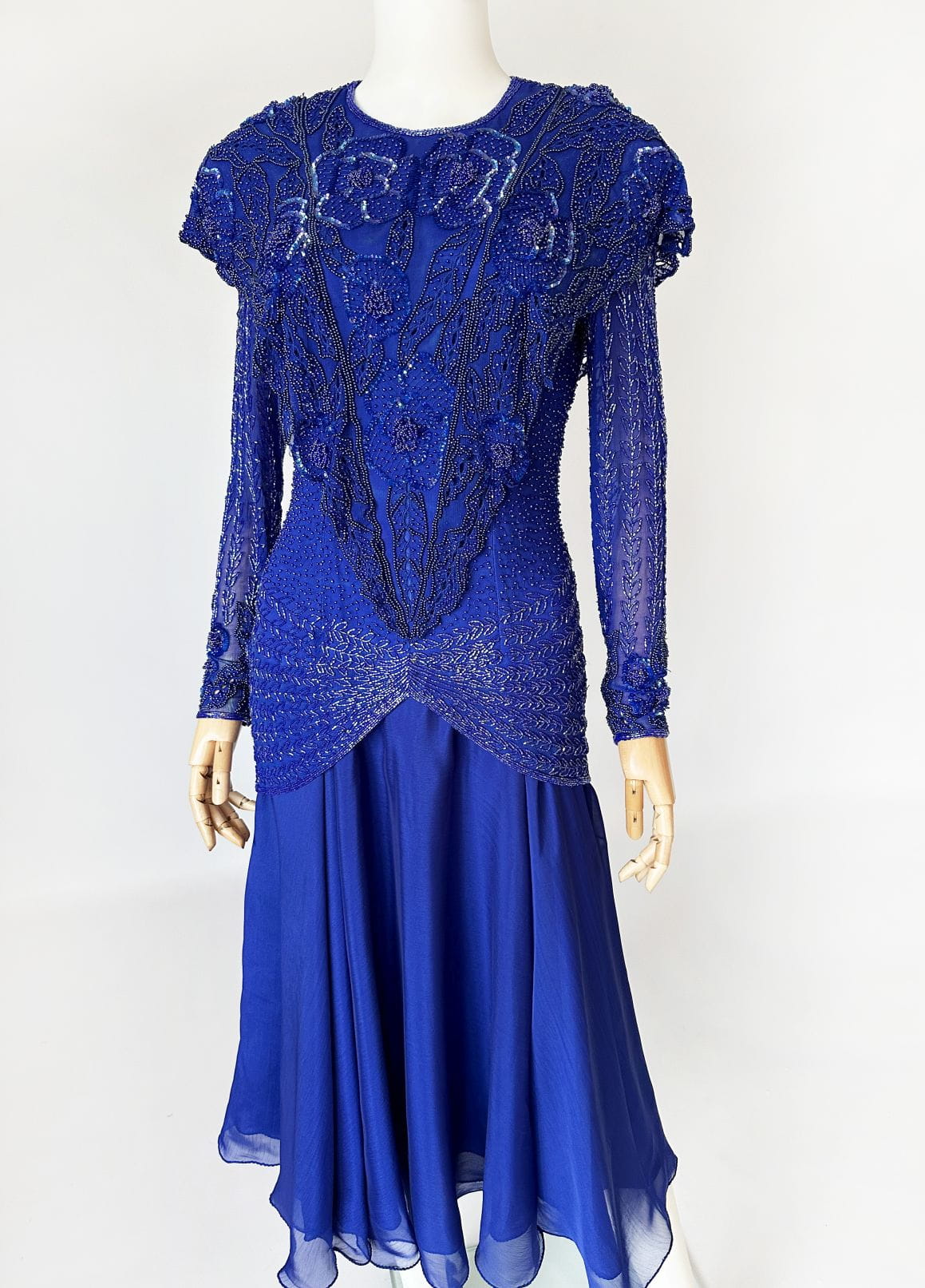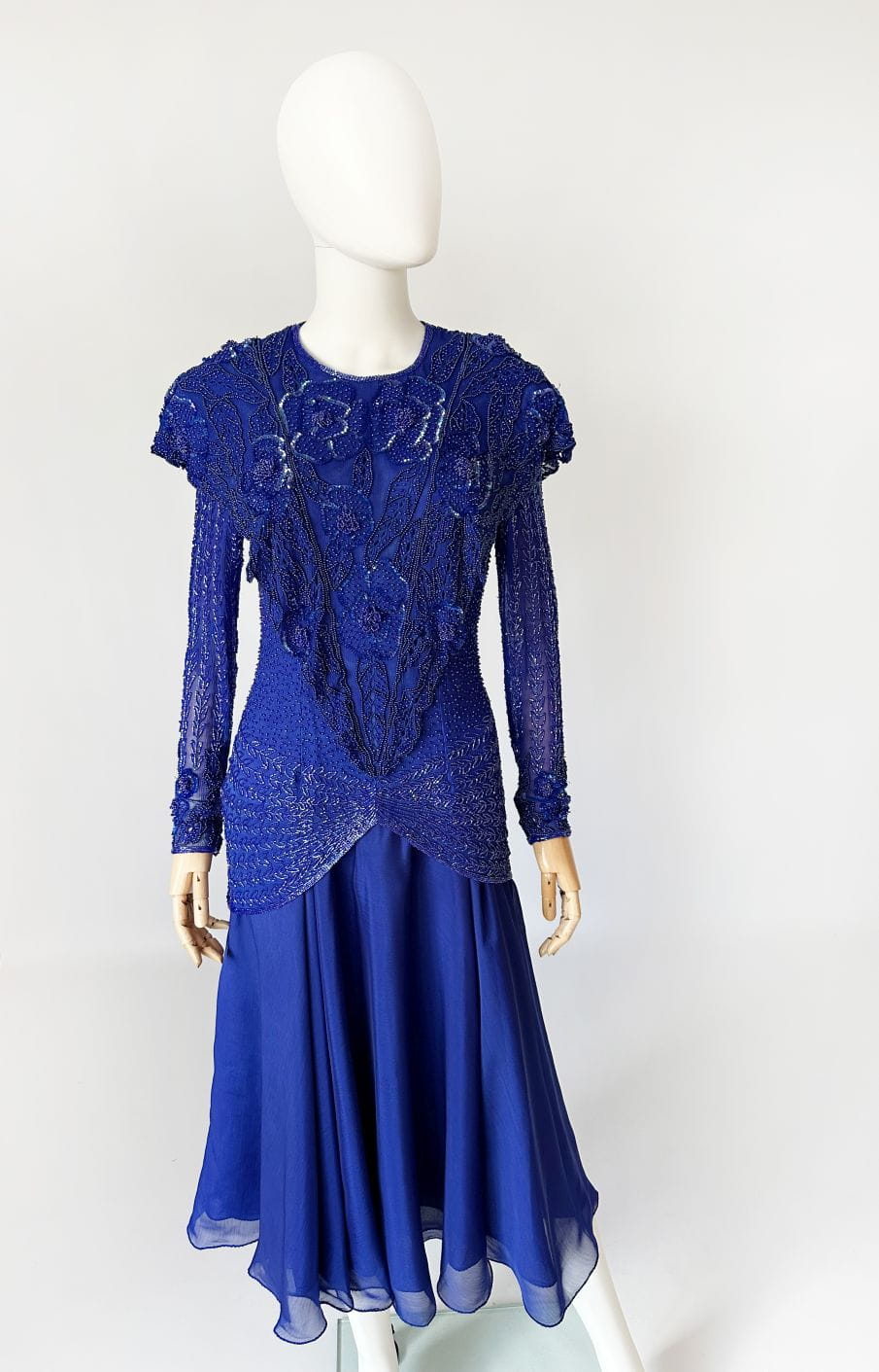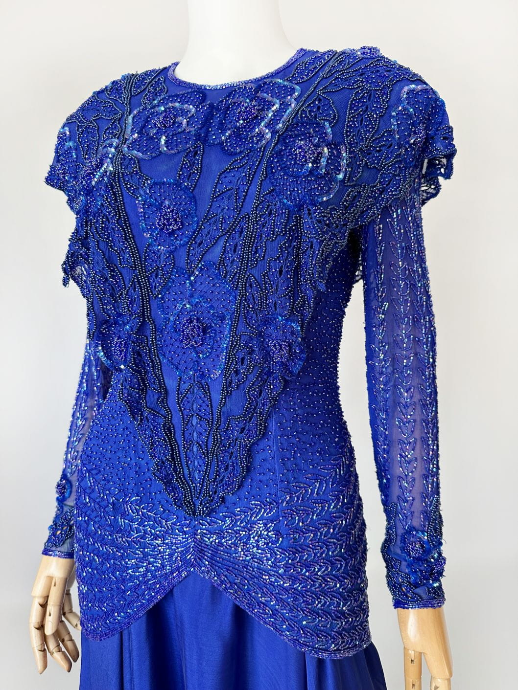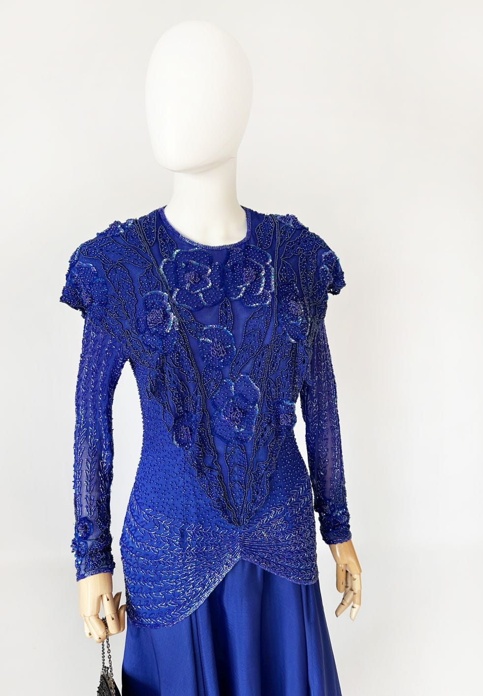 Dzieło sztuki z dekady lat 80-tych. Sukienka vintage projektu marki Simon Ellis. Wykonana w całości z jedwabiu w pięknym kolorze indygo. Pokryta ręcznie wyszywanymi biżuteryjnymi aplikacjami. Góra sukienki o prostym kroju, z długimi rękawami i niedużym okrągłym dekoltem, ramiona podkreślone poduszkami. Misterne zdobienia z tysięcy drobnych koralików i cekinów tworzących przemyślane wzory na całości. Gdzieniegdzie drobne ażurowe wstawki. Obszar ze zdobieniami to cały korpus, który opada także na część ze spódnicą, aż do bioder. Na wysokości ramion i obojczyków sukienka ma dodatkową warstwę jedwabiu, która swobodnie opada na resztę tkaniny. Spódnica ma rozkloszowany fason, została wykonana z jedwabnego szyfonu. Całość robi niesamowite wrażenie.