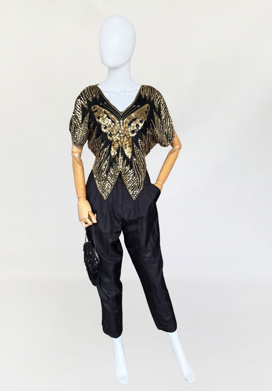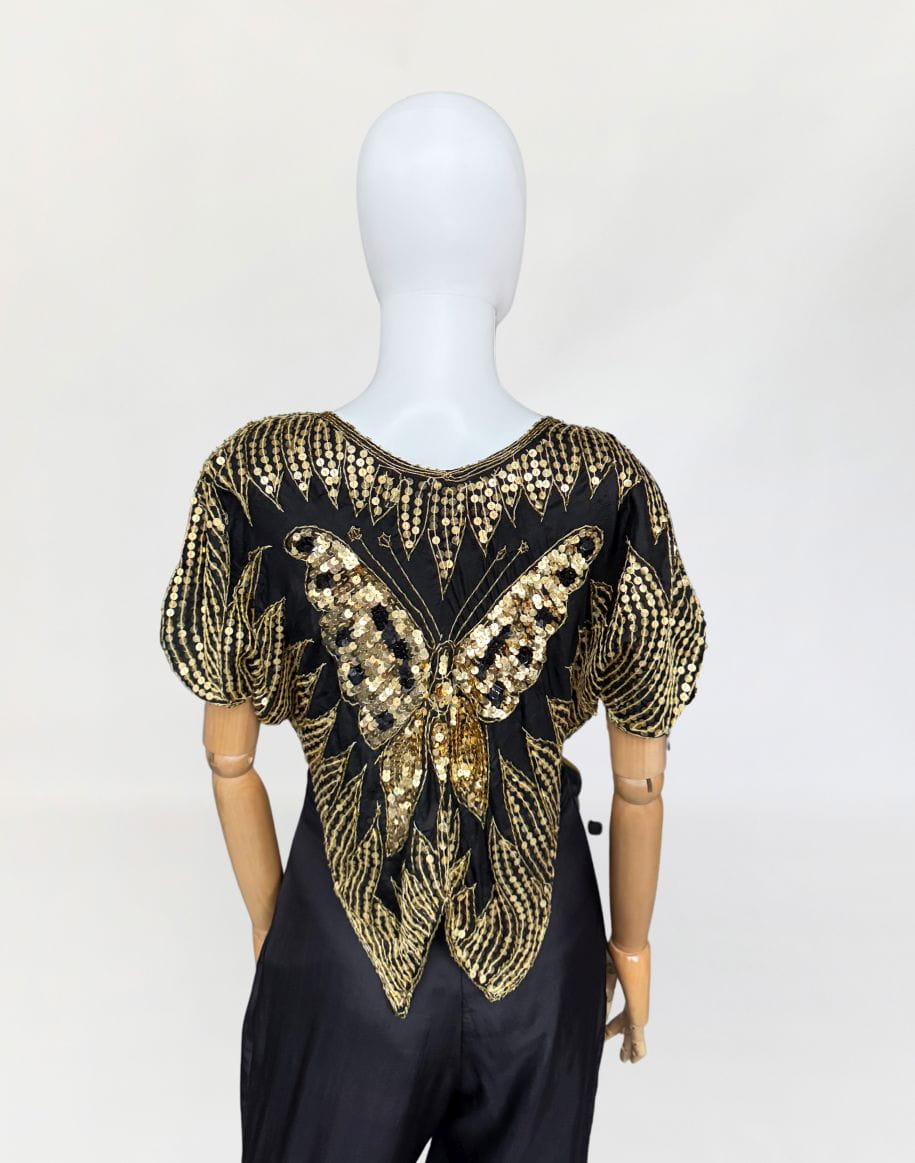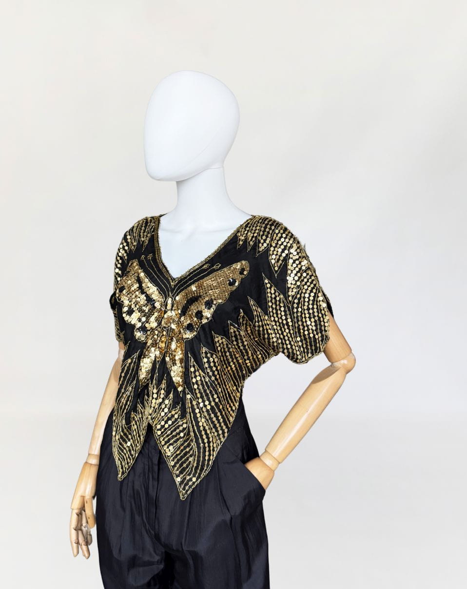 Indyjska bluzka/narzutka "motyl" true vintage z lat 70-tych/80-tych. Wykonana z jedwabnej tkaniny wyszywanej złotymi cekinami.