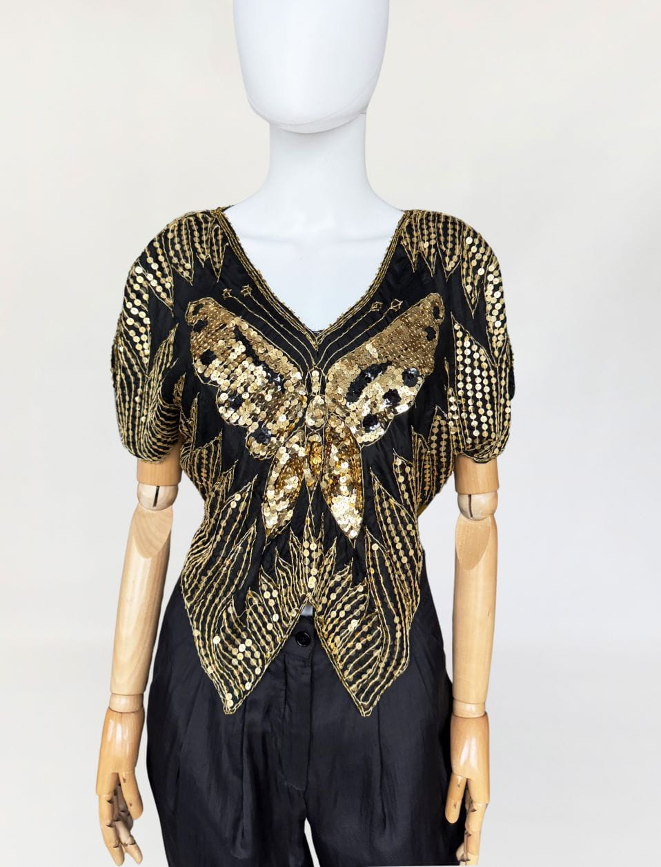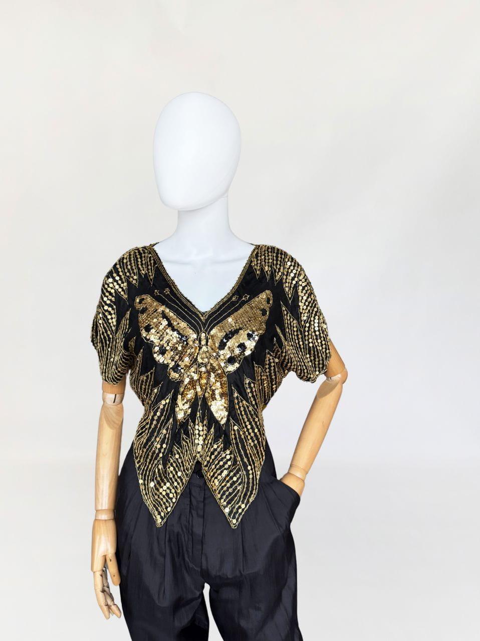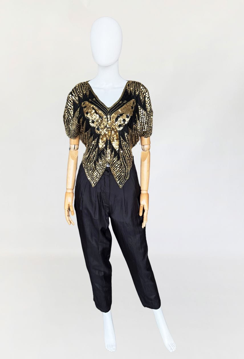 Indyjska bluzka/narzutka "motyl" true vintage z lat 70-tych/80-tych. Wykonana z jedwabnej tkaniny wyszywanej złotymi cekinami.