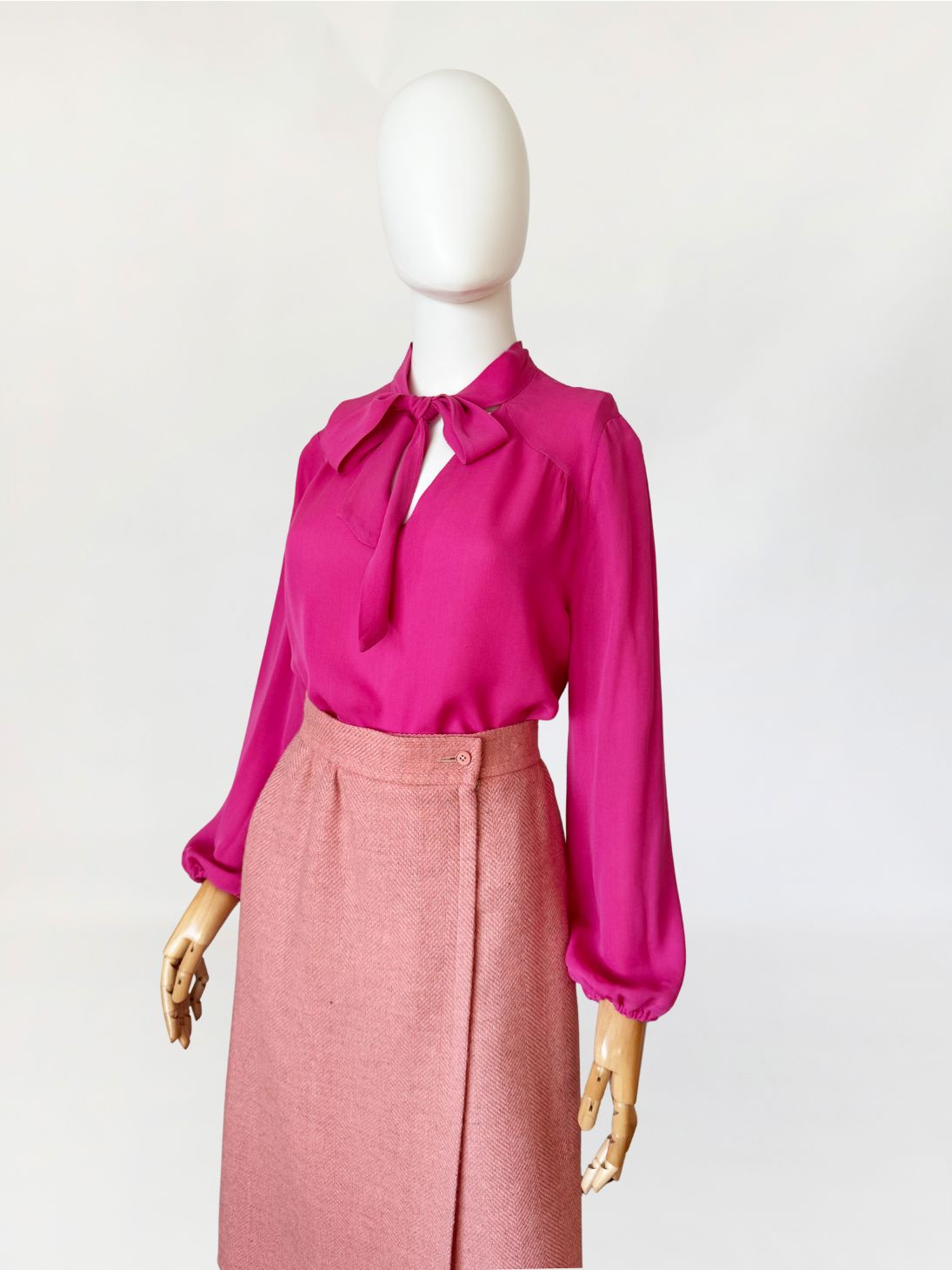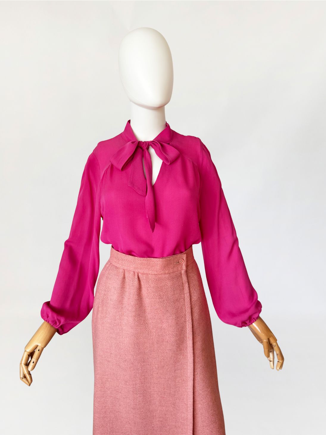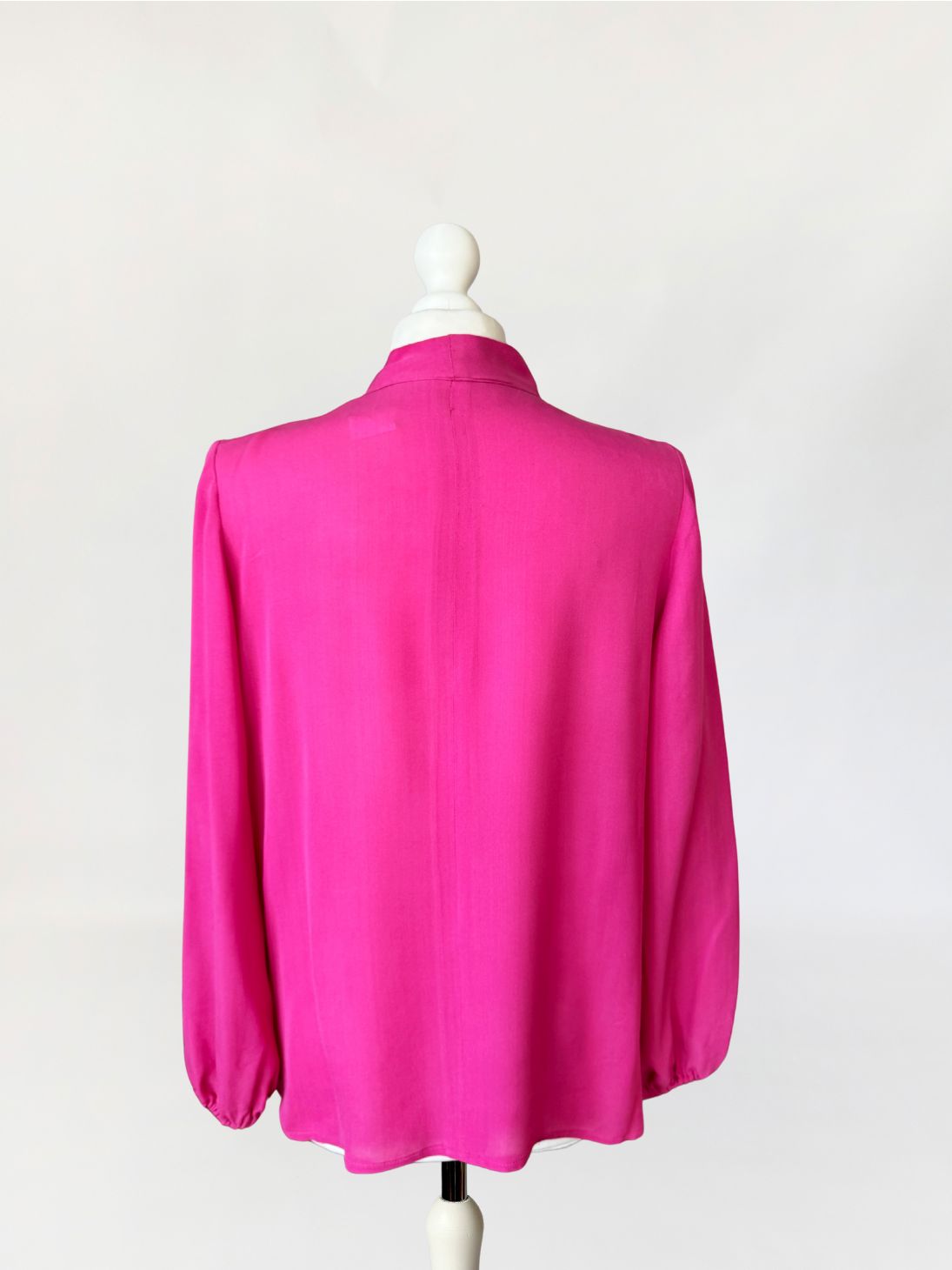 Koszula vintage z lat 70-tych w intensywnym różowym kolorze. Wykonana z jedwabnej delikatnie pętelkowej tkaniny o subtelnej fakturze. Model z wiązaniem pod szyją i luźniejszym fasonem z marszczeniami przy ramionach. Szerokie rękawy zakończone gumkami.