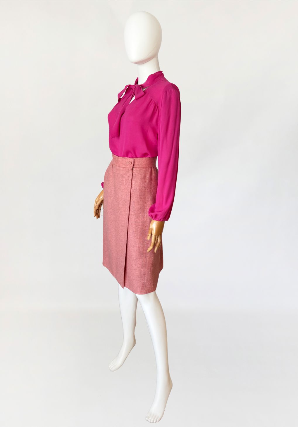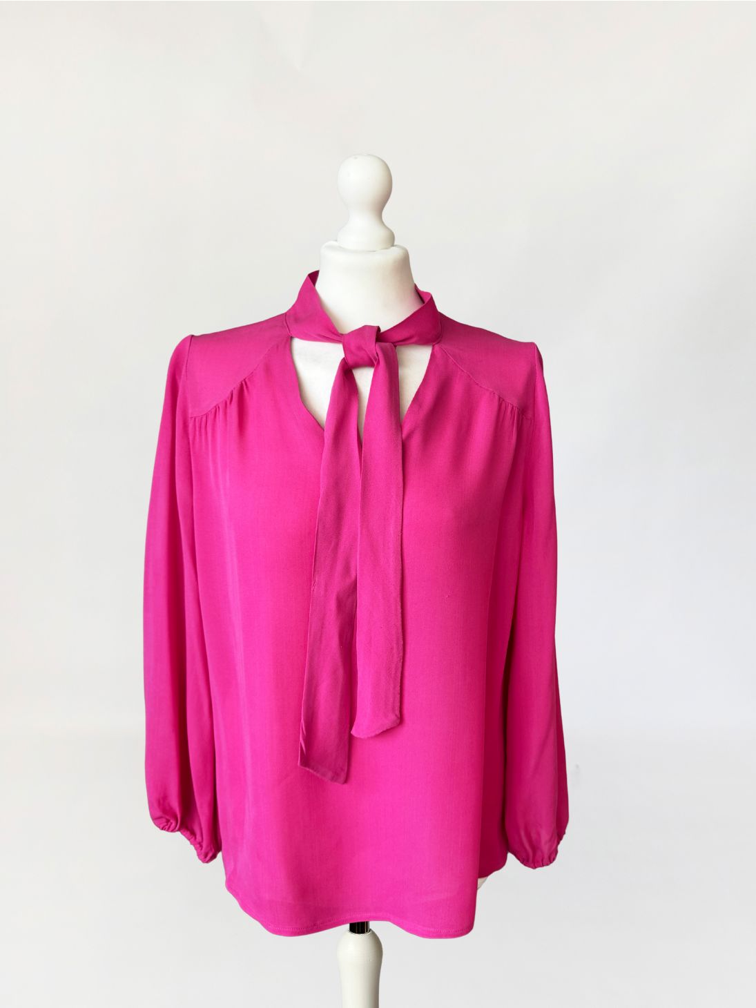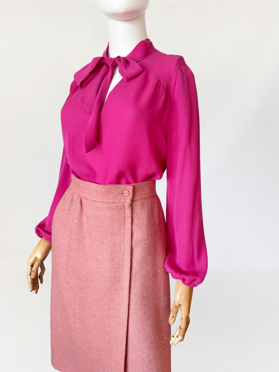 Koszula vintage z lat 70-tych w intensywnym różowym kolorze. Wykonana z jedwabnej delikatnie pętelkowej tkaniny o subtelnej fakturze. Model z wiązaniem pod szyją i luźniejszym fasonem z marszczeniami przy ramionach. Szerokie rękawy zakończone gumkami.