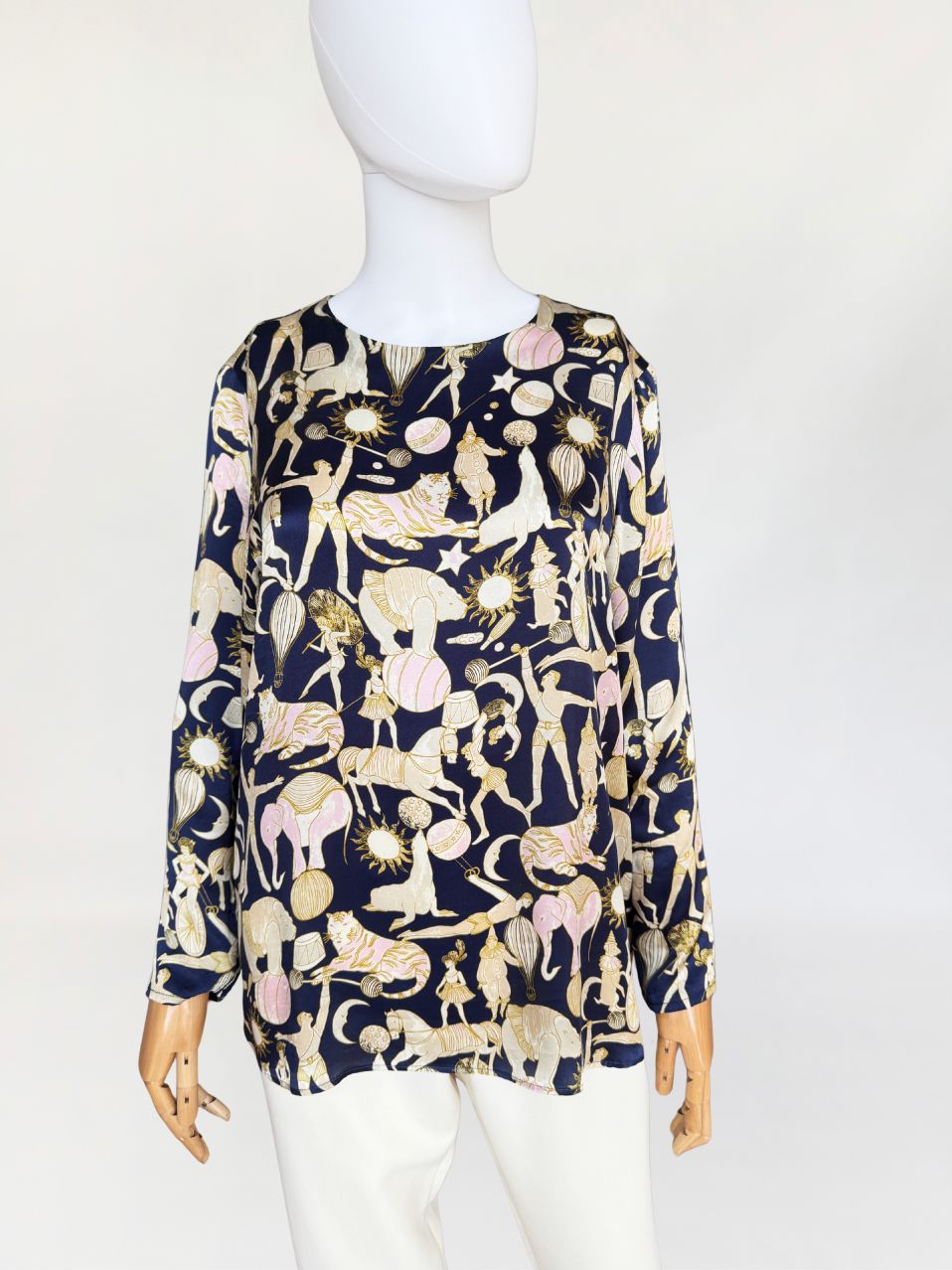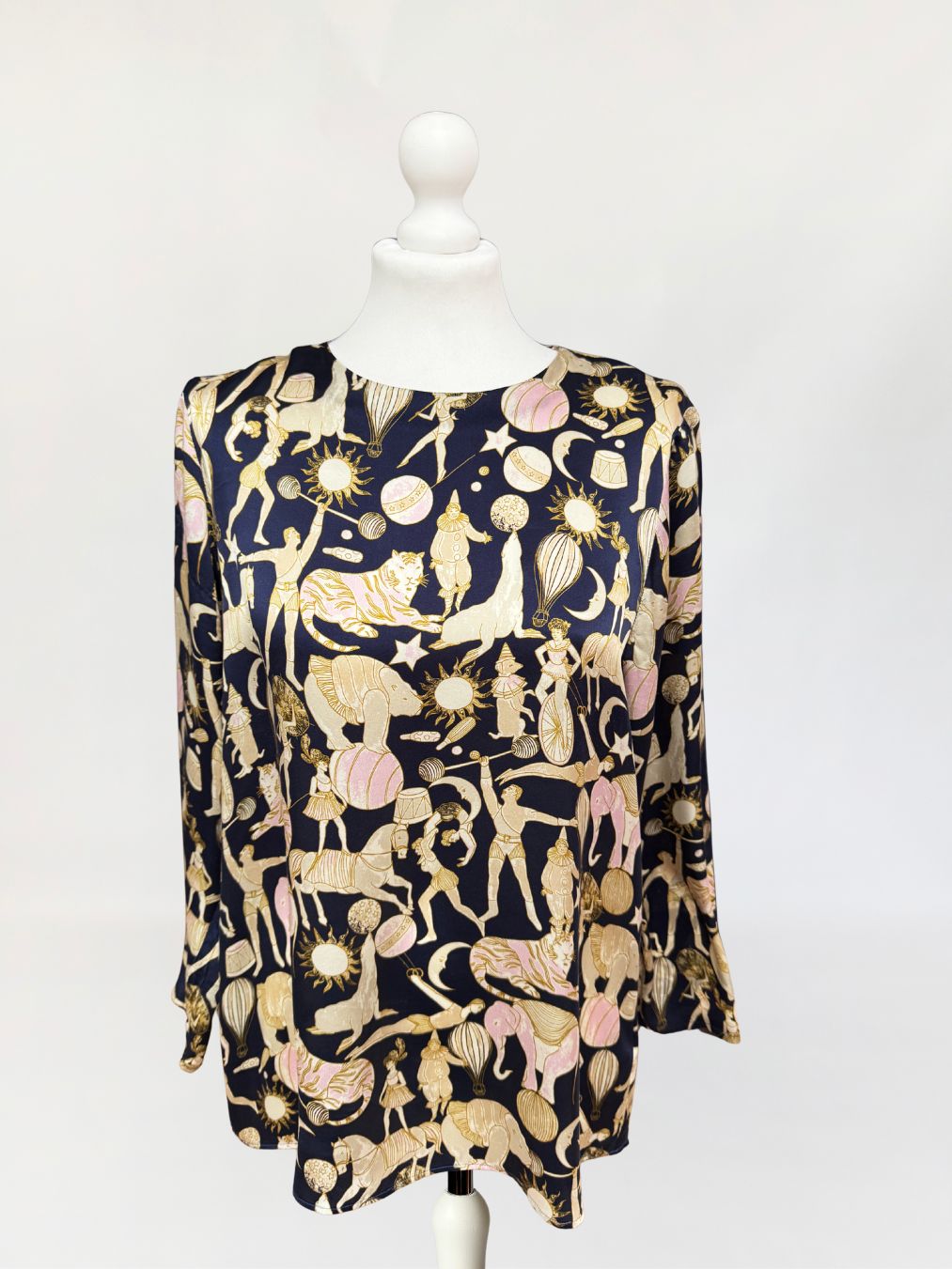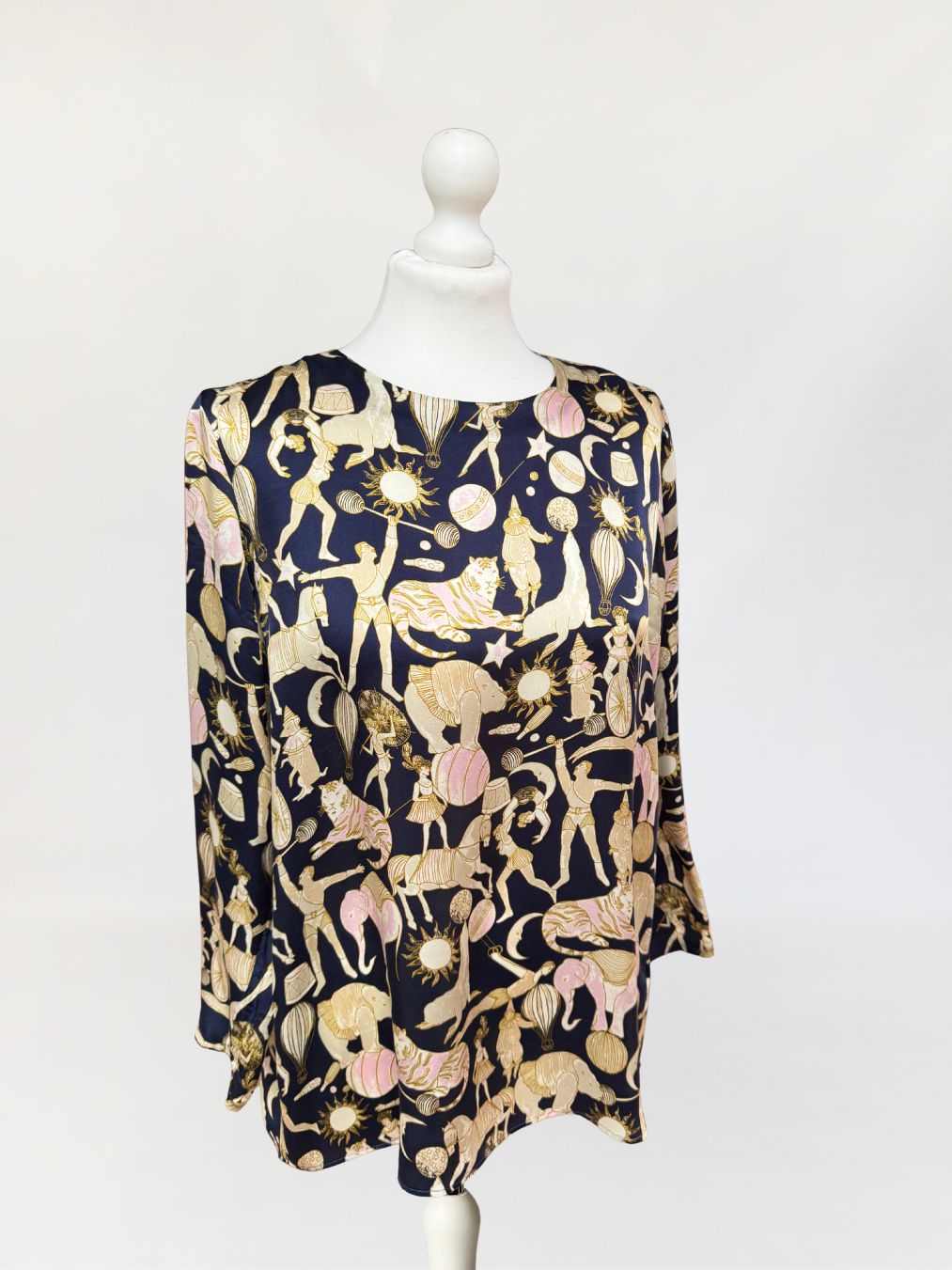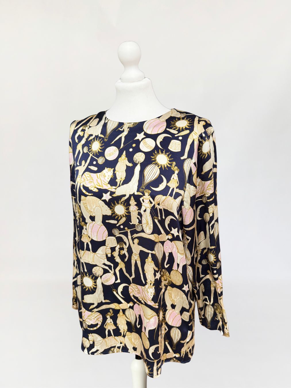 Bluzka luksusowej marki SØR wykonana z ultra-delikatnej jedwabnej satyny. Całość tkaniny pokryta magicznymi, fantazyjnymi printami inspirowanymi estetyką dawnego cyrku, przywołującymi skojarzenia z oprawą wizualną filmu "The Greatest Showman". Print przedstawia precyzyjnie zarysowane postacie akrobatów, połykaczy ognia, klaunów, egzotycznych zwierząt (m.in. fok, słoni, niedźwiedzi, psów na monocyklach, tygrysów) oraz inne sceniczne motywy. Kompozycja utrzymana w spójnej palecie granatu, pudrowego różu, beżu i złota. Model o klasycznym, lekko swobodnym kroju.