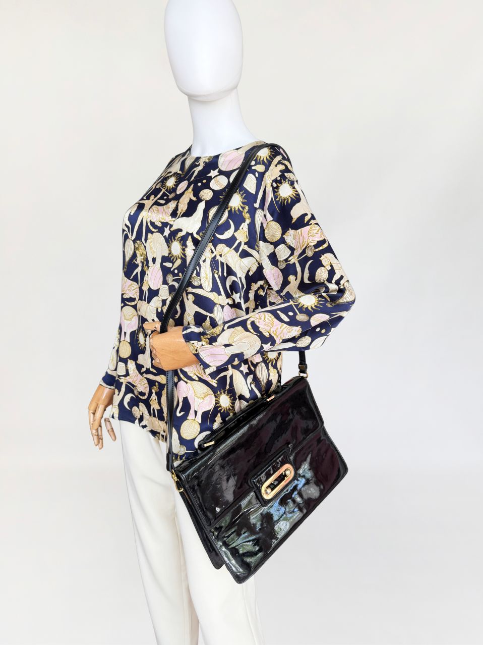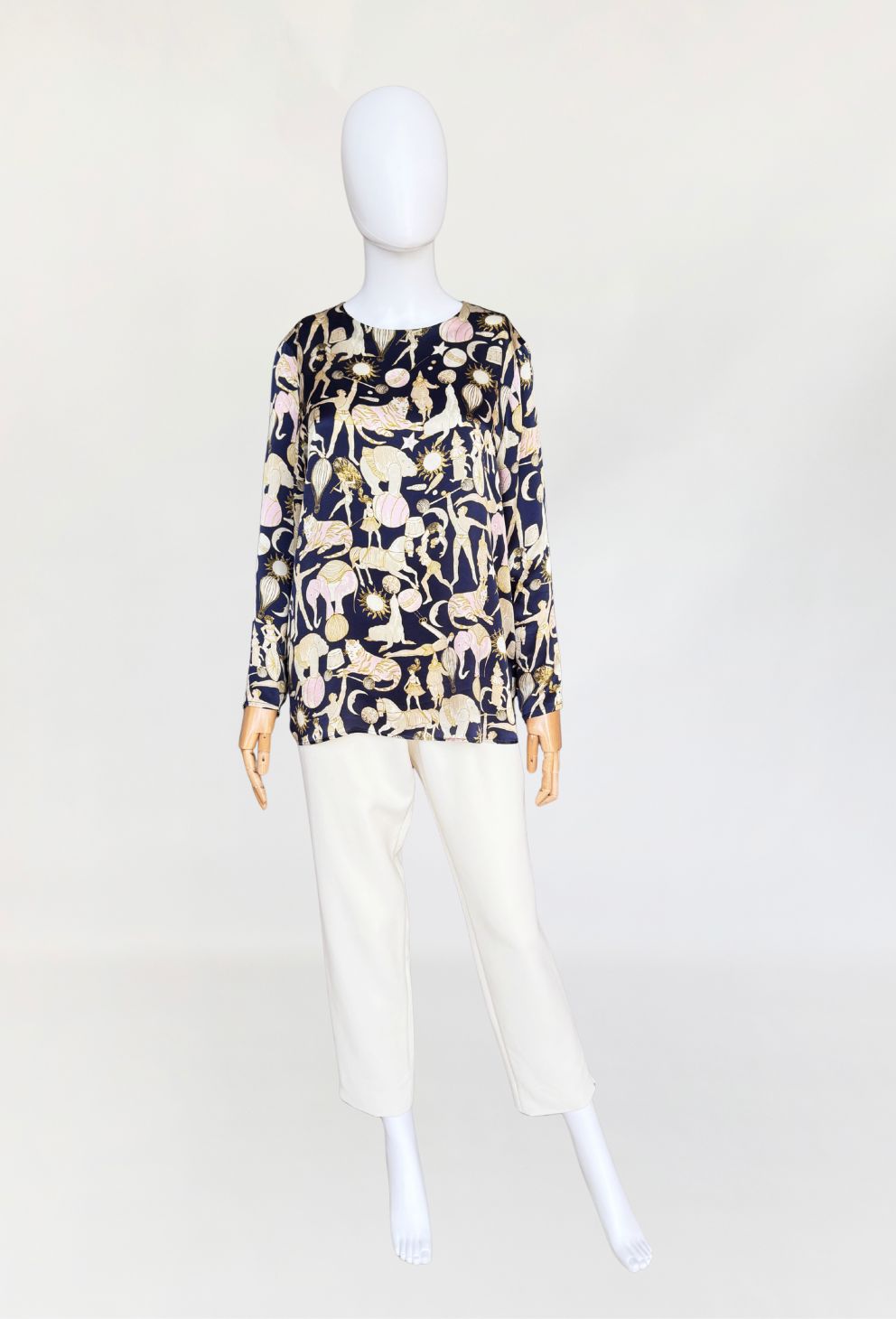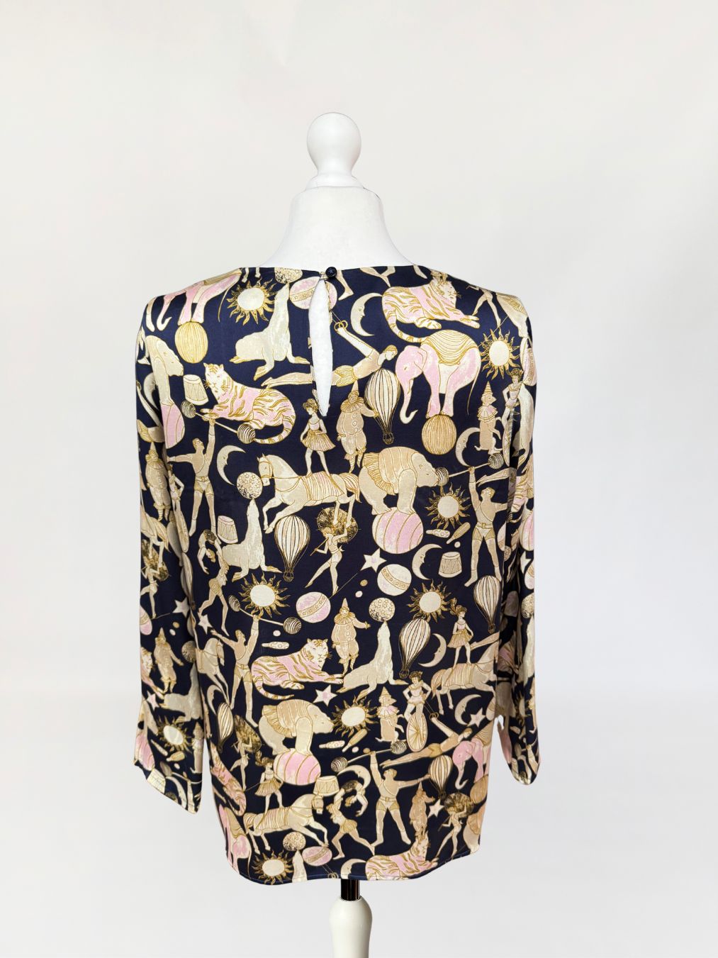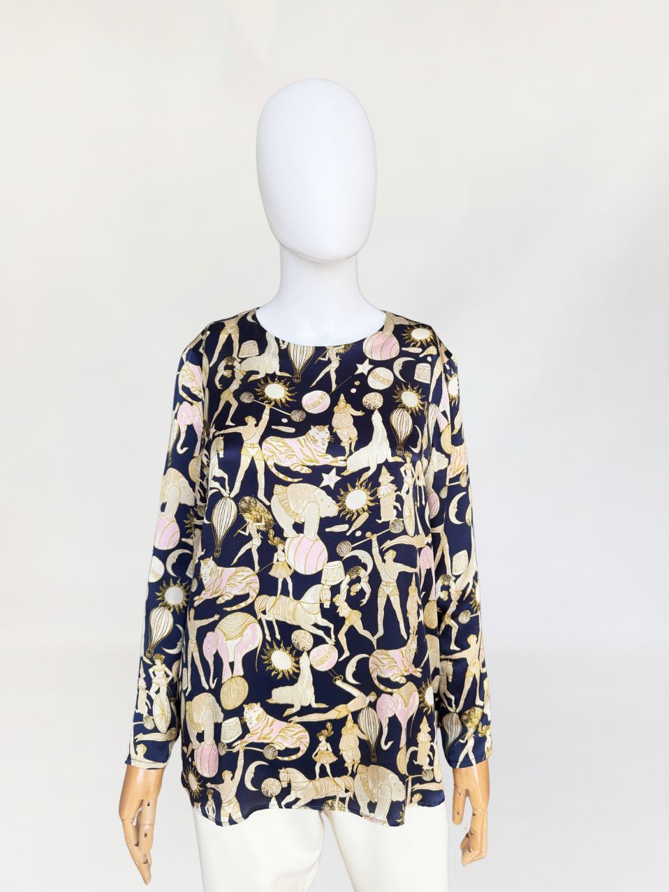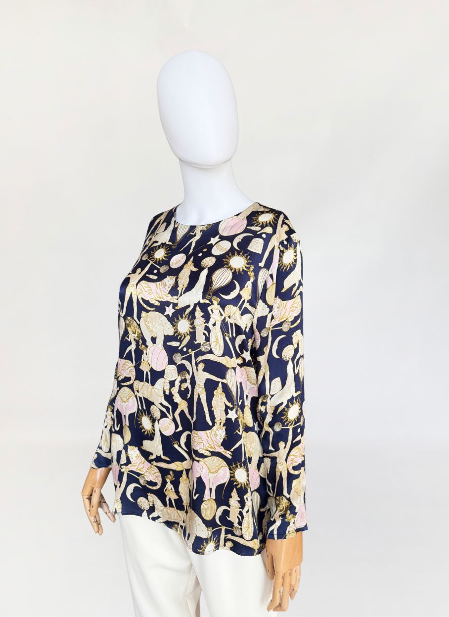 Bluzka luksusowej marki SØR wykonana z ultra-delikatnej jedwabnej satyny. Całość tkaniny pokryta magicznymi, fantazyjnymi printami inspirowanymi estetyką dawnego cyrku, przywołującymi skojarzenia z oprawą wizualną filmu "The Greatest Showman". Print przedstawia precyzyjnie zarysowane postacie akrobatów, połykaczy ognia, klaunów, egzotycznych zwierząt (m.in. fok, słoni, niedźwiedzi, psów na monocyklach, tygrysów) oraz inne sceniczne motywy. Kompozycja utrzymana w spójnej palecie granatu, pudrowego różu, beżu i złota. Model o klasycznym, lekko swobodnym kroju.