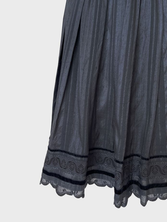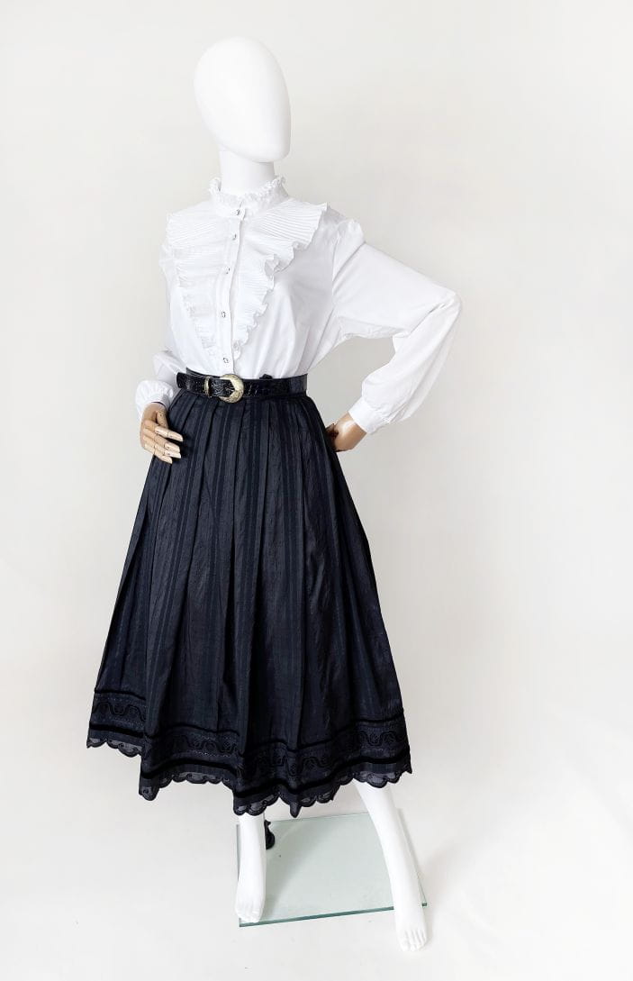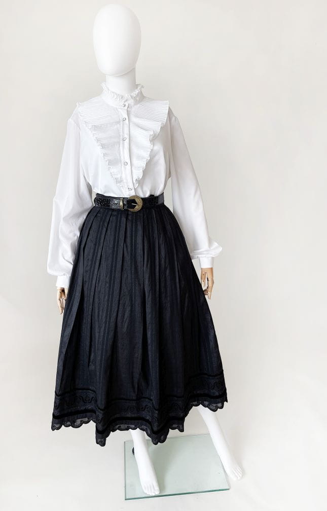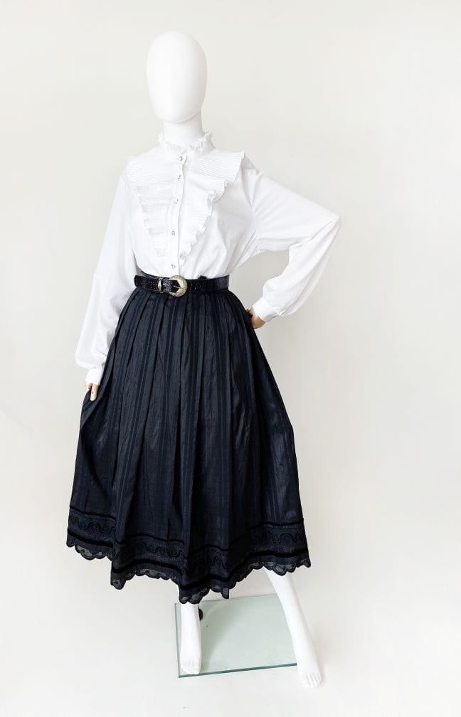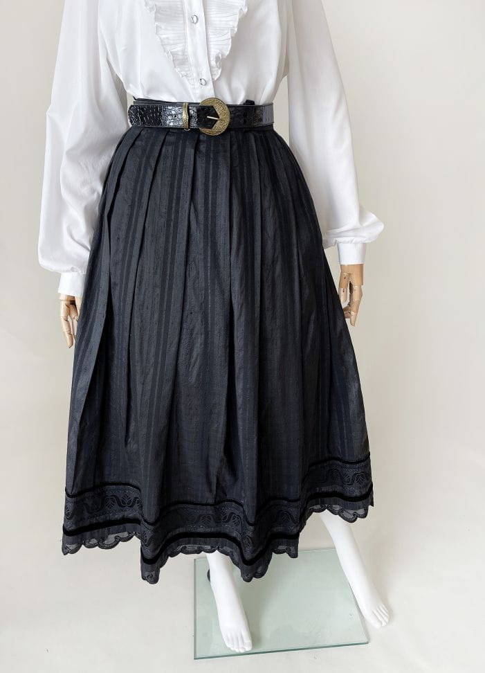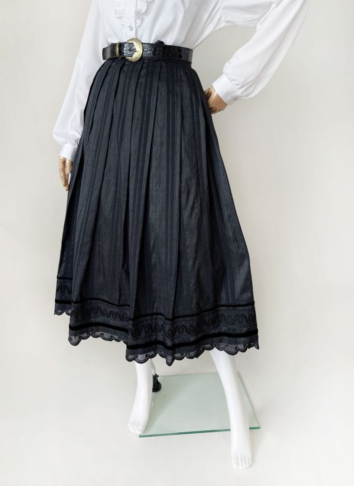 Spektakularna spódnica vintage, wykonana z jedwabnego szantungu w kolorze czarnym. Wyjątkowy model sprzed kilkudziesięciu lat w stylu (nie)dyskretnej elegancji. Na całość zużyto naprawdę dużo świetnej jakości jedwabiu. Spódnica ma mocno rozkloszowany, zamaszysty fason o długości do ok. połowy łydki. U dołu została wykończona żakardową taśmą i nieco cieńszymi - aksamitnymi tasiemkach - wszystko także w czerni. Całość robi ogromne wrażenie. Spódnica zachowała się w doskonałym stanie, wygląda świeżo i efektownie, jedwab nie posiada żadnych mankamentów.