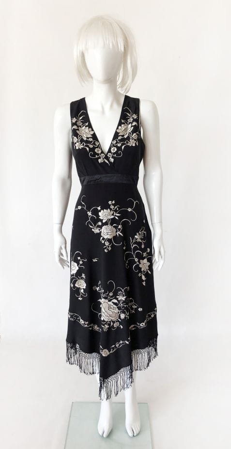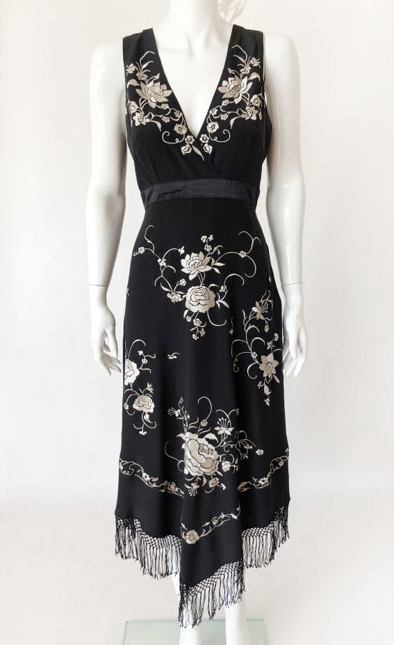 Jedwabna haftowana sukienka z frędzlami