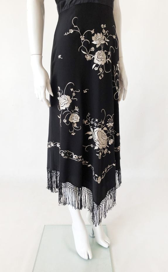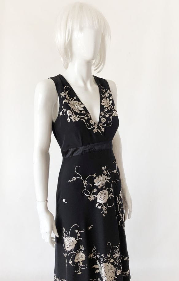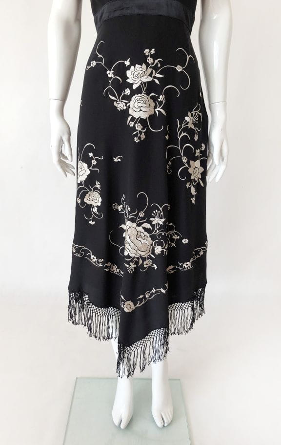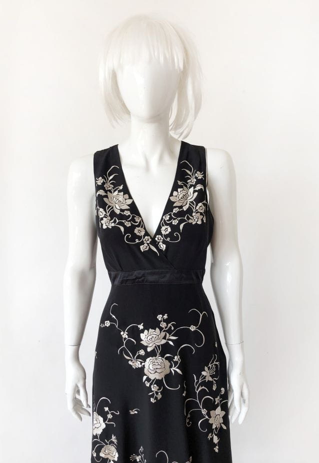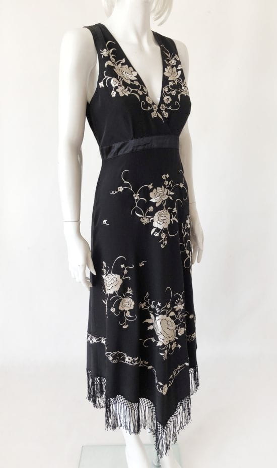 Czarna jedwabna sukienka marki Wallis. Pokryta kontrastowymi haftowanymi aplikacjami. Dół wykończony frędzlami. Model z podszewką z acetatu.