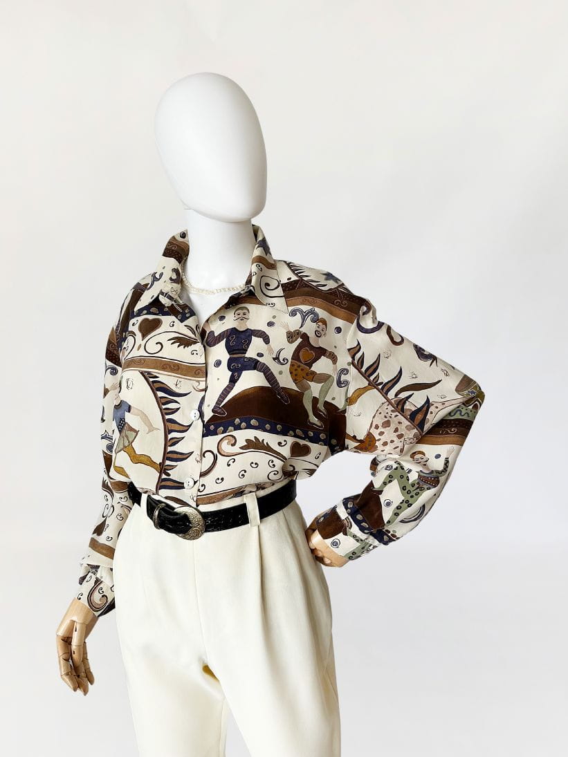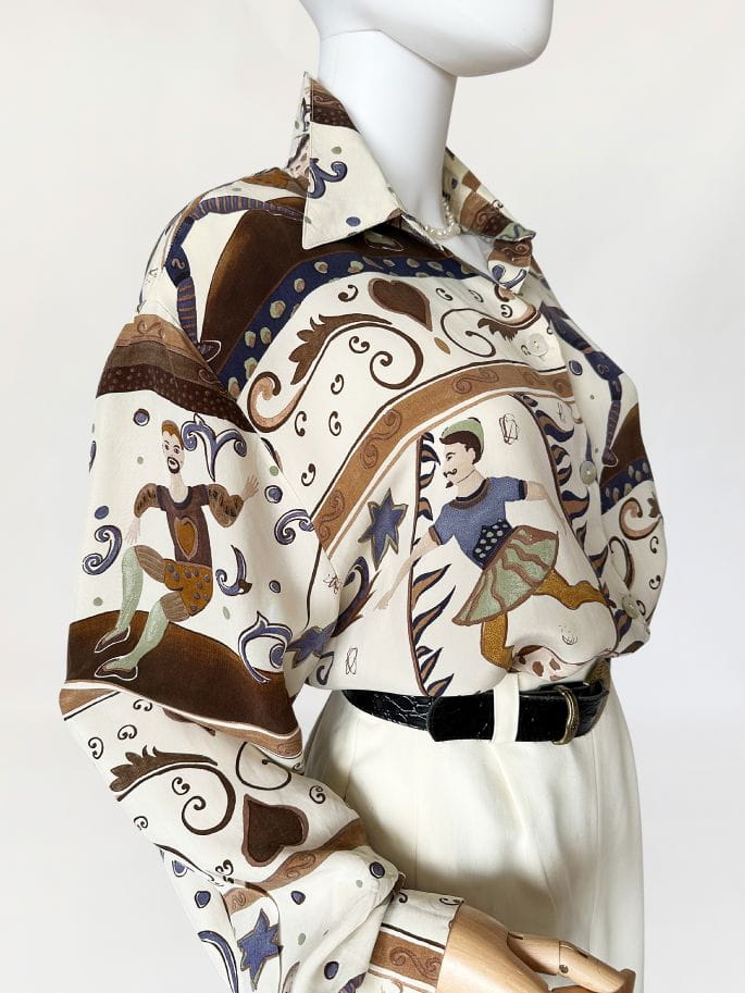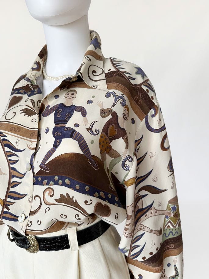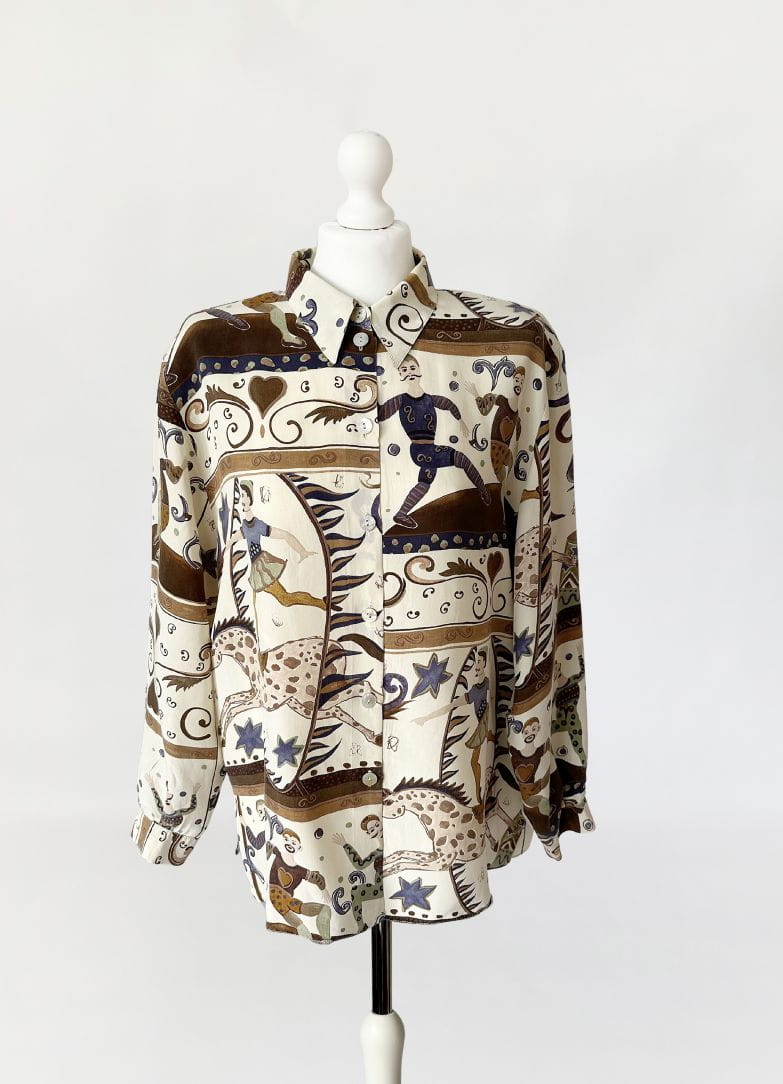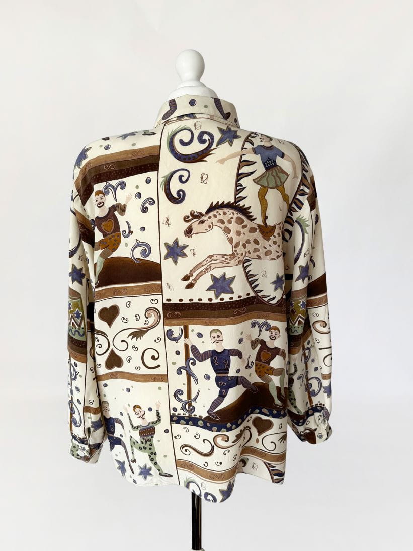 Unikatowa koszula vintage wykonana z naturalnego jedwabiu w kolorowe wzory w motyw cyrkowy (postaci akrobatów, sztukmistrzów, zwierząt, oraz mix mniejszych wzorów). /Klasyczny fason z długimi rękawami. W ramionach poduszki (do ewentualnego łatwego usunięcia) Zapinana na drobne guziki z masy perłowej.