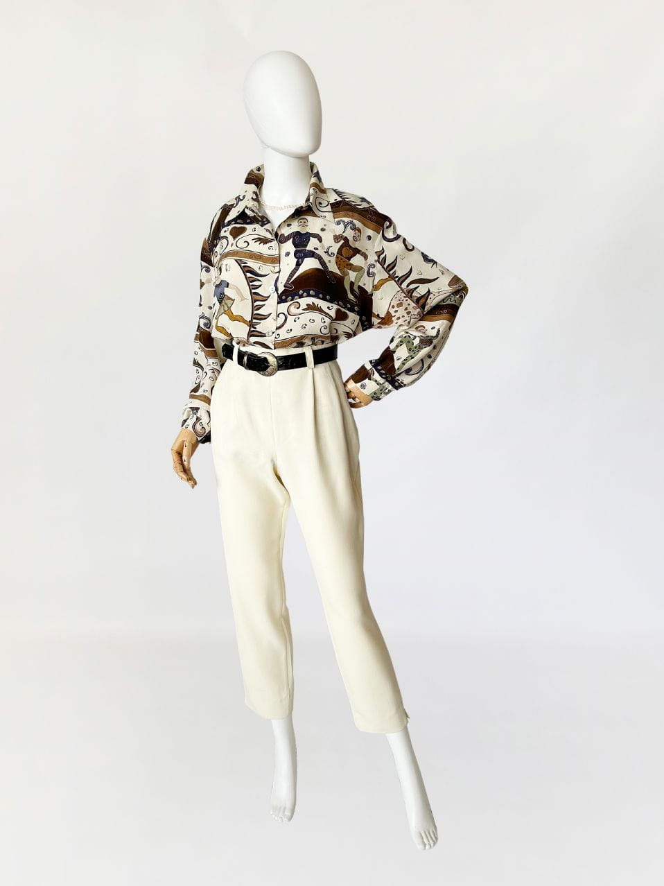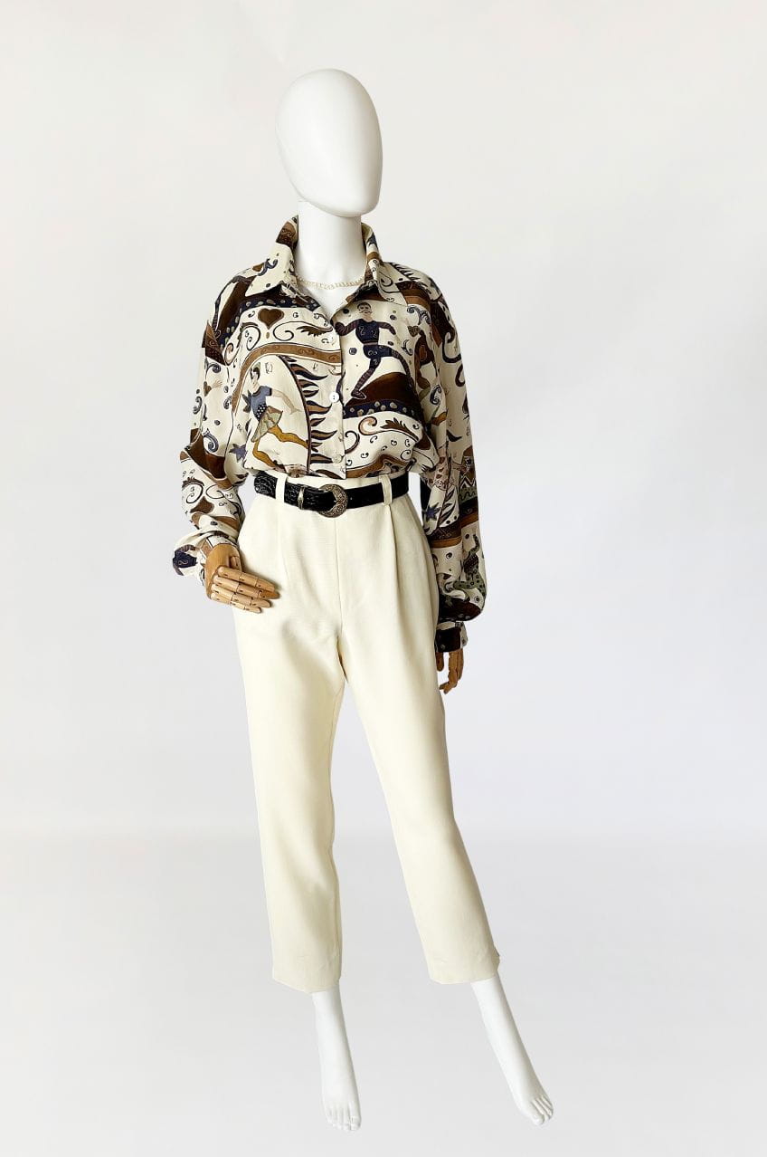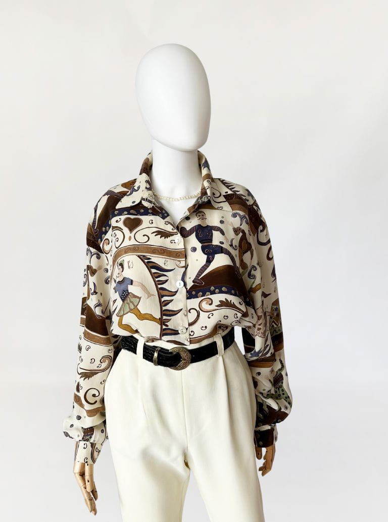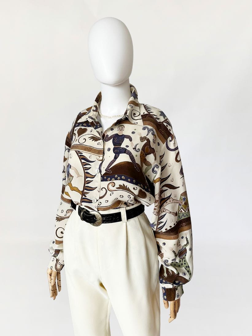 Unikatowa koszula vintage wykonana z naturalnego jedwabiu w kolorowe wzory w motyw cyrkowy (postaci akrobatów, sztukmistrzów, zwierząt, oraz mix mniejszych wzorów). /Klasyczny fason z długimi rękawami. W ramionach poduszki (do ewentualnego łatwego usunięcia) Zapinana na drobne guziki z masy perłowej.