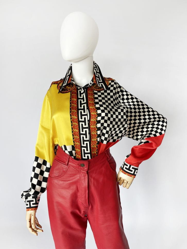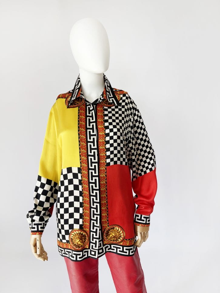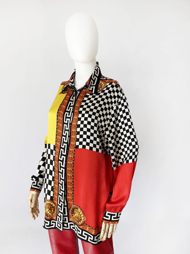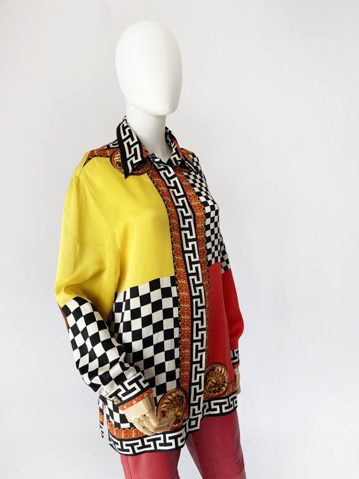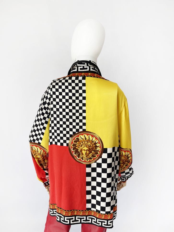 Włoska jedwabna koszula o deseniu przypominającym motywy włoskich domów mody. Prosty fason z długimi rękawami. Zapinana na guziki z masy perłowej ukryte pod materiałową listwą.