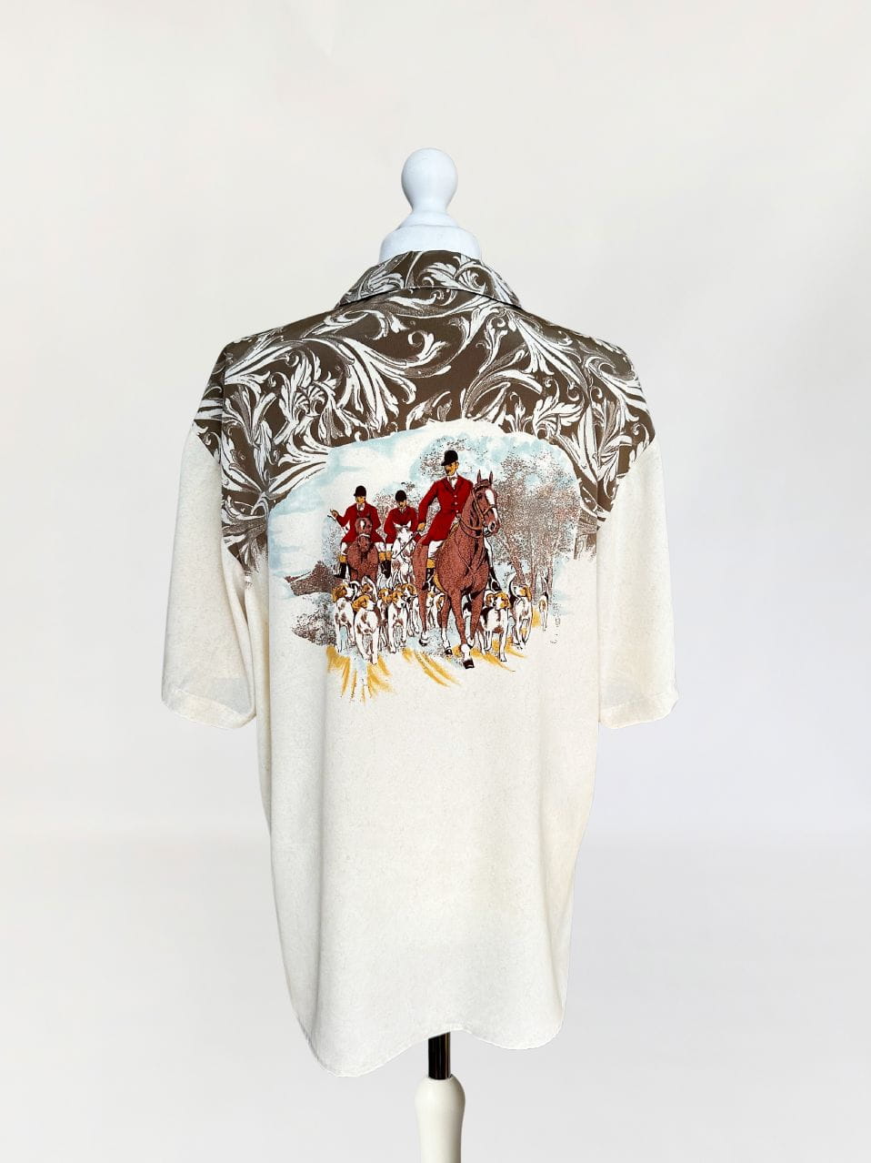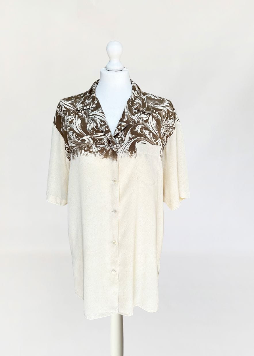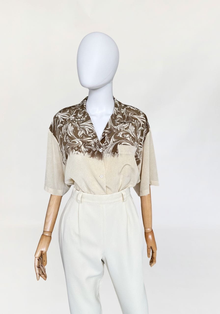 Włoska koszula vintage uszyta z delikatnej, (naszym zdaniem) jedwabnej tkaniny we wzory, ornamenty i myśliwskie scenki. Swobodny fason z krótkimi rękawami,