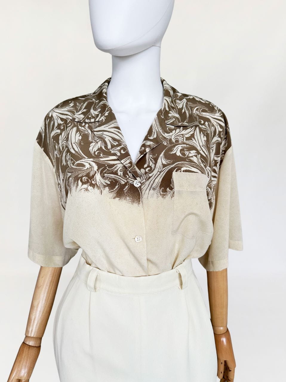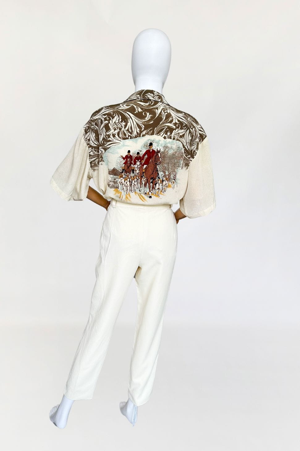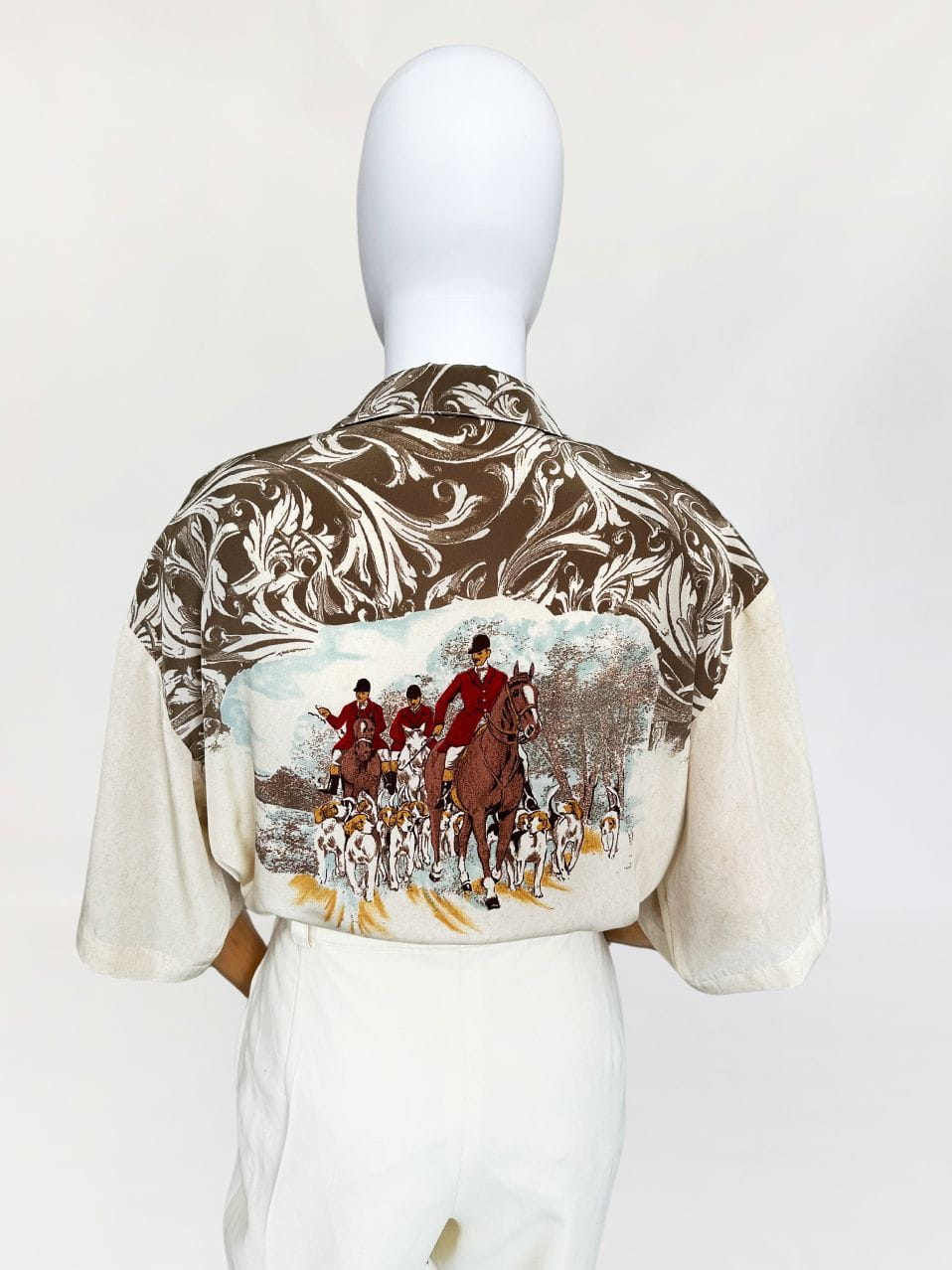 Włoska koszula vintage uszyta z delikatnej, (naszym zdaniem) jedwabnej tkaniny we wzory, ornamenty i myśliwskie scenki. Swobodny fason z krótkimi rękawami,