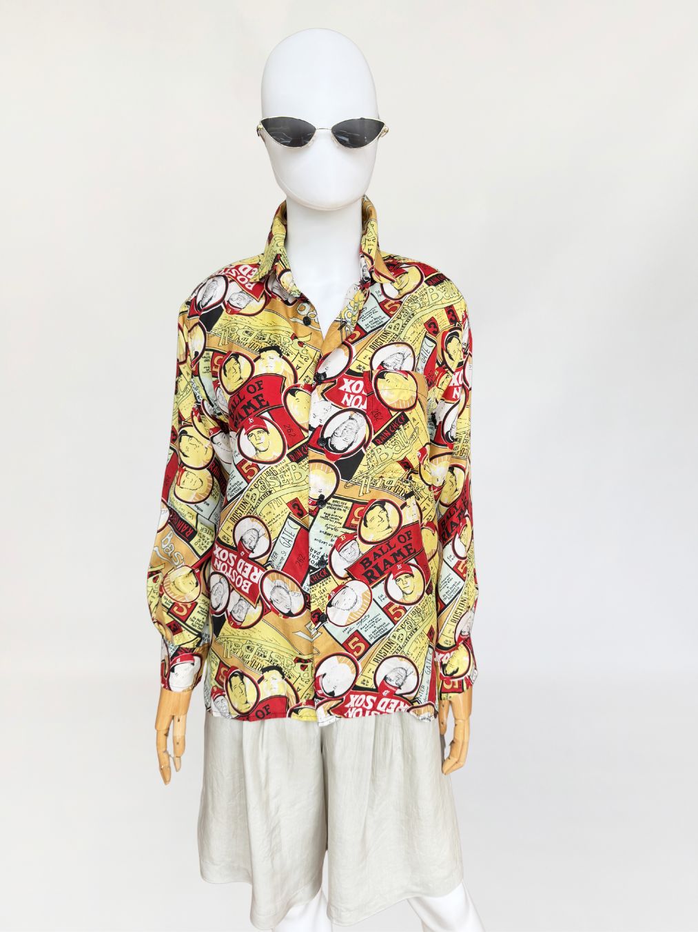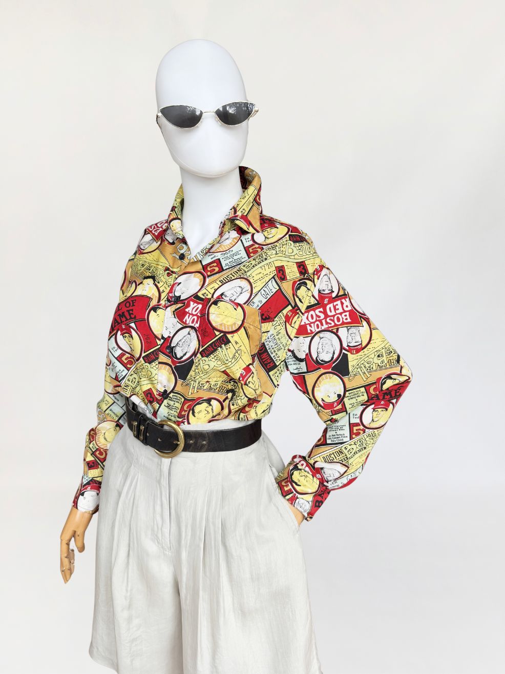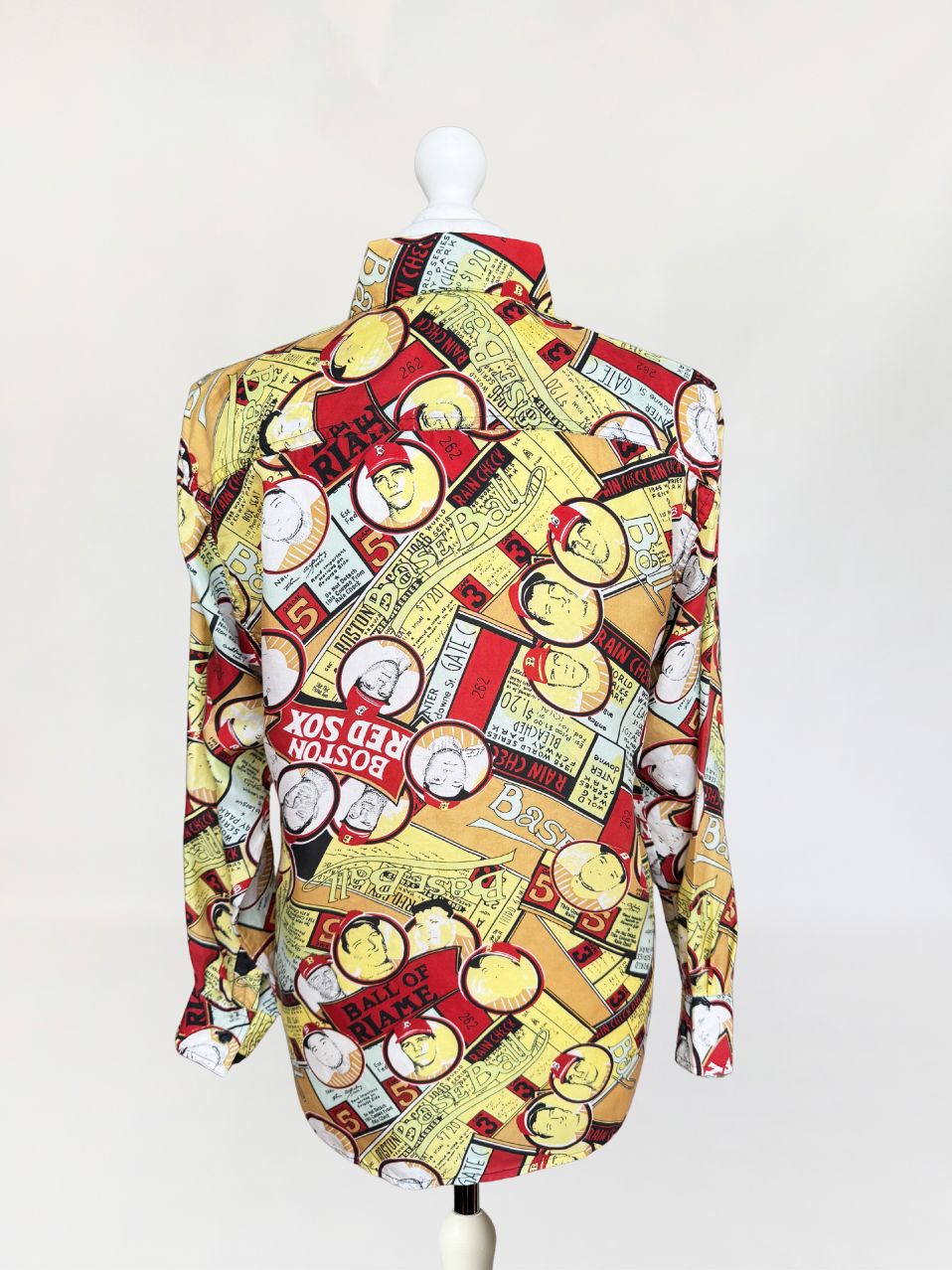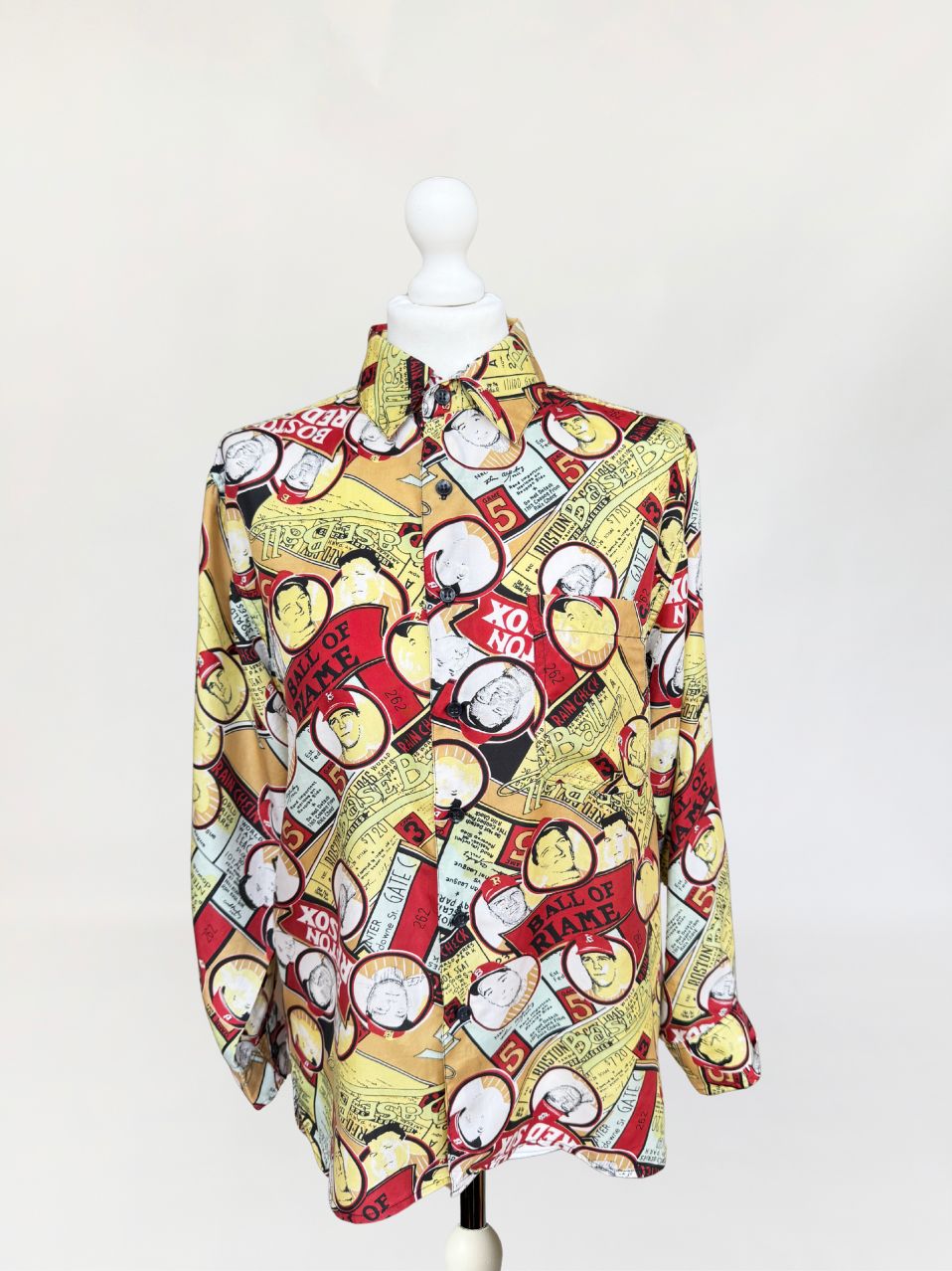Koszula true vintage uszyta z jedwabnej satyny o gładkiej, zwartej strukturze. Tkanina zadrukowana graficznym wzorem w stylistyce pop-art, z motywami odnoszącymi się do drużyny baseballowej Red Sox. Taliowany fason z klasycznym kołnierzem i długimi rękawami zakończonymi mankietami zapinanymi na guziki. W górnej partii naszywana kieszeń. Zapięcie frontowe na guziki.