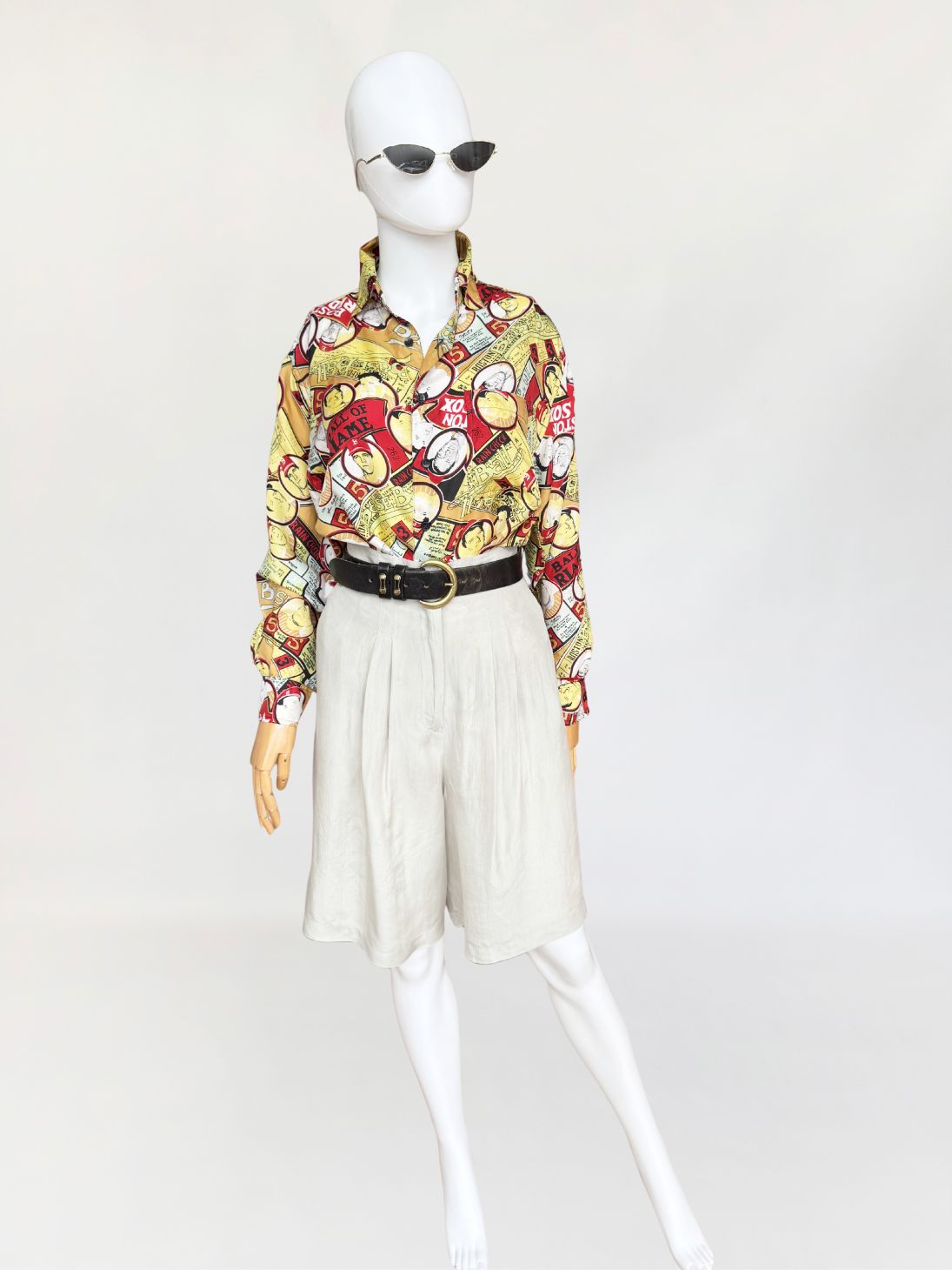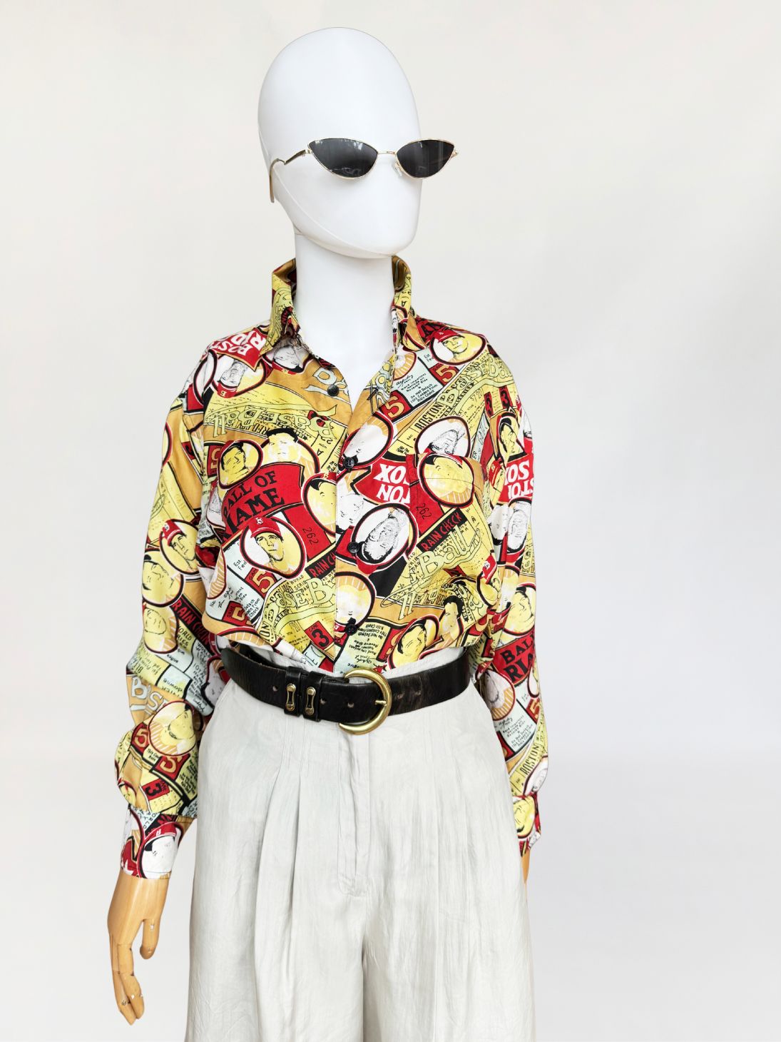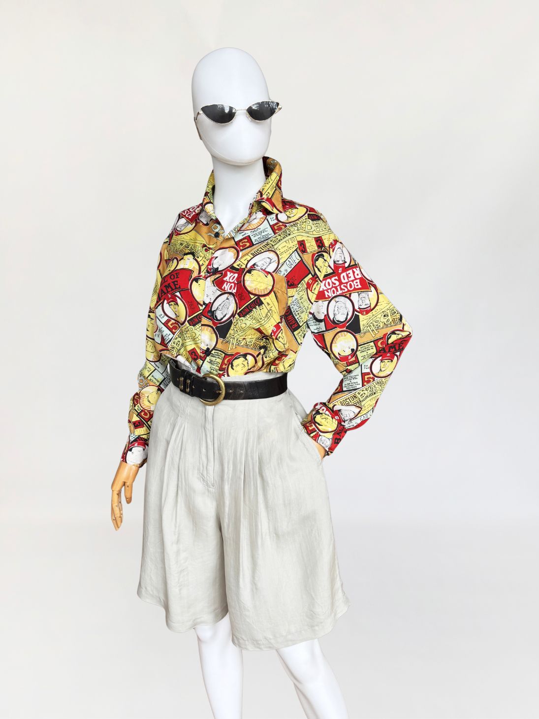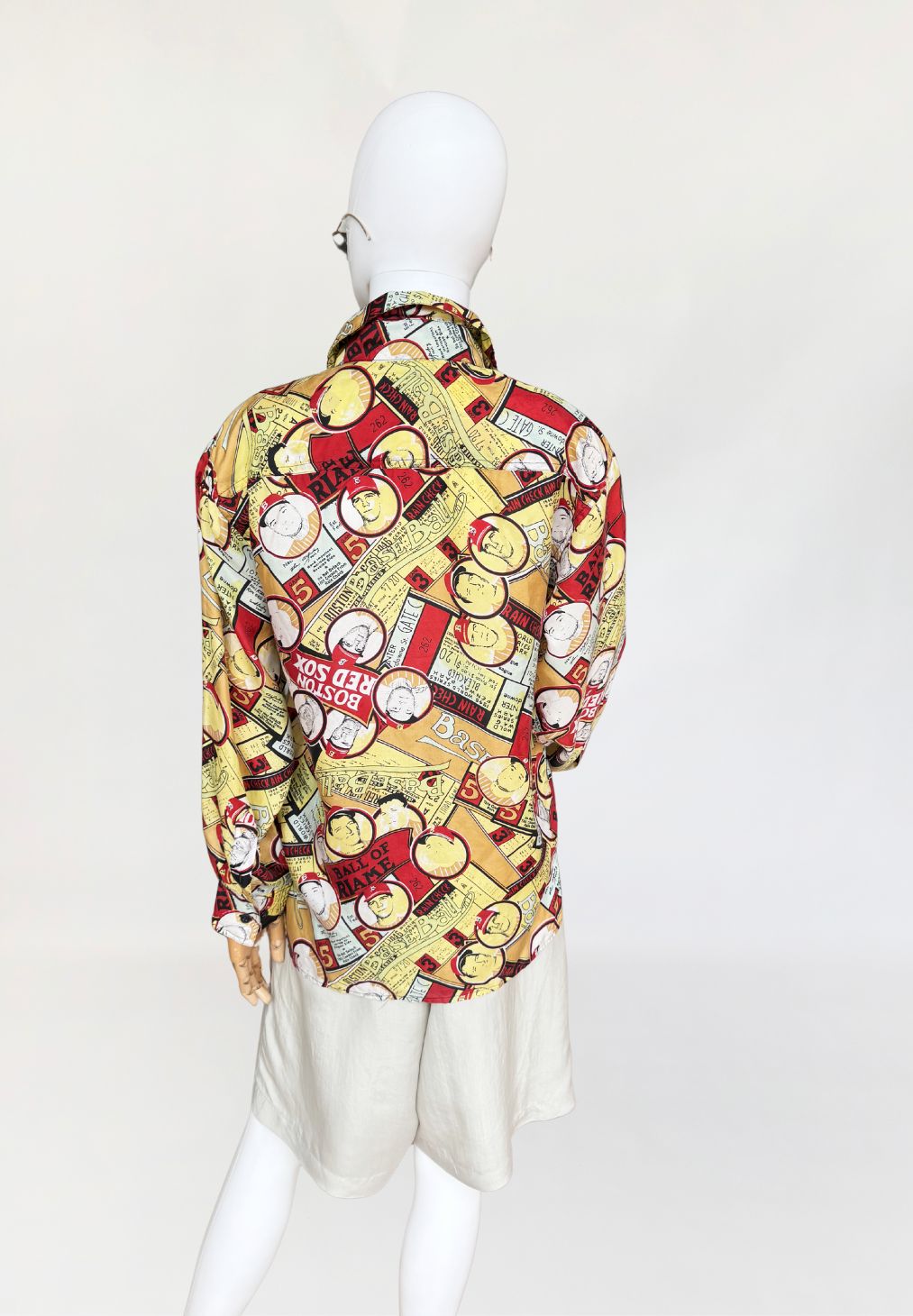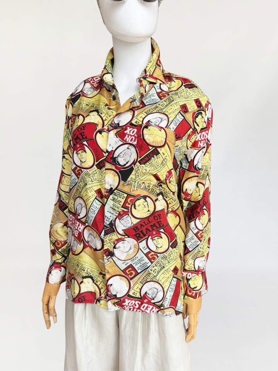 Koszula true vintage uszyta z jedwabnej satyny o gładkiej, zwartej strukturze. Tkanina zadrukowana graficznym wzorem w stylistyce pop-art, z motywami odnoszącymi się do drużyny baseballowej Red Sox. Taliowany fason z klasycznym kołnierzem i długimi rękawami zakończonymi mankietami zapinanymi na guziki. W górnej partii naszywana kieszeń. Zapięcie frontowe na guziki.