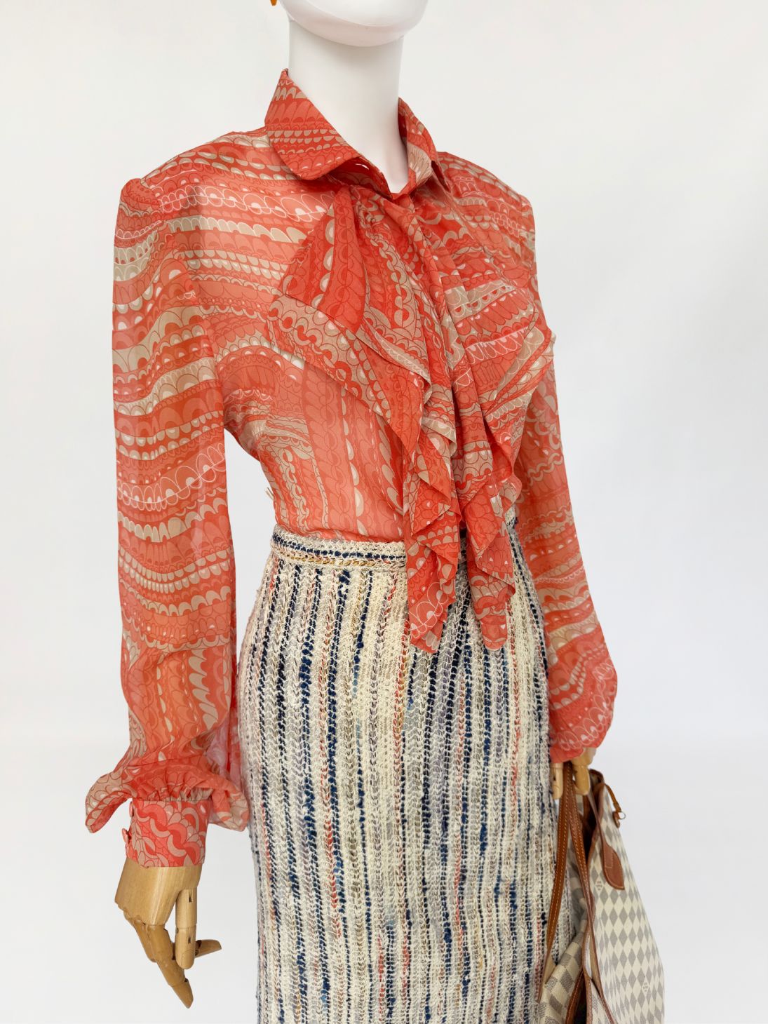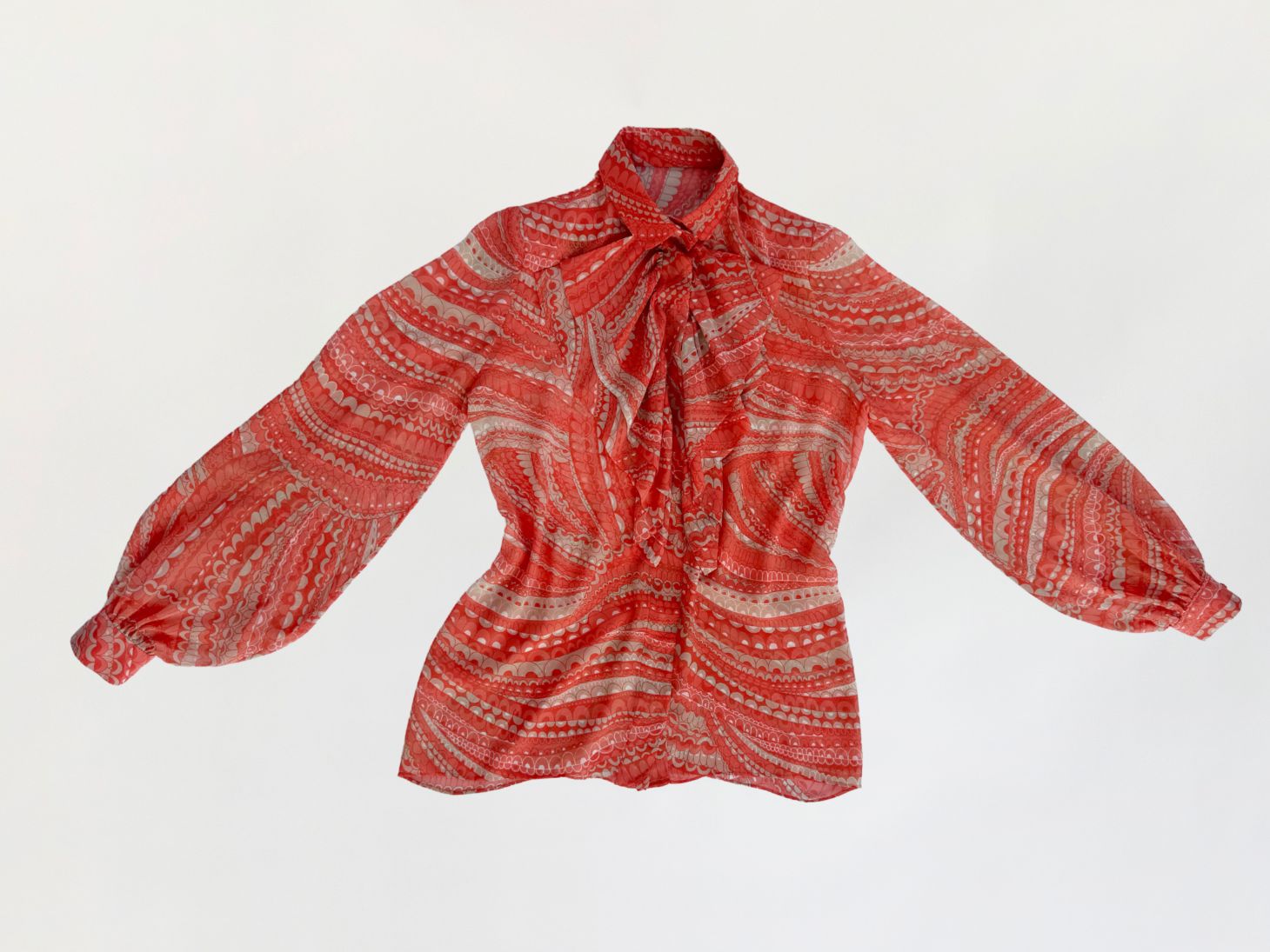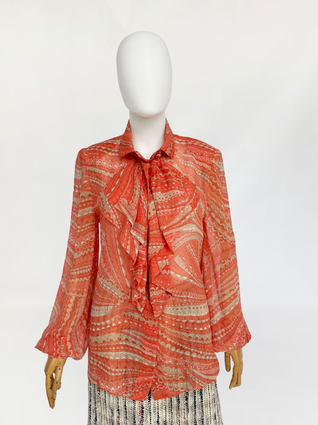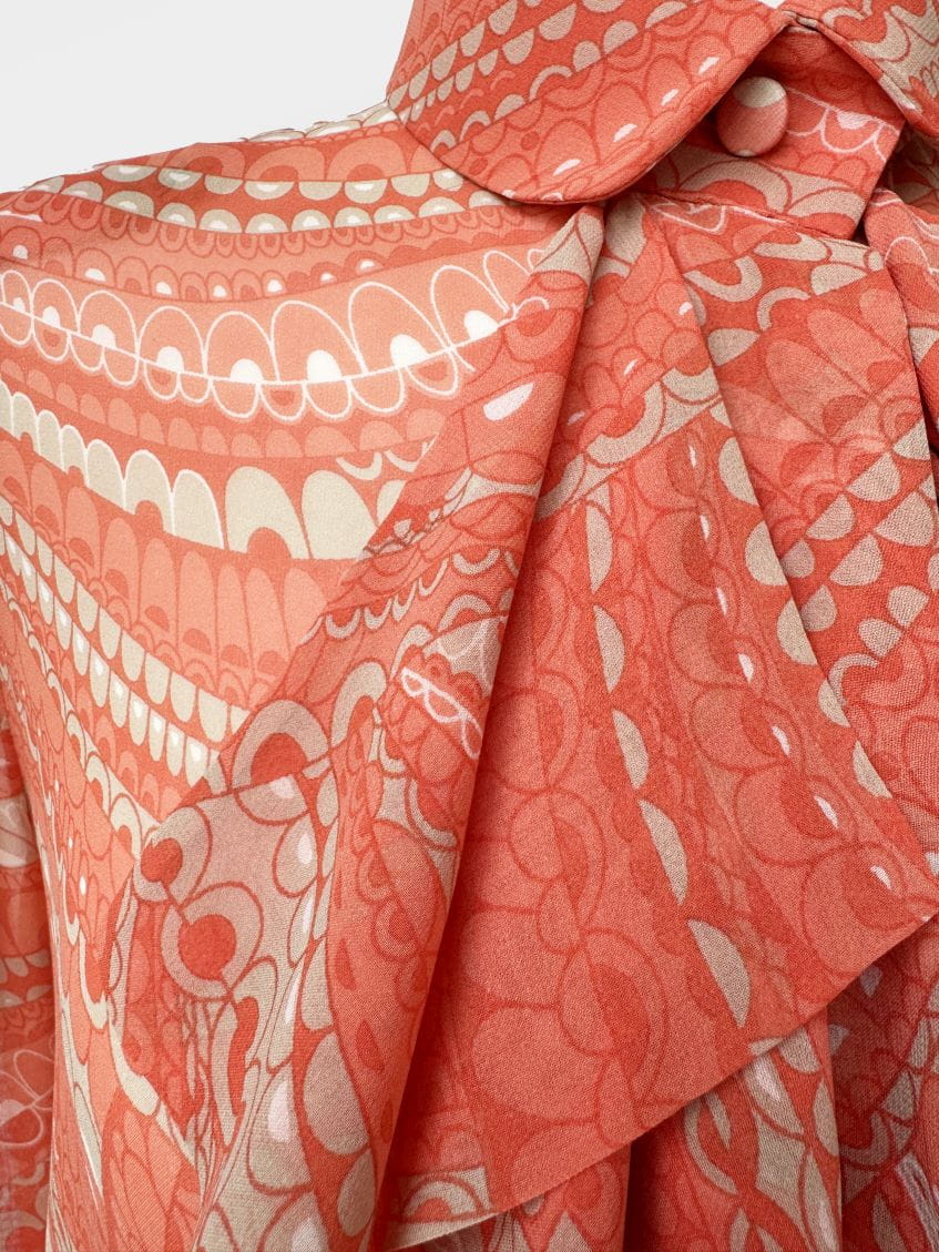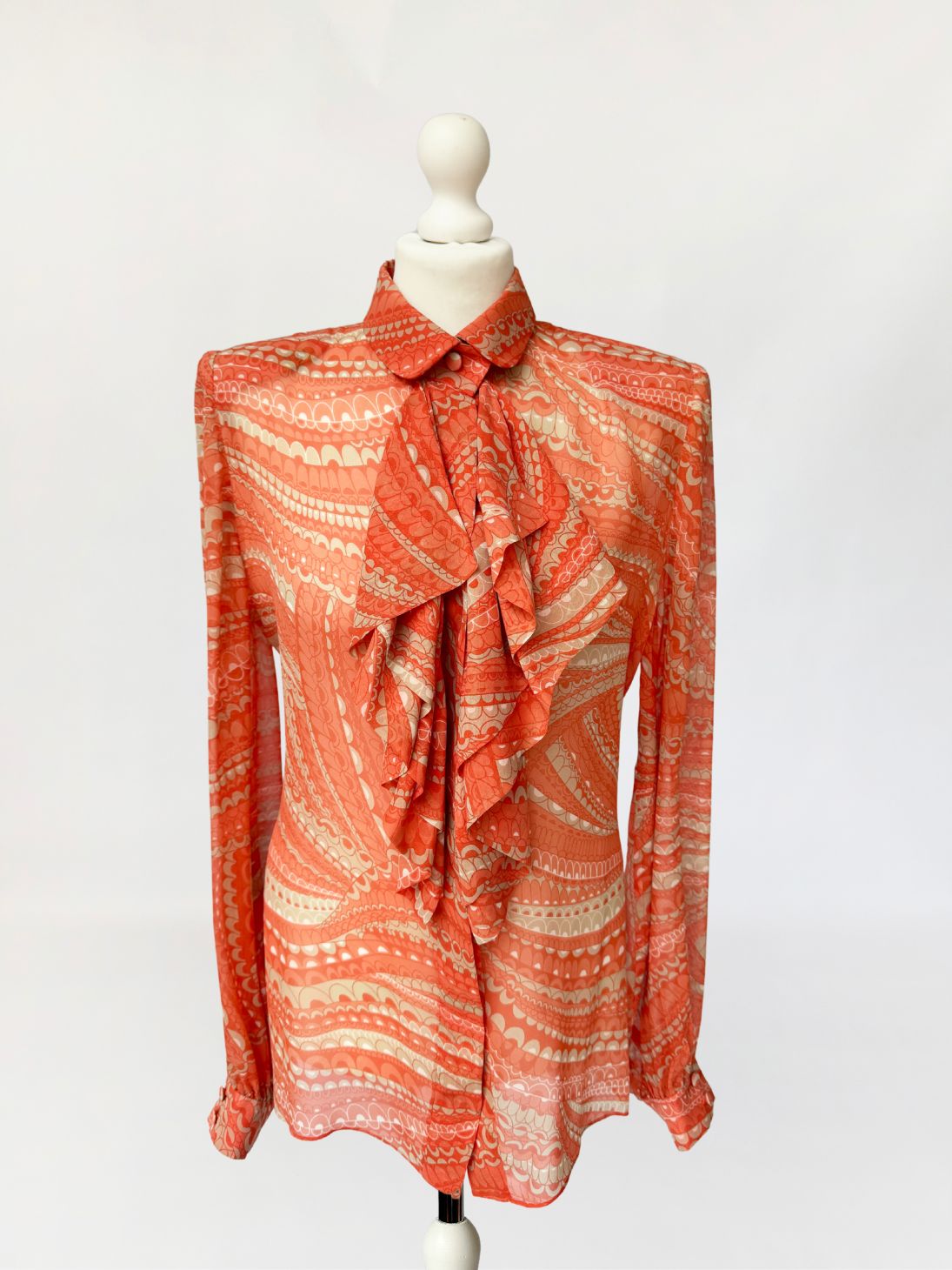 Koszula true vintage w stylu lat 70-tych o przedłużonym fasonie, wykonana z delikatnego jedwabnego szyfonu. Tkanina drukowana w drobny, dekoracyjny deseń w stonowanej palecie kolorystycznej: zgaszona pomarańcza, beż, taupe. Model o klasycznej konstrukcji z długimi, charakterystycznymi dla dekady biskupimi rękawami zakończonymi mankietami. W górnej części wykończony efektownym, wielowarstwowym żabotem o falbaniastej formie. Zapięcie na powlekane jedwabiem guziki pod krytą listwą.