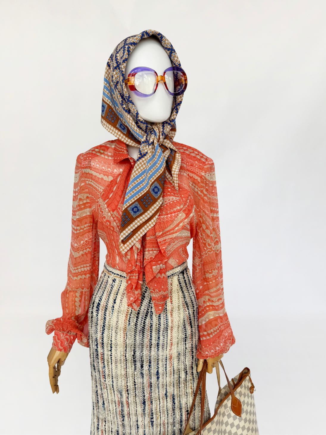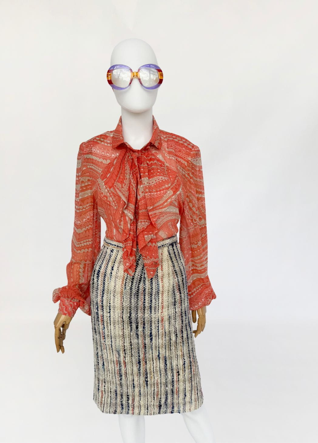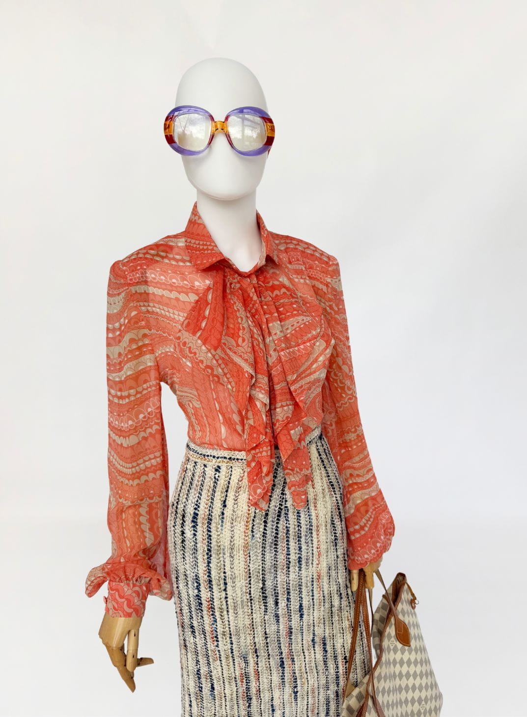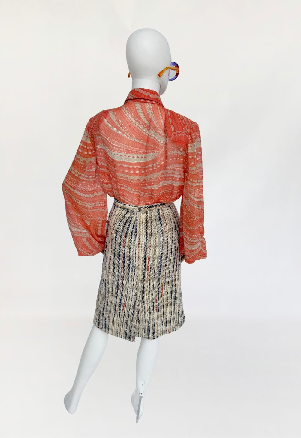 Koszula true vintage w stylu lat 70-tych o przedłużonym fasonie, wykonana z delikatnego jedwabnego szyfonu. Tkanina drukowana w drobny, dekoracyjny deseń w stonowanej palecie kolorystycznej: zgaszona pomarańcza, beż, taupe. Model o klasycznej konstrukcji z długimi, charakterystycznymi dla dekady biskupimi rękawami zakończonymi mankietami. W górnej części wykończony efektownym, wielowarstwowym żabotem o falbaniastej formie. Zapięcie na powlekane jedwabiem guziki pod krytą listwą.