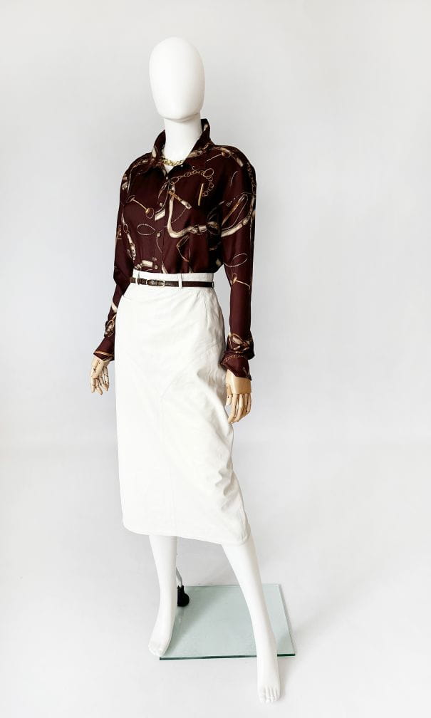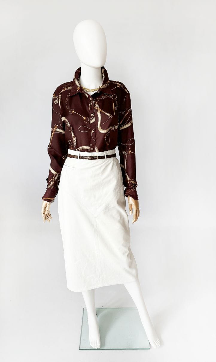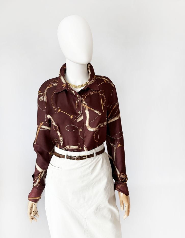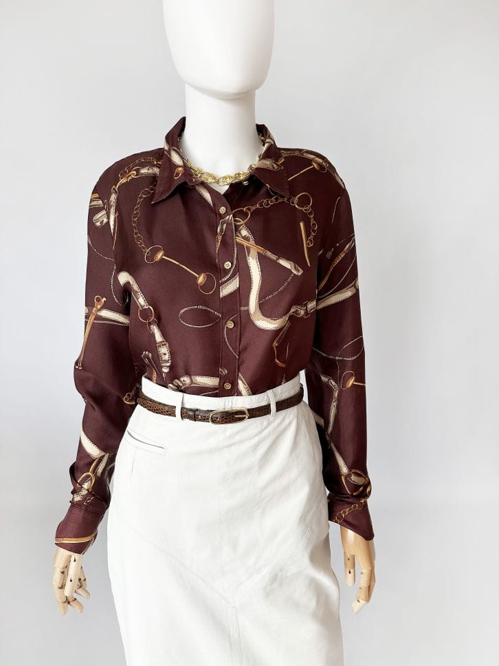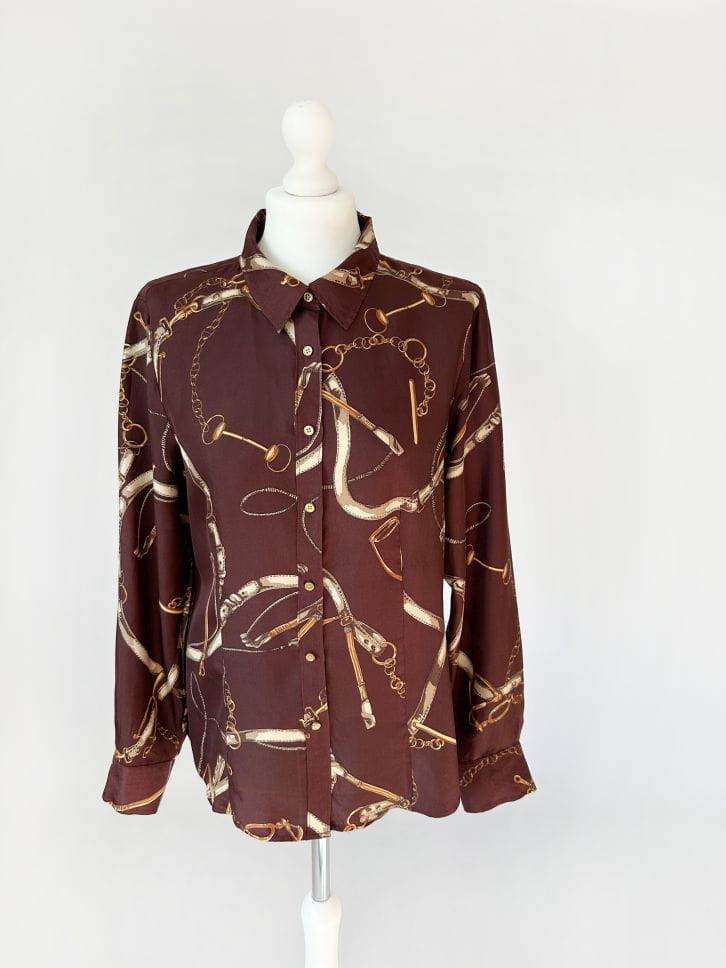 Koszula projektu renomowanej amerykańskiej marki Talbots. Wykonana z jedwabnej tkaniny w ponadczasowe jeździeckie motywy (uprzęże, pasy, łańcuchy). Lekko taliowany fason z niedużym kołnierzem.
