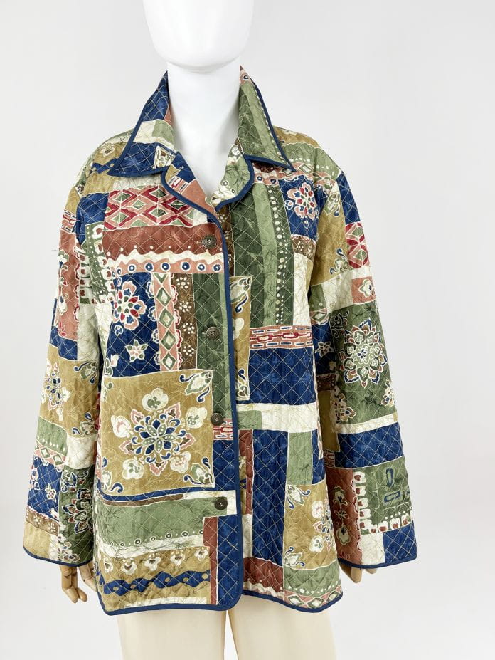 Kolejna w naszej kolekcji, wyjątkowa kurtka marki Alfred Dunner. Wykonana z delikatnej jedwabnej tkaniny o patchworkowym deseniu. Dłuższy, lekko taliowany fason. Drobne przeszycia w karo tworzące wrażenie pikowania tkaniny. Bogaty wzorzysty deseń w pięknych kolorach.