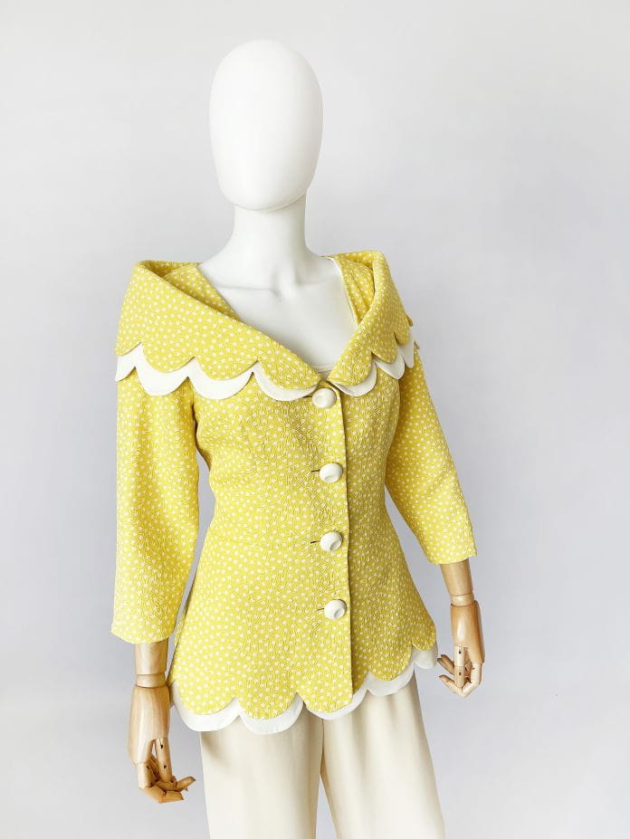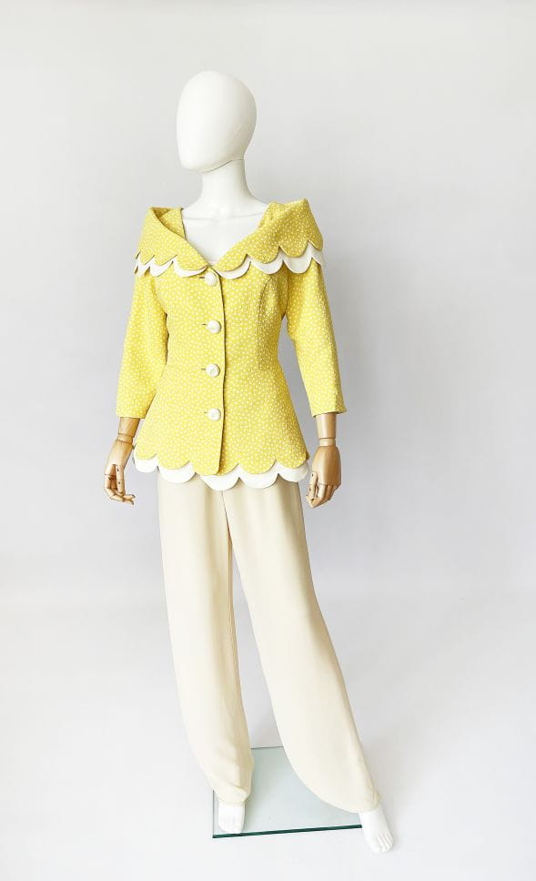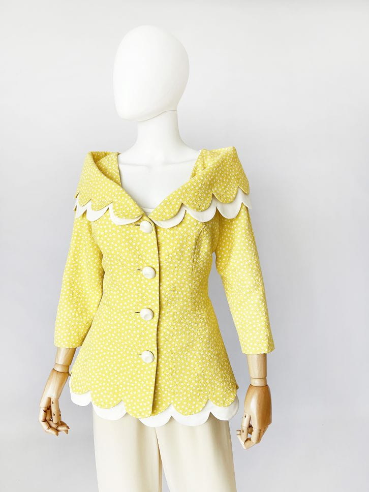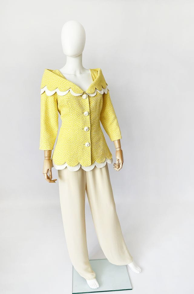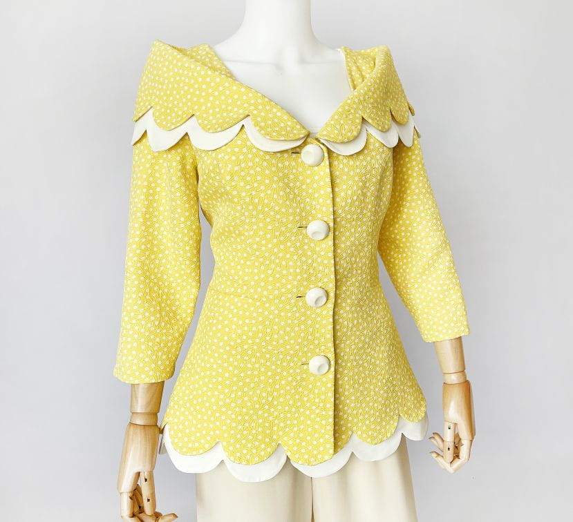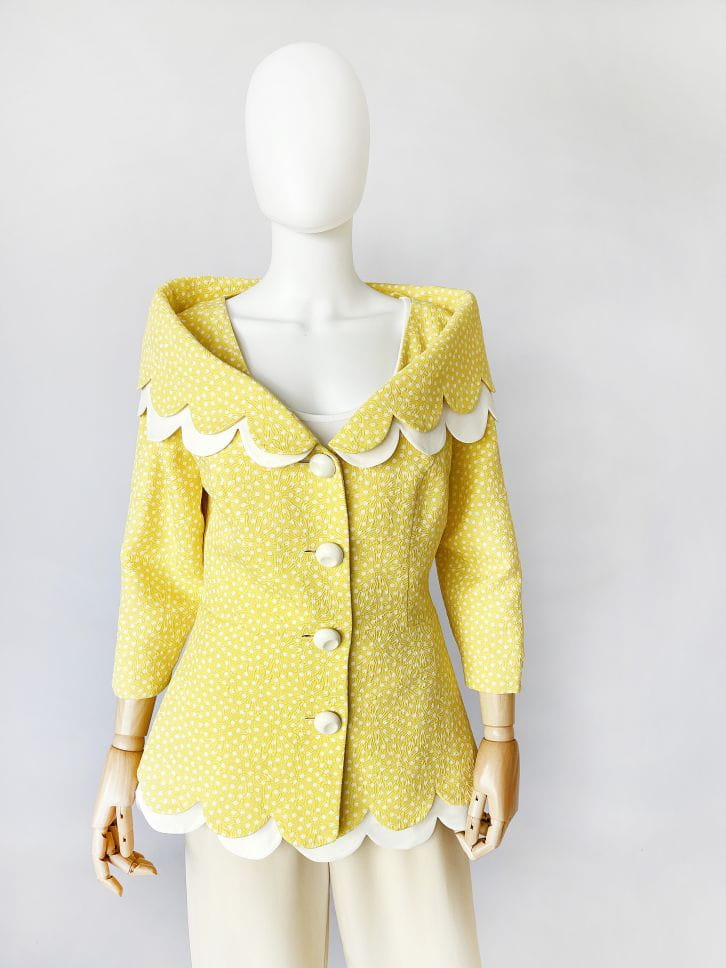 Cudowna, lekka francuska kurtka vintage z lat 80-tych/90-tych, projektu marki Bassant. Wykonana w całości z jedwabiu, tkanina jest mięsista, porządna, o fakturze w wytłaczane dyskretne kwiatowe kontury. Słoneczny żółty odcień w śmietankowe wzory. Taliowany dłuższy fason z rozłożystym dekoltem i sporym kołnierzem, który elegancko spoczywa na ramionach. Spod kołnierza, oraz dołu kurtki, dyskretnie prezentuje się dodatkowa kremowa warstwa o falowanym wykończeniu. Rękawy o długości 2/3. Kurtka jest zapinana na duże kremowe guziki. Wyjątkowy model, który przenosi nas w czasie do lat 60-tych i przywodzi na myśl kreacje Jackie Kennedy.
